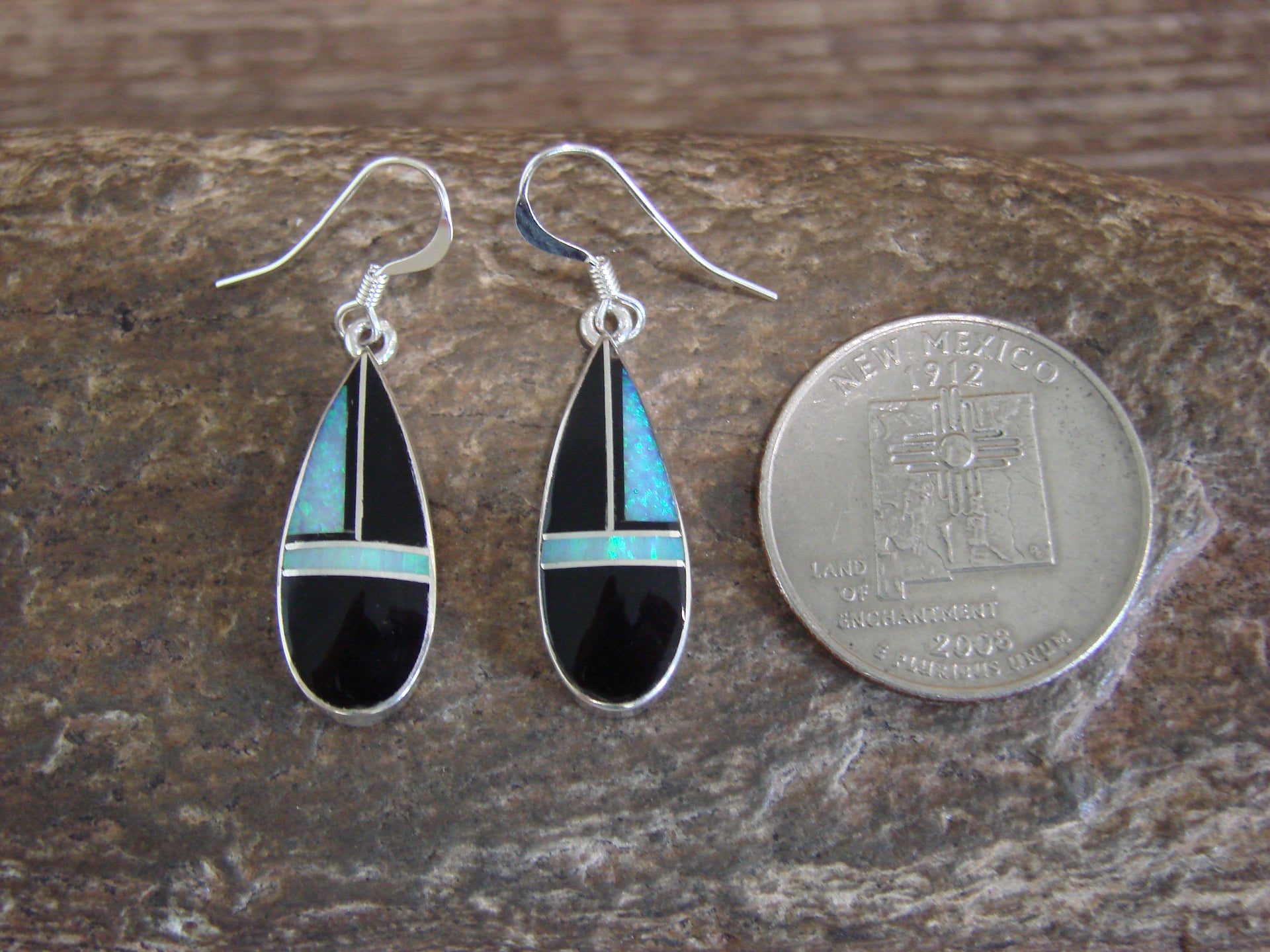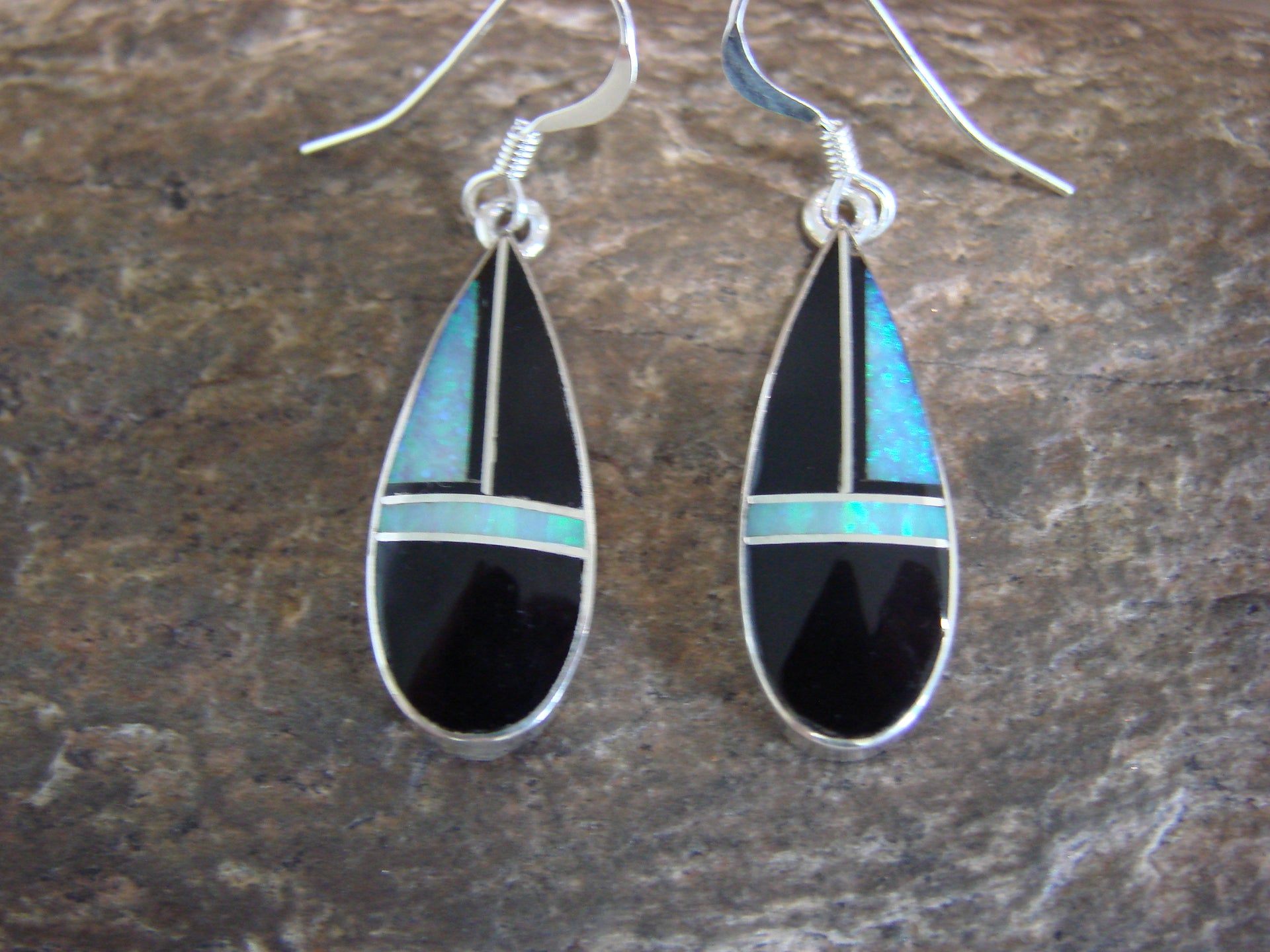 Genuine Native American Navajo Indian Handmade Sterling Silver Onyx & Blue Opal Inlay Dangle Earrings from Western New Mexico. These earrings feature Beautiful Onyx & Lab Opal stones intricately inlaid into a Smooth Sterling Silver dangling. The earrings are polished smooth with a shiny finish. Handmade by Navajo Artist James Manygoats. Signed "JM" and Stamped "Sterling" on the back. Free shipping and gift box included!