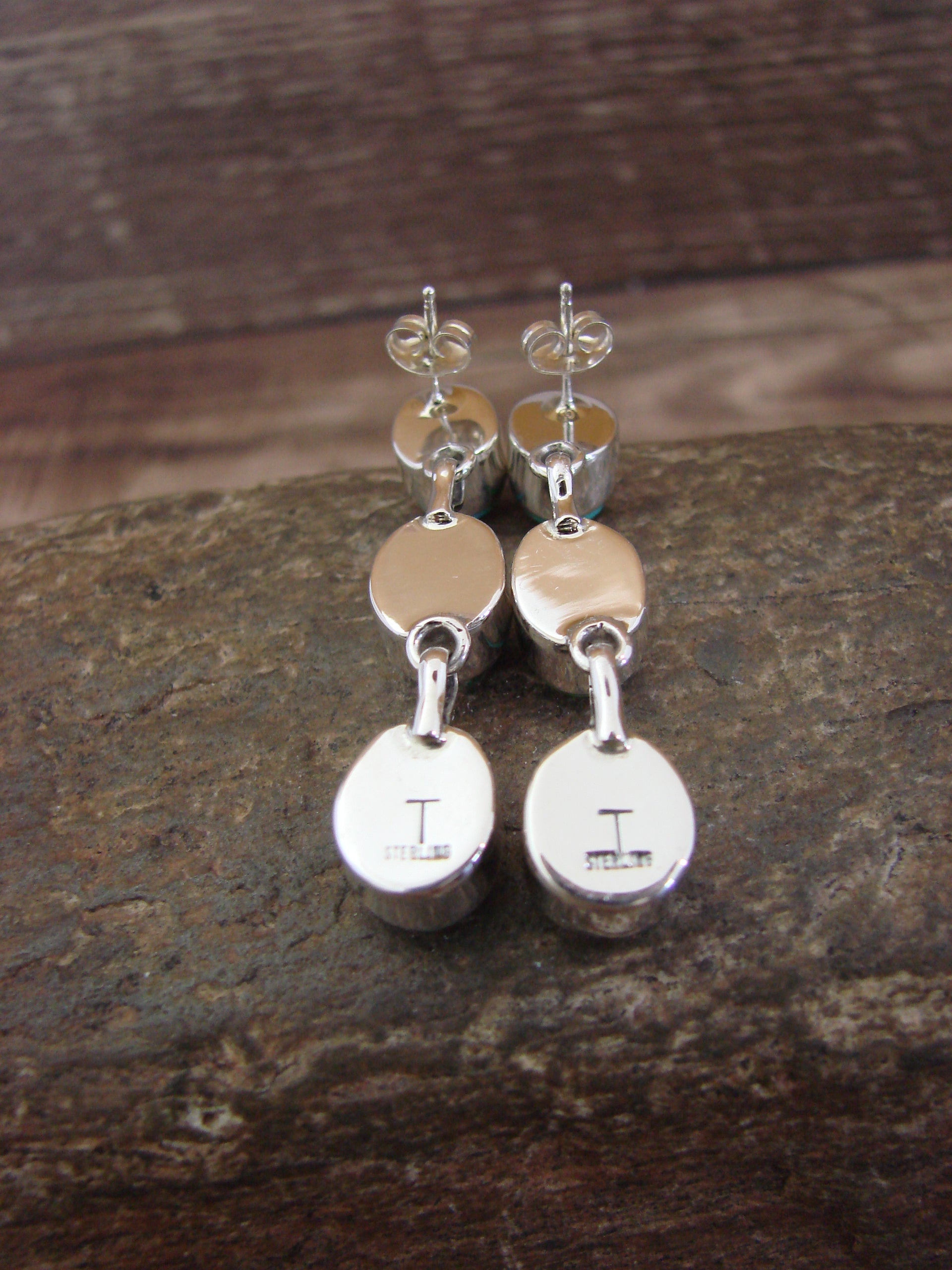 Genuine Native American Navajo Indian Sterling Silver Sonoran Turquoise Post Dangle Earrings from Western New Mexico. These post style earrings feature polished Sonoran Turquoise Stones intricately set into smooth Sterling Silver Bezel settings. This is a Gorgeous pair of Genuine earrings! Navajo Indian hand made and Signed "T" on the back. Stamped "Sterling". Free Gift box and Shipping included!