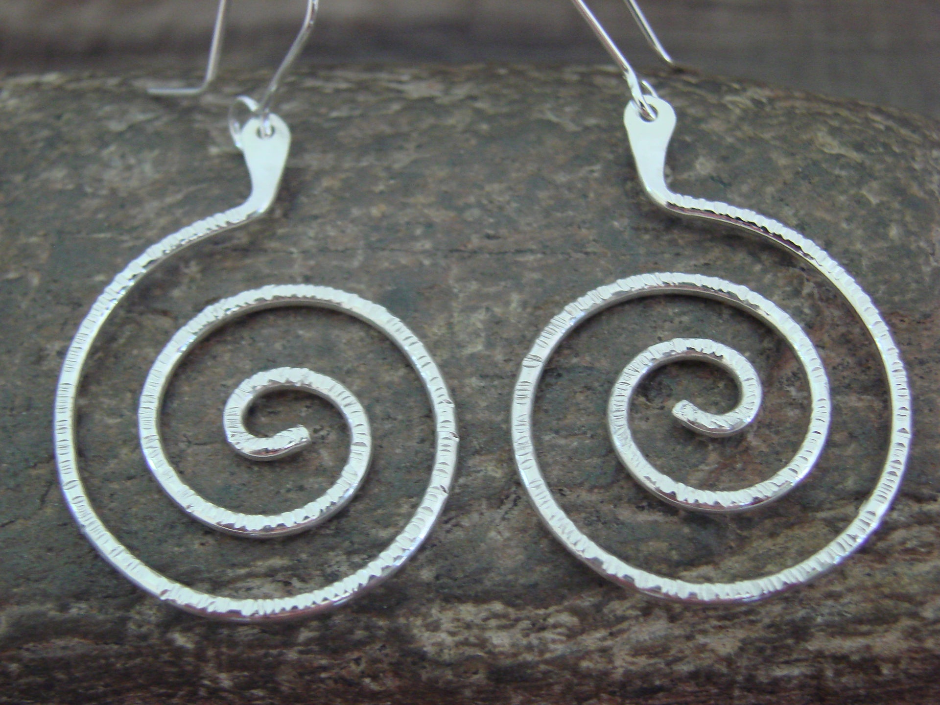 Native American Zuni Indian Sterling Silver Swirl Dangle Earrings from Western New Mexico. These earrings feature beautiful hand stamping and detail throughout. The earrings are polished and have a great look! Zuni Indian hand made by Carlton Jamon. Unsigned. Free shipping and gift box included!