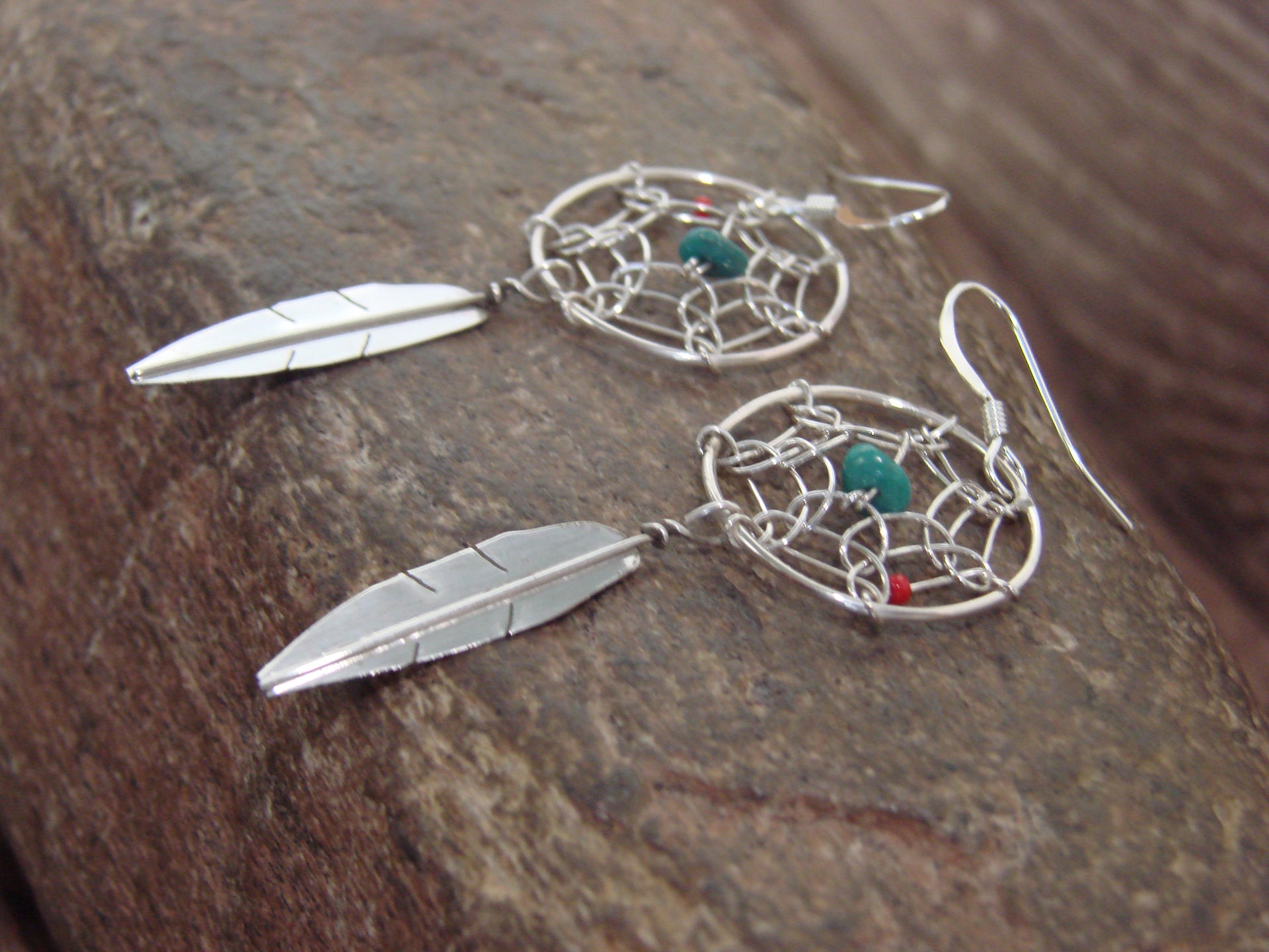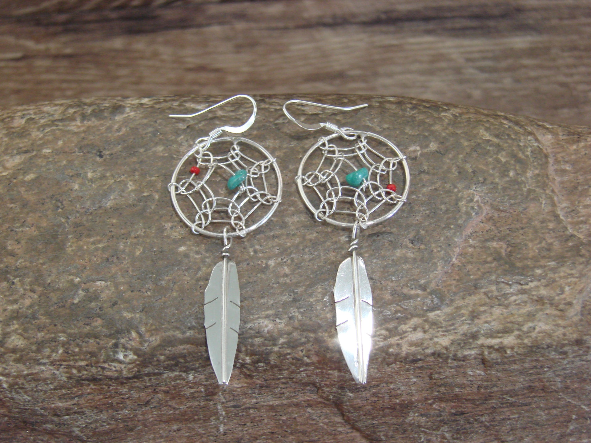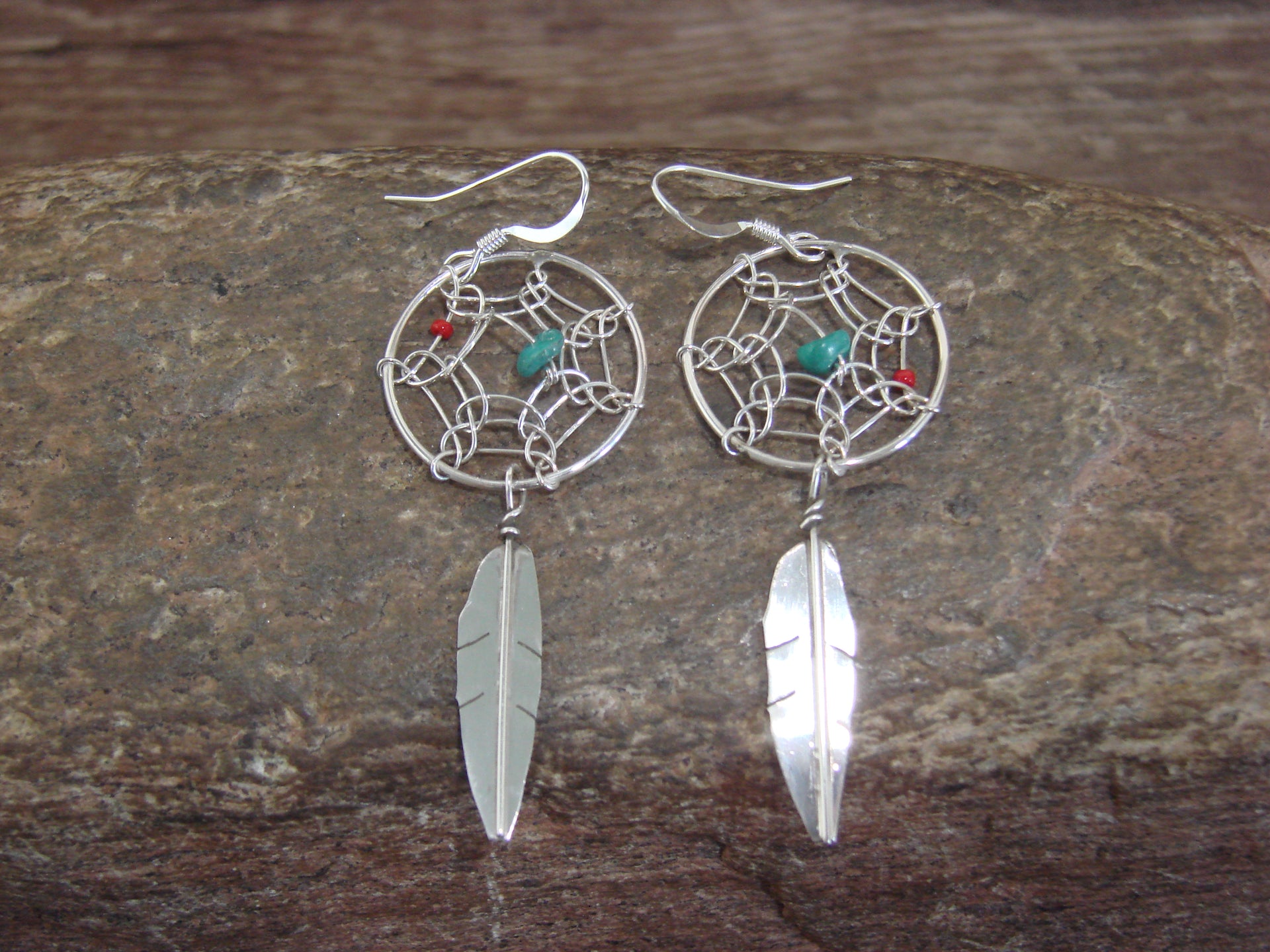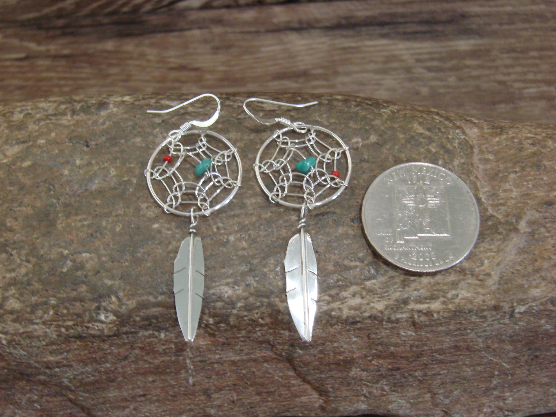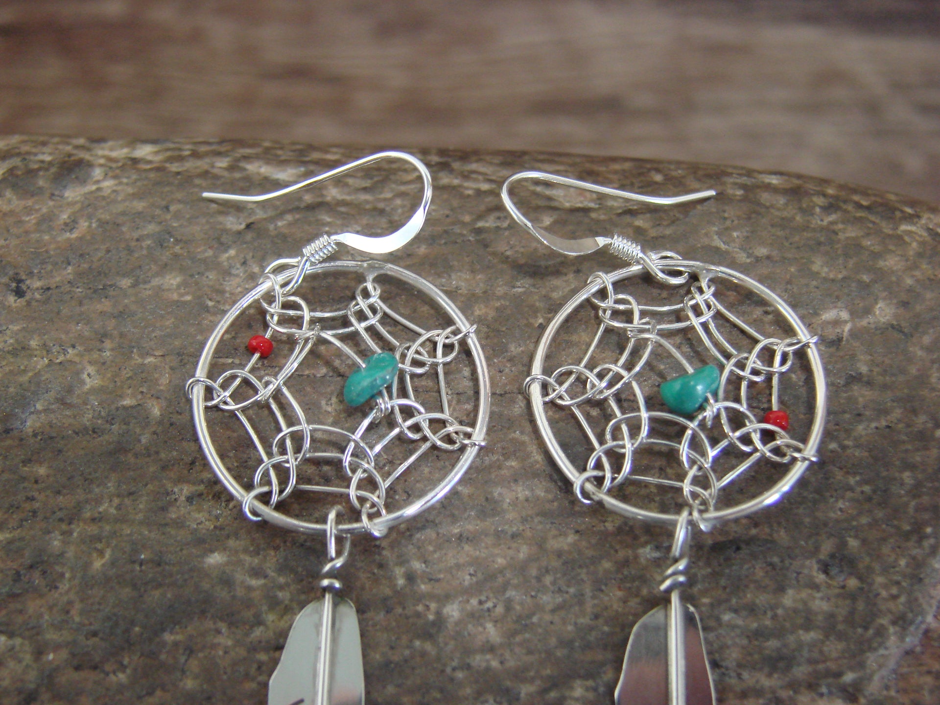 - Native American Sterling Silver Turquoise & Coral Dream Catcher Dangle Earrings - Arviso