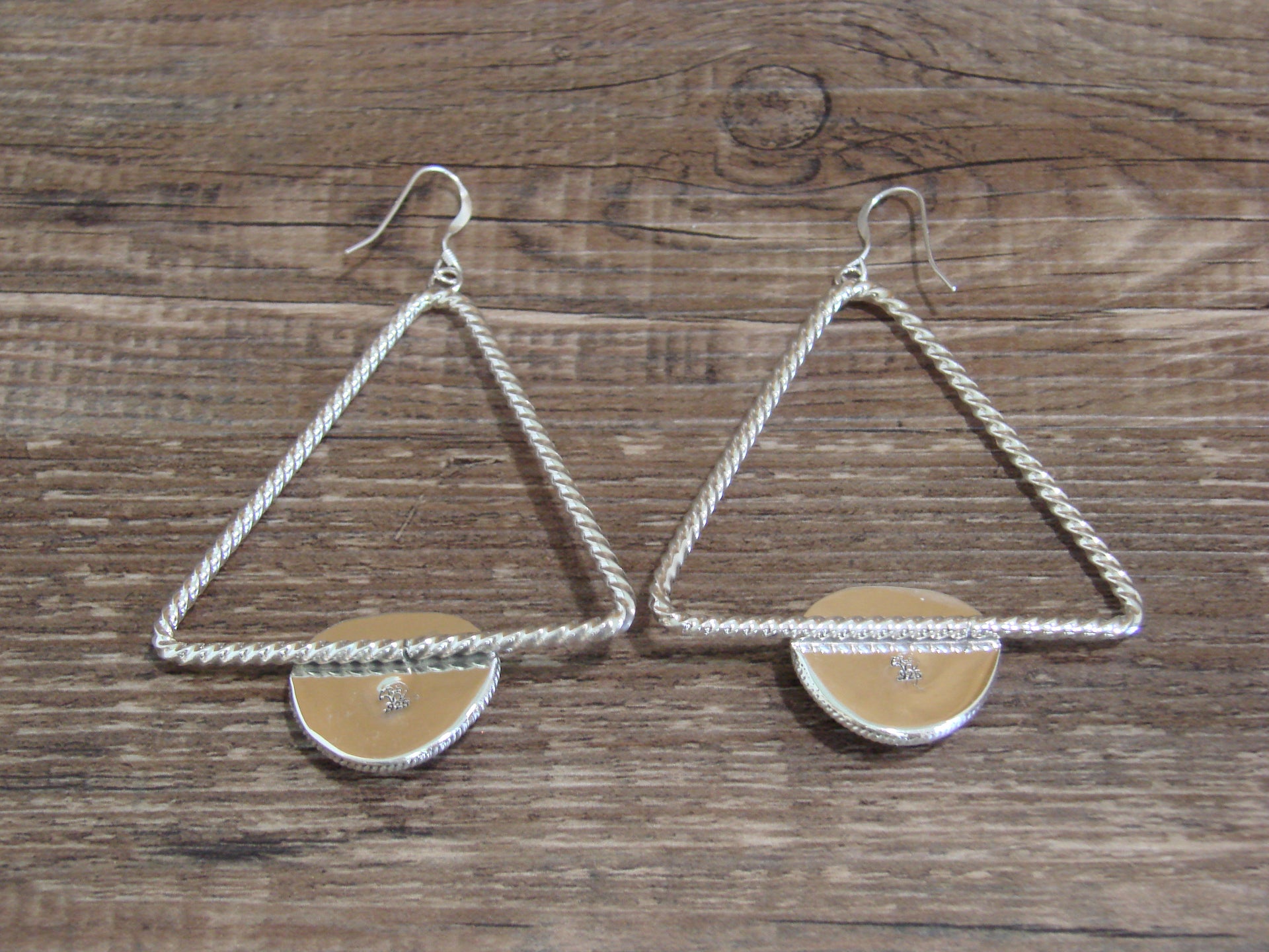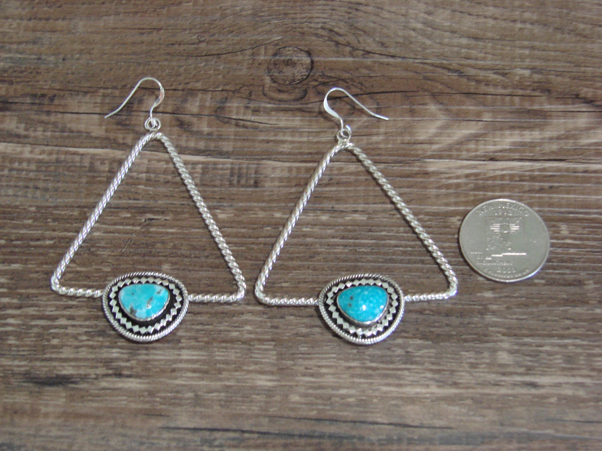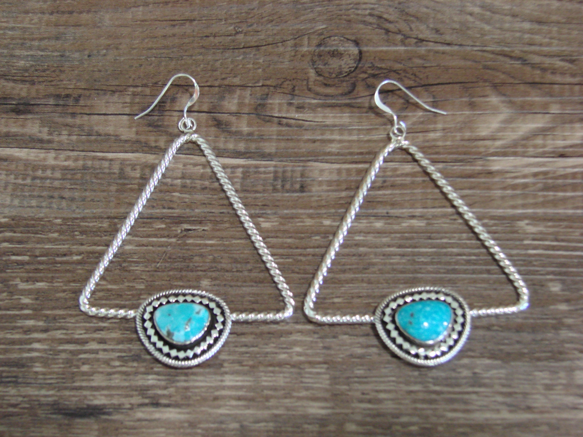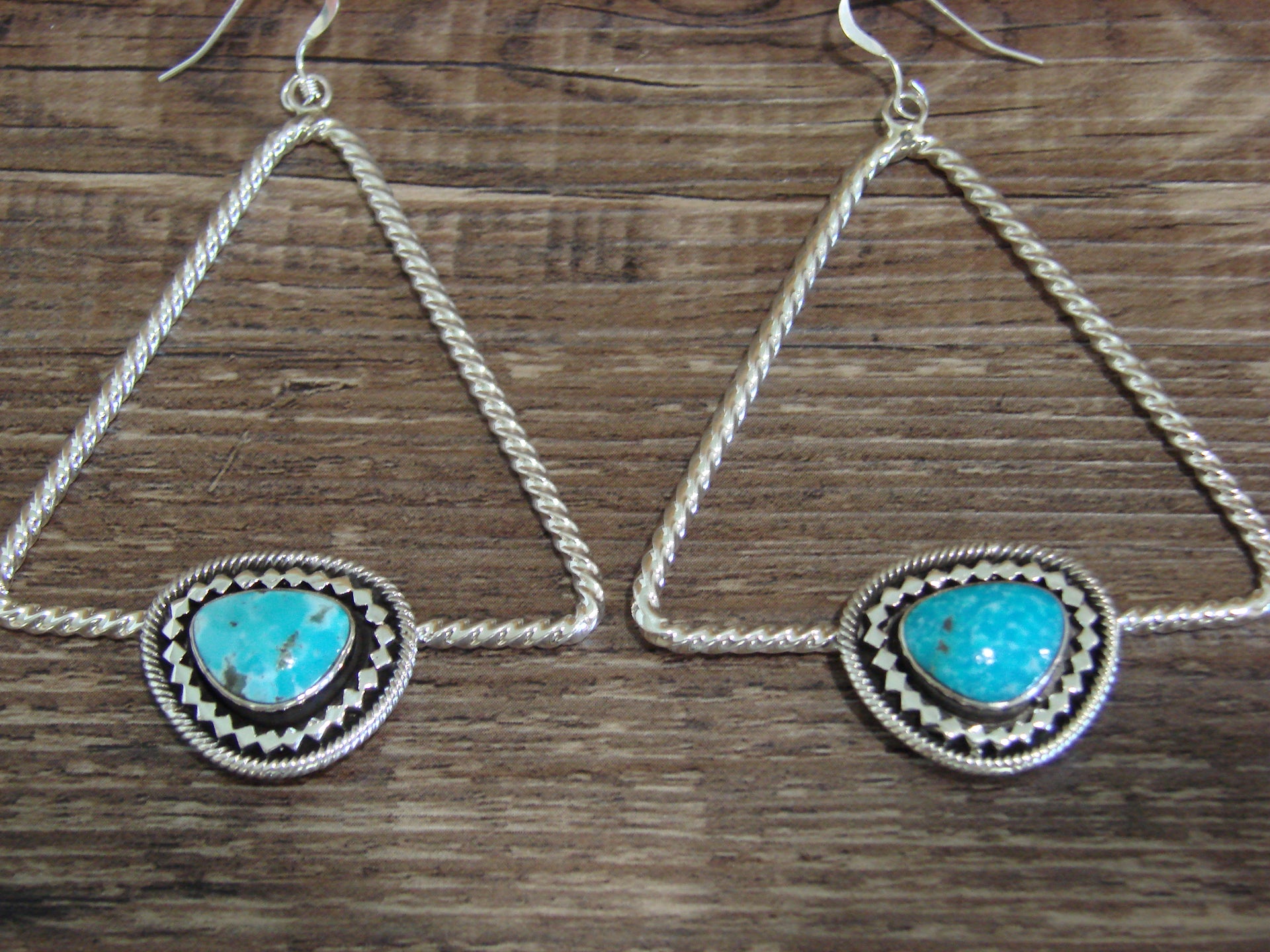 Genuine Native American Navajo Indian Sterling Silver & Turquoise Triangular Dangle Earrings from Western New Mexico. These Beautiful earrings feature Genuine Turquoise stones set into beautiful smooth sterling silver bezel settings. The Stones are surrounded by Stunning details in Sterling Silver! Navajo Indian handmade by Sheena Jack. Hallmarked on the back. Free shipping and gift box included!