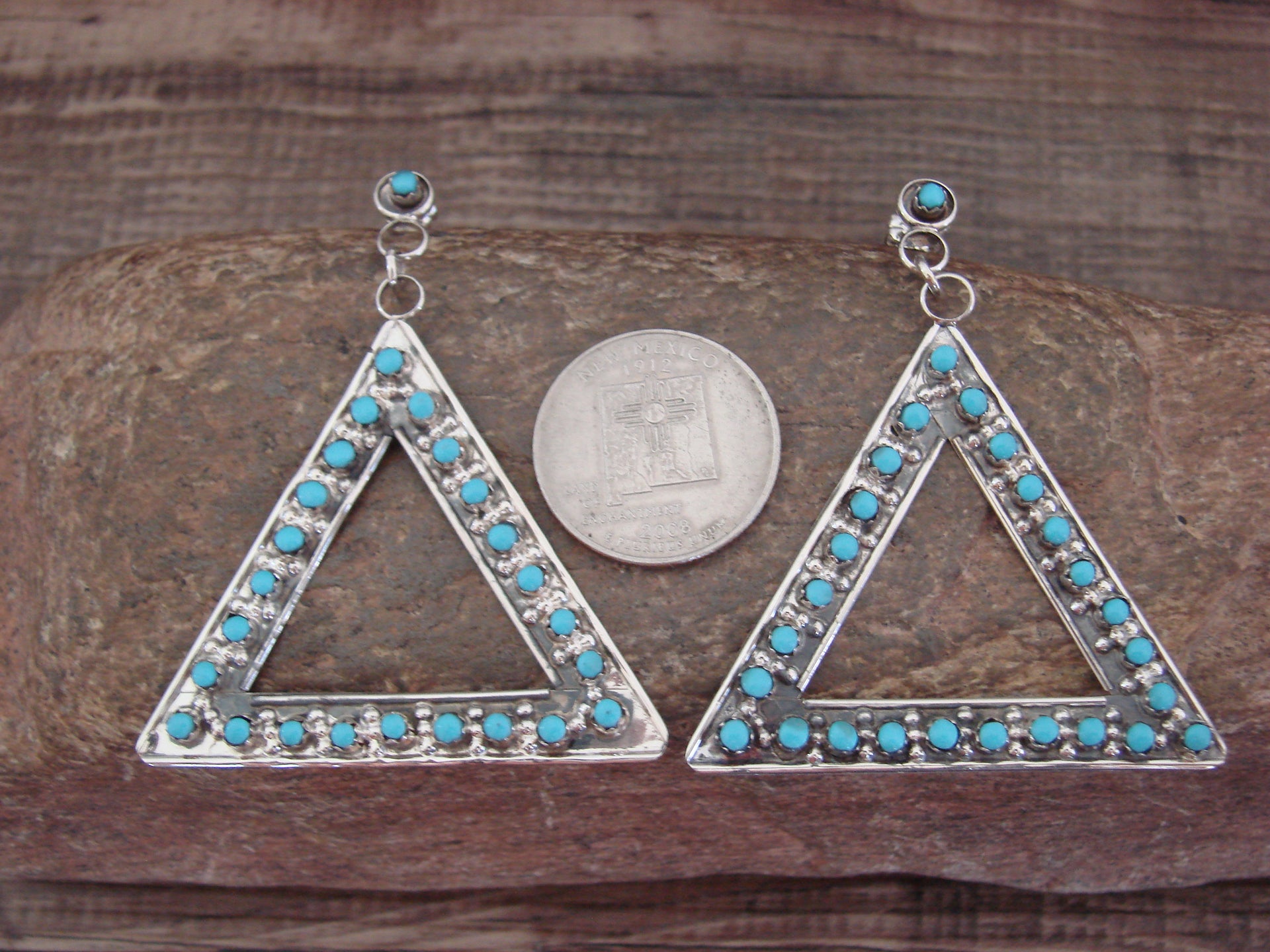 Genuine Native American Zuni Indian Sterling Silver & Turquoise Post Dangle Earrings from Western New Mexico. These post style earrings feature genuine Turquoise stones beautifully set into shadowbox crown sterling silver bezel settings. Beautiful details in Sterling Silver surround the stones. This is a Stunning pair of earrings! Zuni Indian handmade to Perfection by Marlon Quam. Unsigned. Free shipping with a gift box included!