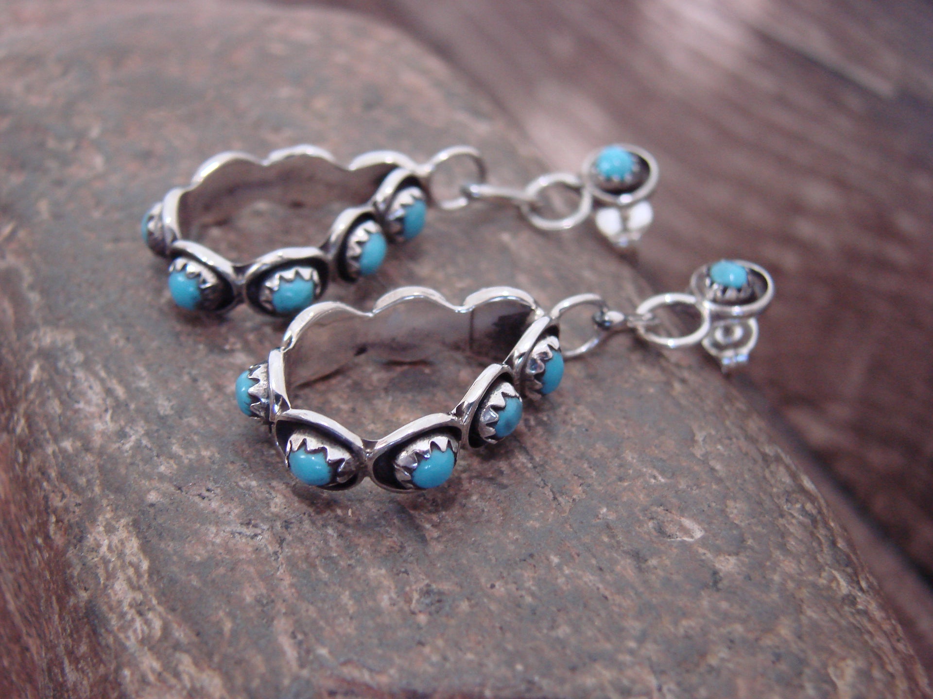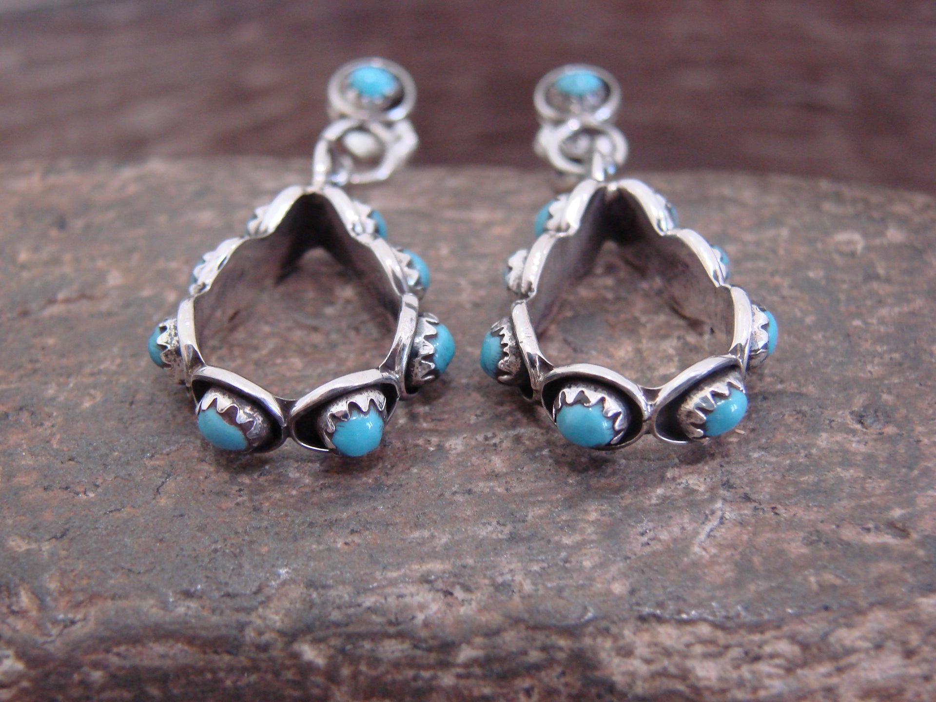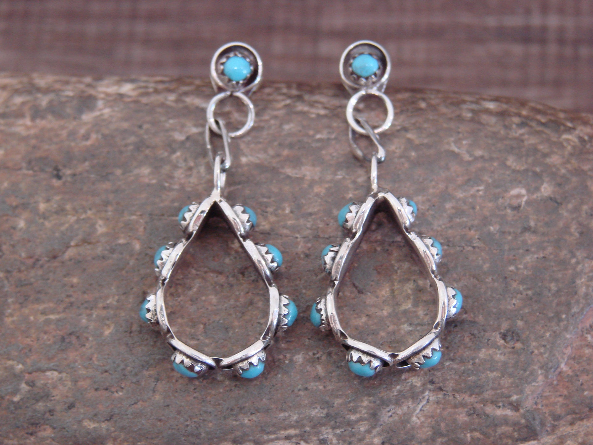 Genuine Native American Zuni Indian Sterling Silver & Turquoise Post Dangle Earrings from Western New Mexico. These post style earrings feature genuine Turquoise stones beautifully set into shadowbox crown sterling silver bezel settings. Beautiful details in Sterling Silver surround the stones. This is a Stunning pair of earrings! Zuni Indian handmade to Perfection by Marlon Quam. Unsigned. Free shipping with a gift box included!