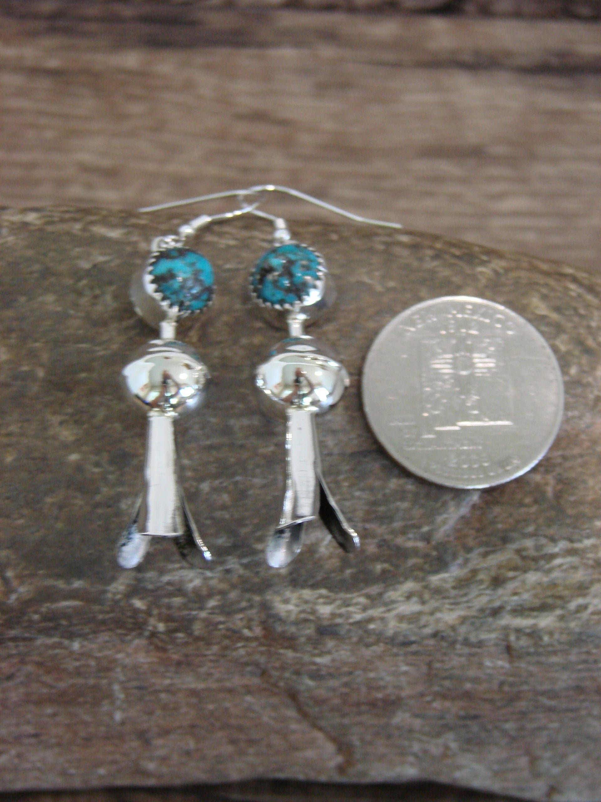 Genuine Native American Navajo Indian Turquoise Squash Blossom Dangle Earrings from Western New Mexico. These Stunning earrings feature Turquoise stones set into beautiful Crown Sterling Silver Squash Blossom settings. This is a beautiful pair of earrings! Navajo Indian hand made by Emily Tsosie. These are Stamped "Sterling" on the back. Free gift box and shipping included!
