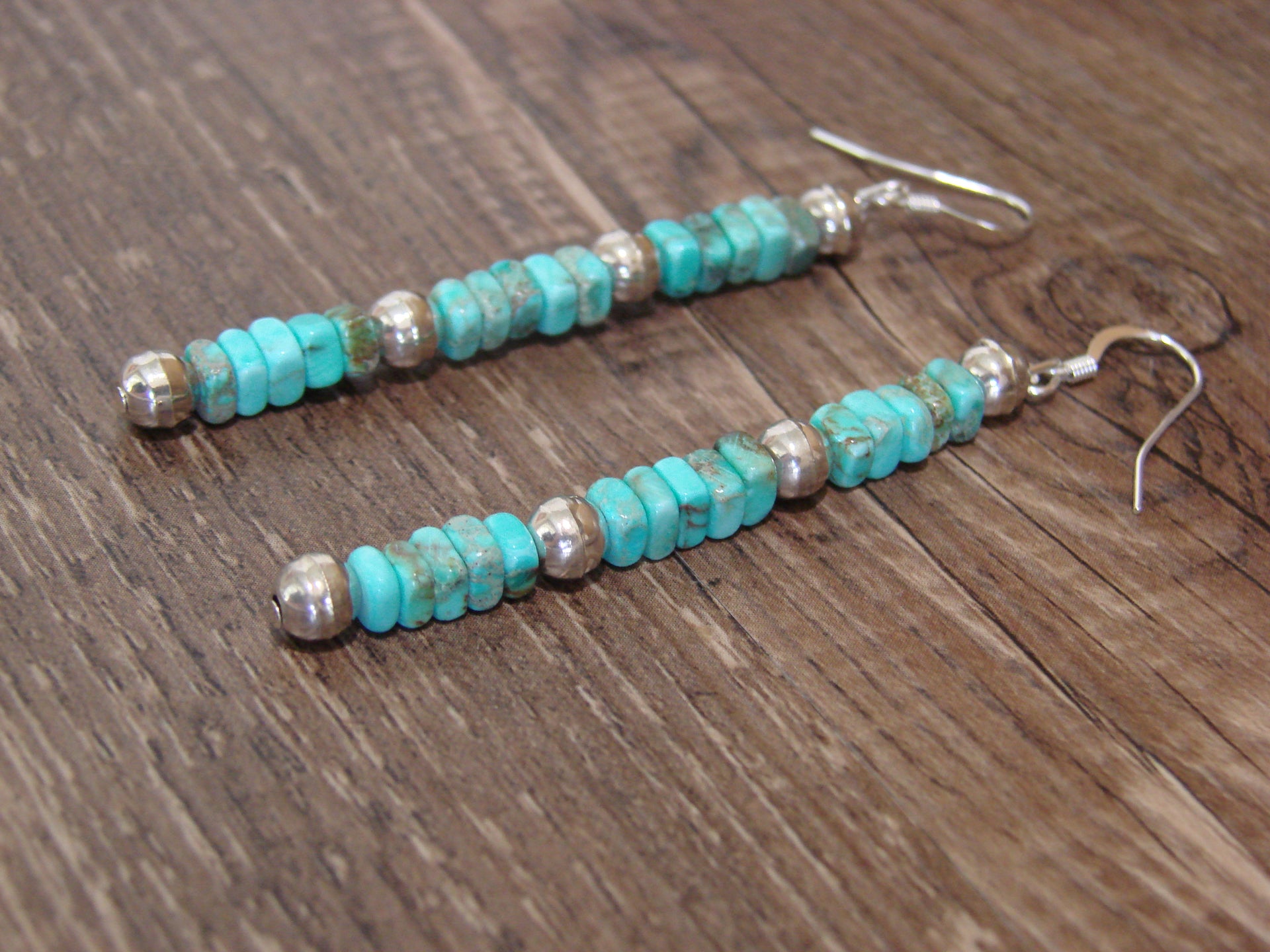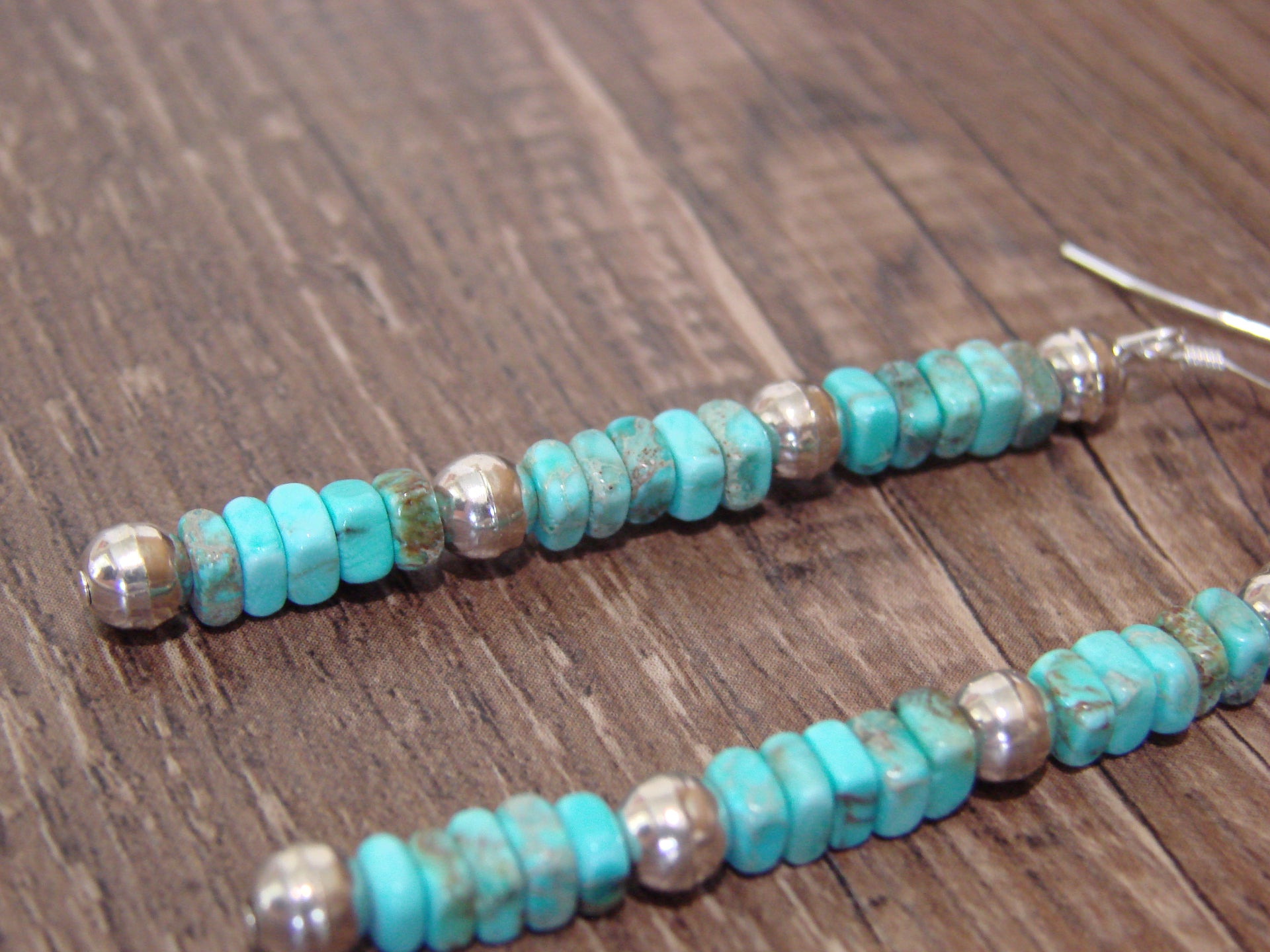 Genuine Native American Navajo Indian Sterling Silver & Turquoise Navajo Pearl Hand Beaded Dangle Earrings from Western New Mexico. These Gorgeous dangle earrings feature beautiful, Genuine Square Turquoise Stones and 4mm Sterling Silver Navajo Pearls. The Stones are hand strung and have a Stunning look! Hand strung by Navajo Indian artist Doreen Jake. Free Shipping and Gift Box included!