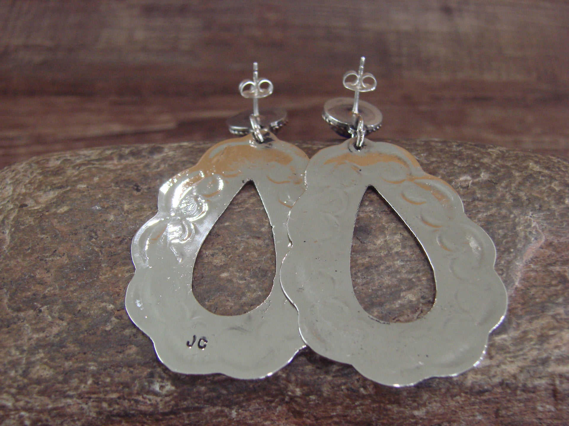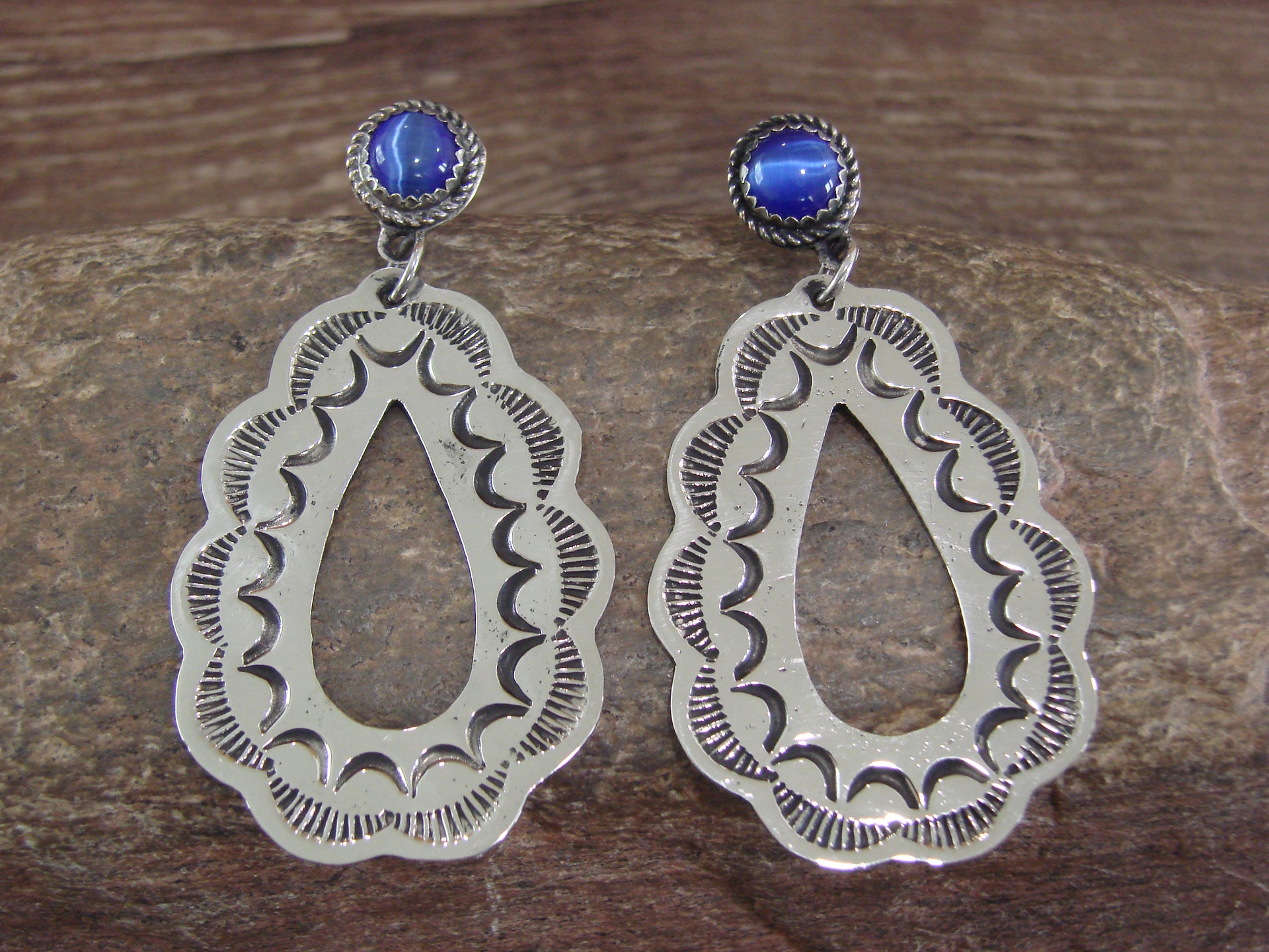 Native American Navajo Indian Nickel Silver Hand Stamped Nickel Silver Blue Marble Post Dangle Earrings from Western New Mexico. This is a great looking pair of Post Dangle earrings. These Nickel Silver earrings feature Man Made Blue Marble posts accented with Stunning hand stamped Nickel Silver dangles. Handmade by well known Navajo Silversmith Jackie Cleveland. Signed "JC" on the back. Free Shipping with a Gift Box included!