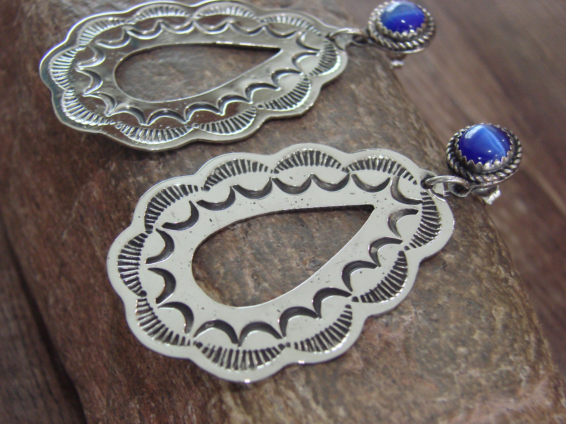 - Navajo Indian Nickel Silver & Blue Marble Dangle Post Earrings - Cleveland