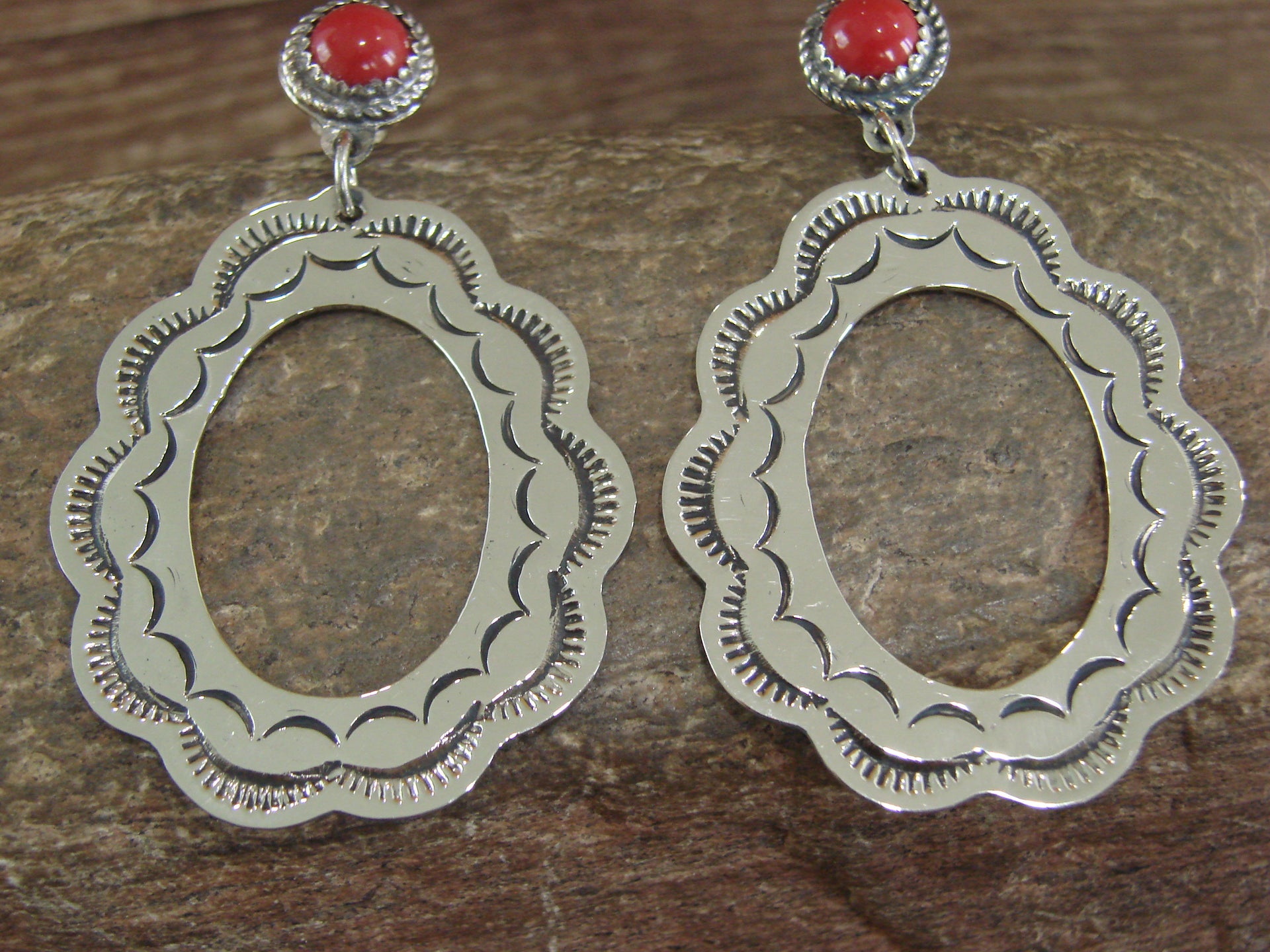 Navajo Indian Nickel Silver & Coral Dangle Post Earrings - Cleveland
