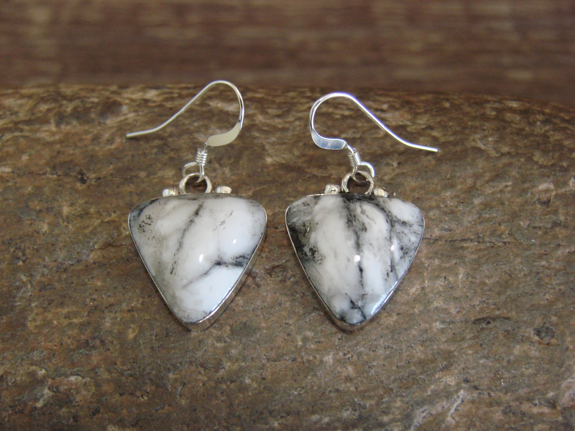 Native American Navajo Indian Sterling Silver & White Buffalo Turquoise Dangle Earrings from Western New Mexico. These beautifully crafted earrings feature a Genuine White Buffalo Turquoise stone that has been set into a smooth Sterling Silver bezel setting. This is a wonderful pair of dangle earrings polished to a bright finish! Fine Navajo Silversmith workmanship quality makes these earrings a beautiful hand made masterpiece. Navajo Indian handmade by David Lopez. Hallmarked and stamped "Sterling" on the back. Free shipping and gift box included!