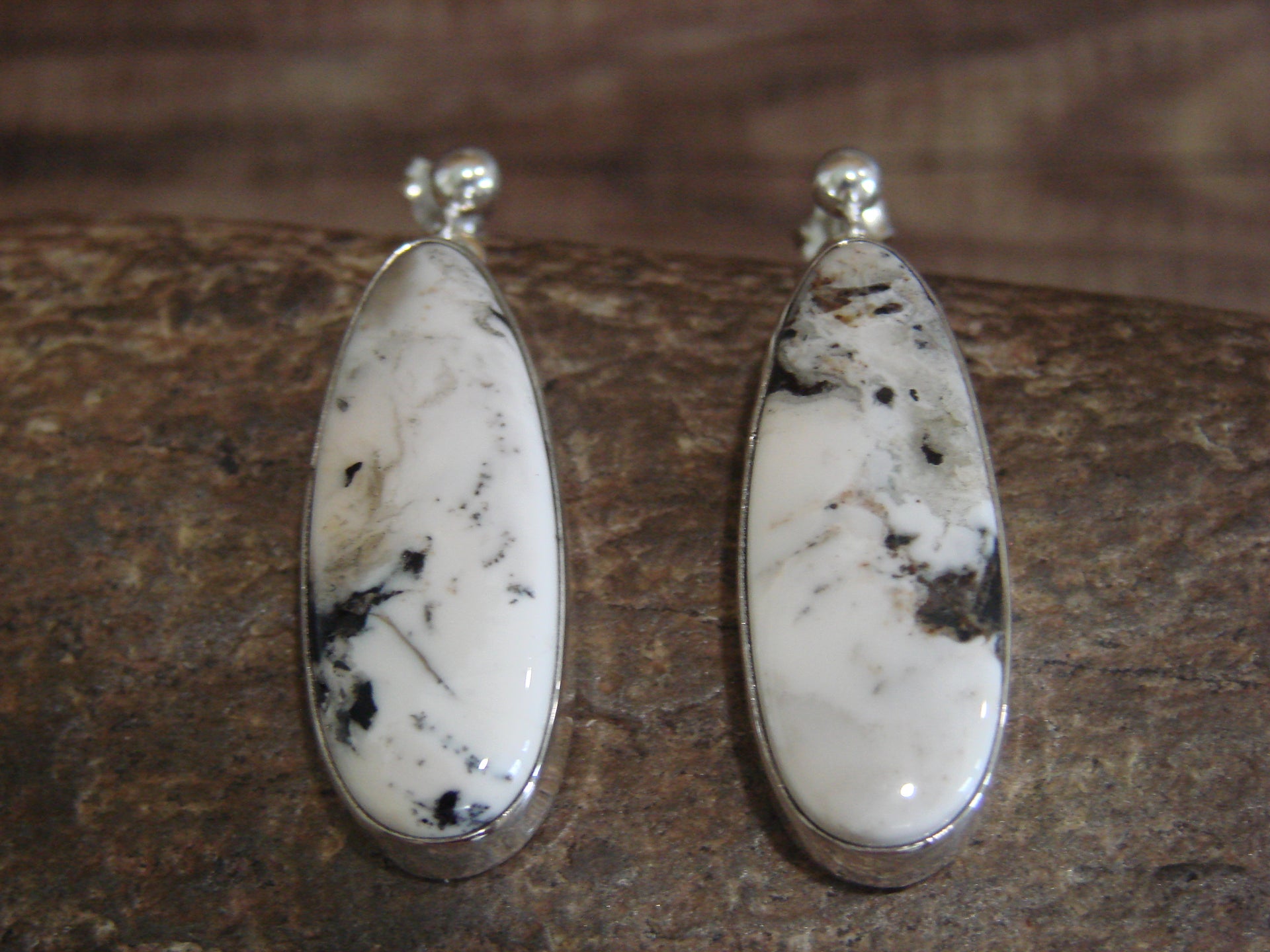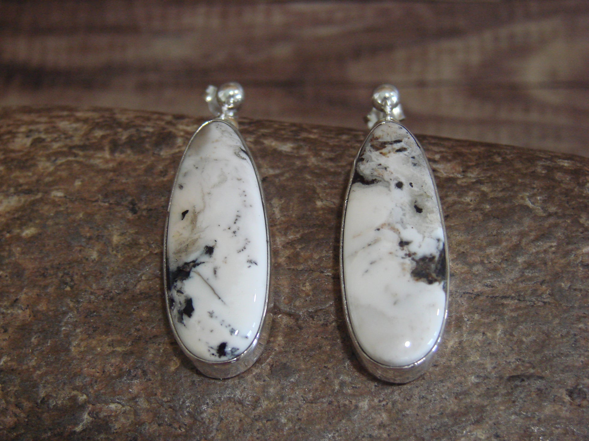 Genuine Native American Navajo Indian Sterling Silver & White Buffalo Turquoise Post Dangle Earrings from Western New Mexico. These post earrings feature genuine White Buffalo Turquoise stones set into smooth sterling silver bezel settings dangling below a Sterling Silver Drop. Navajo Indian hand made, signed "A", and stamped "Sterling" on the back. Free shipping and gift box included!