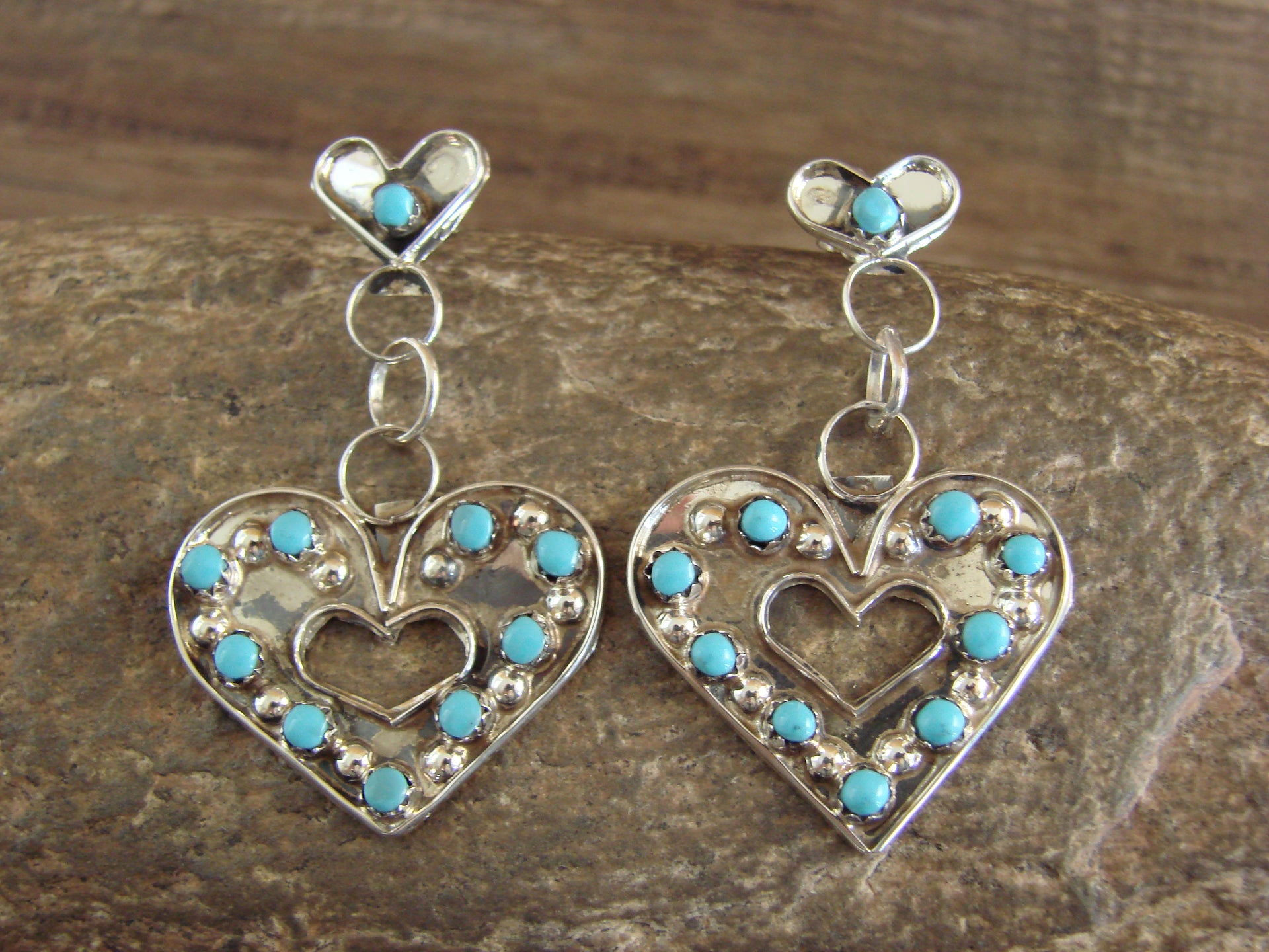 - Zuni Indian Sterling Silver Turquoise Heart Post Dangle Earrings by Quam