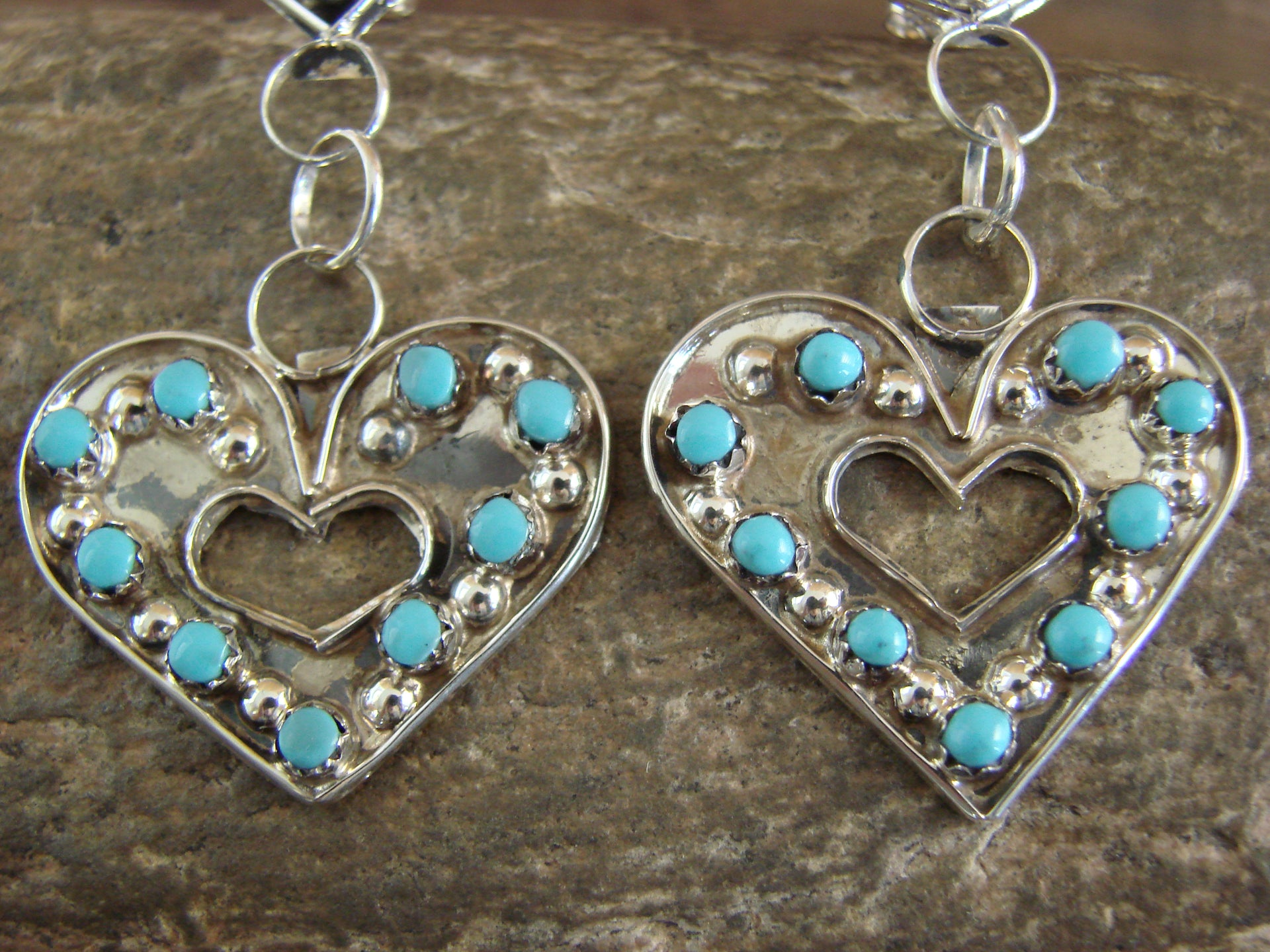Native American Zuni Indian Turquoise Heart Post Dangle Earrings from Western New Mexico. These Stunning earrings feature Turquoise stones intricately set into beautiful, crown, sterling silver bezel settings. The sterling silver work surrounding the earrings is very nicely detailed! Zuni Indian handmade by Marlon Quam. Unsigned. Free Shipping and Gift Box included!