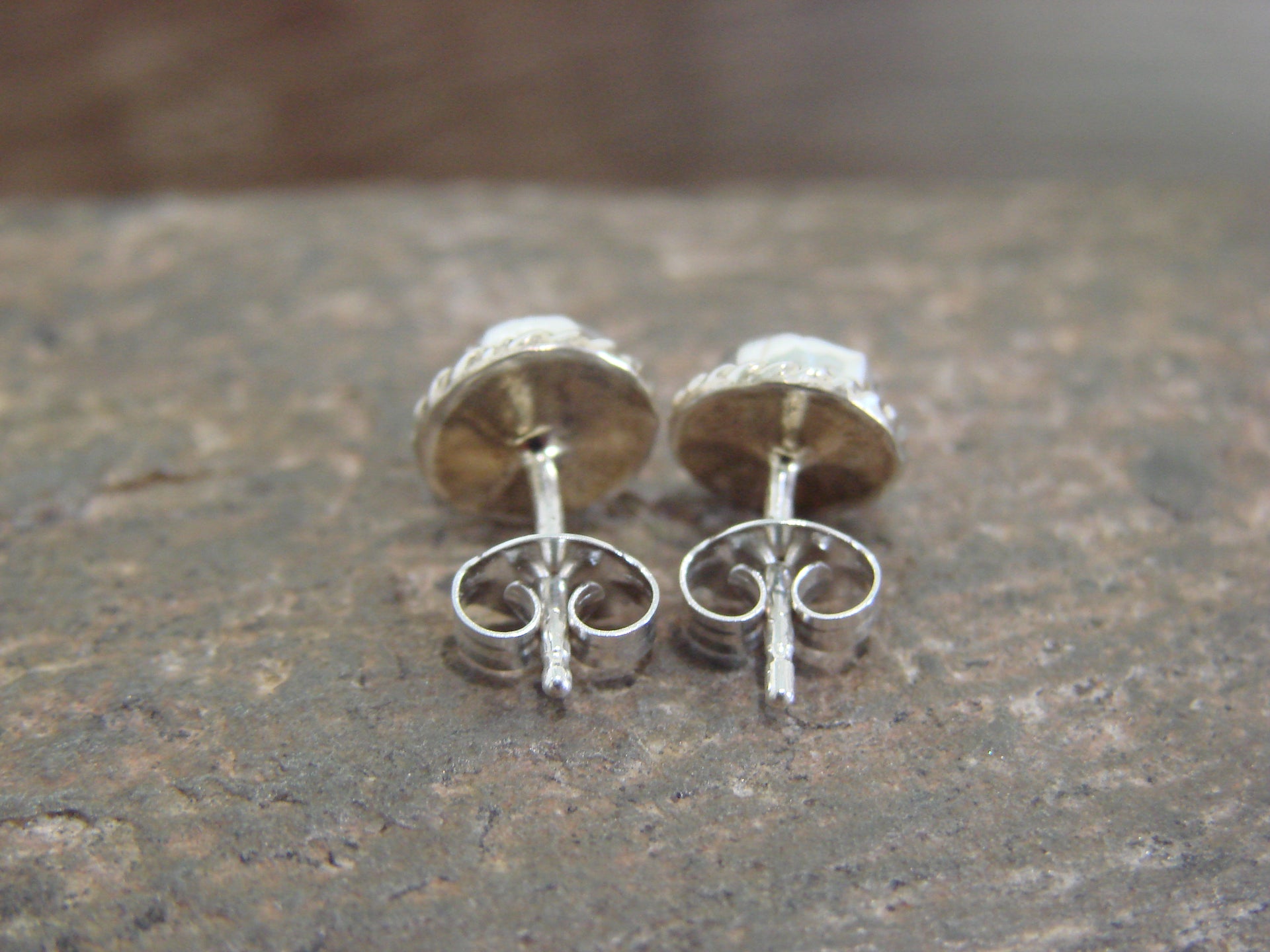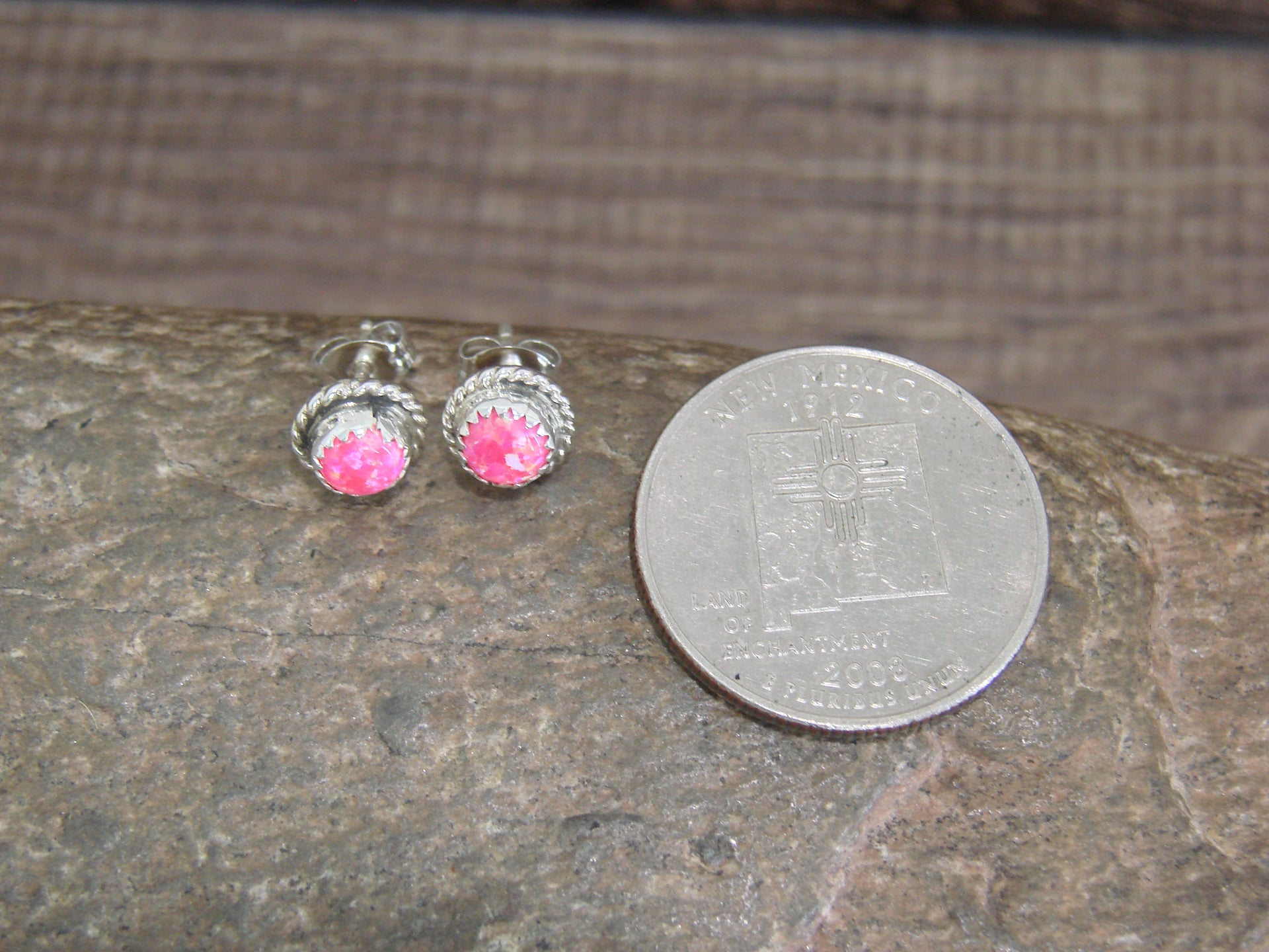 Native American Navajo Indian Pink Opal Stud Post Earrings from Western New Mexico. These beautiful 1/4" Round earrings feature Pink Opal stones set into beautiful crown sterling silver bezel settings. The sterling silver work surrounding the earrings is very nicely detailed and polished to a finish! Navajo Indian handmade by Esther White. The back is unsigned due to the size being to small. Free Shipping and Gift Box included!