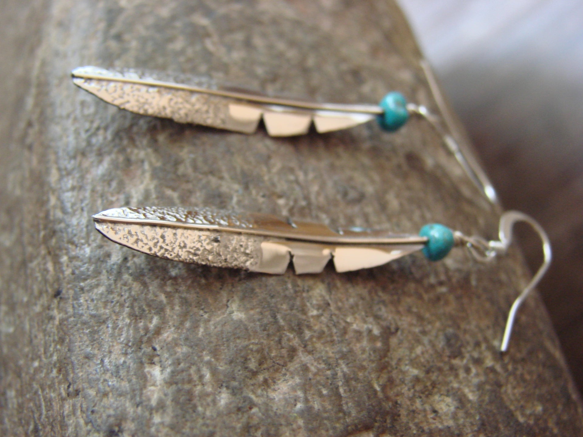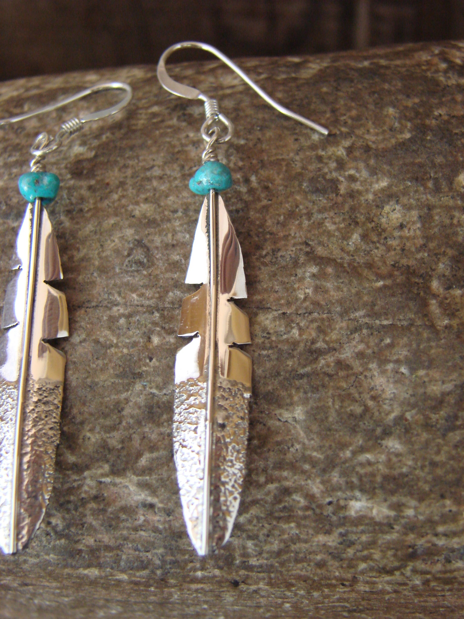 Genuine Native American Navajo Indian Sterling Silver & Turquoise Feather Dangle Earrings from Western New Mexico. These earrings feature beautiful hand stamping and detail throughout. The Sterling Silver is nicely cut into a feather and polished. This is a great pair of earrings! Free gift box included! Navajo Indian handmade by Marvin Arviso. These are Unsigned. Free shipping and gift box included!