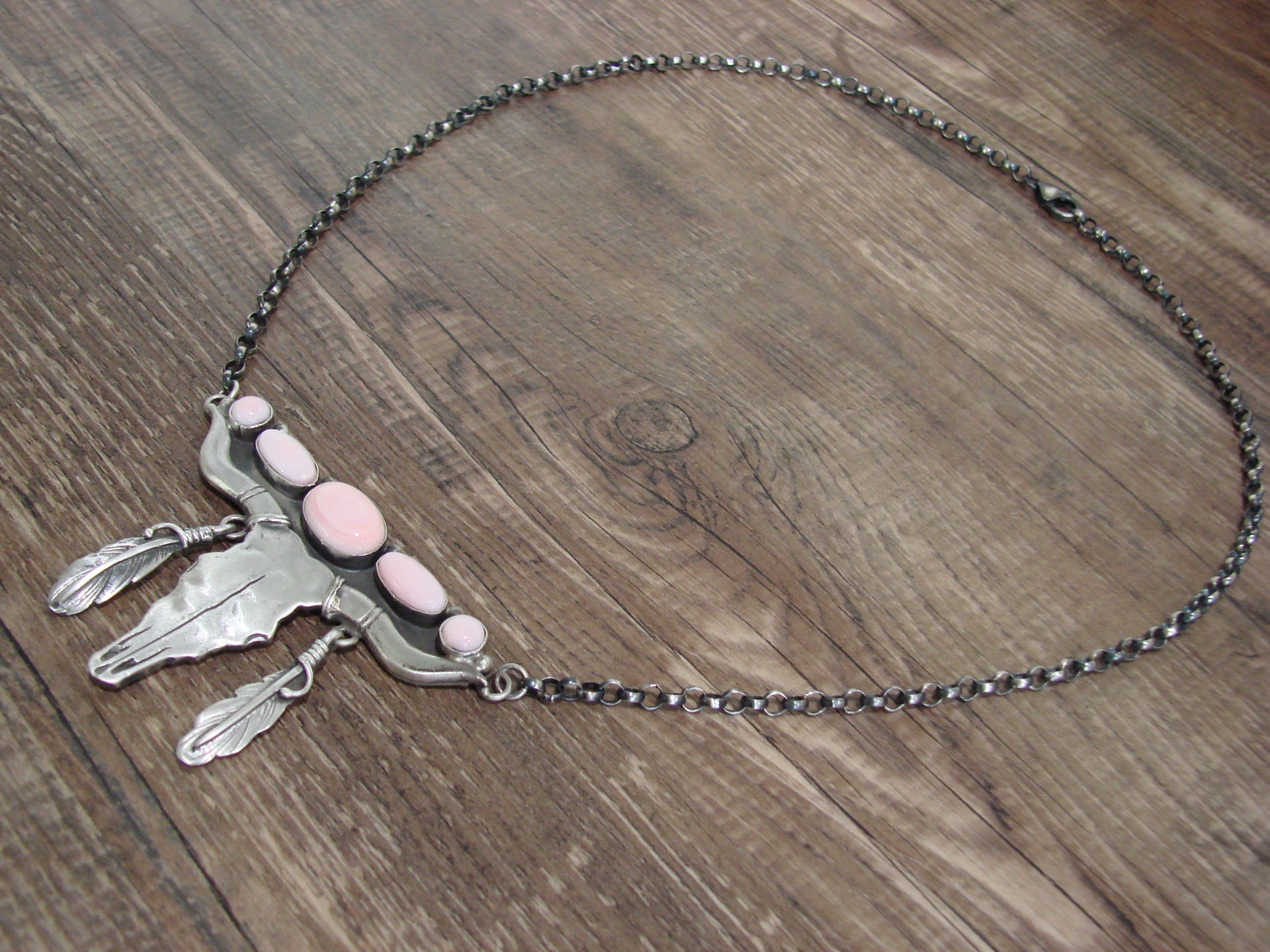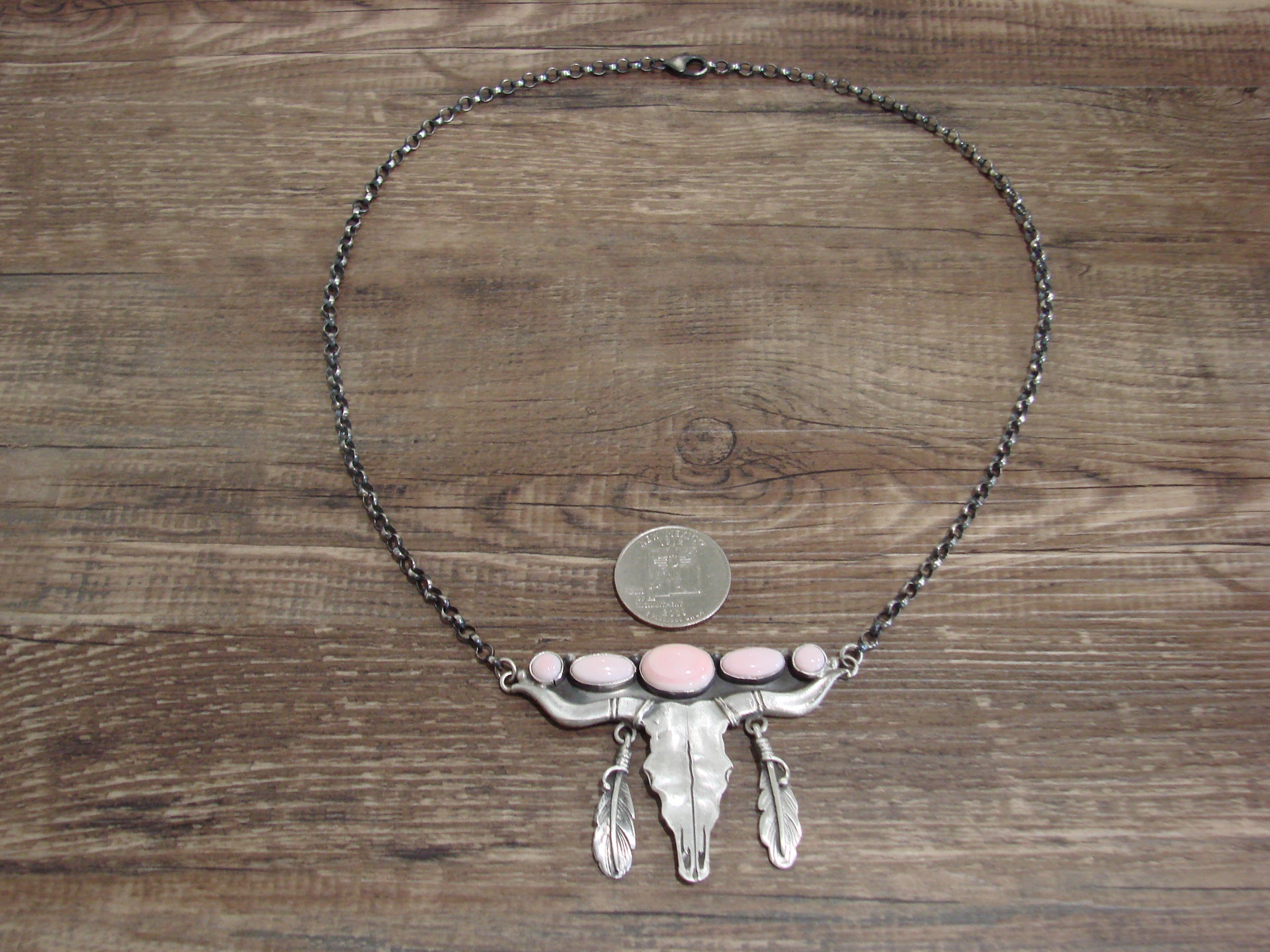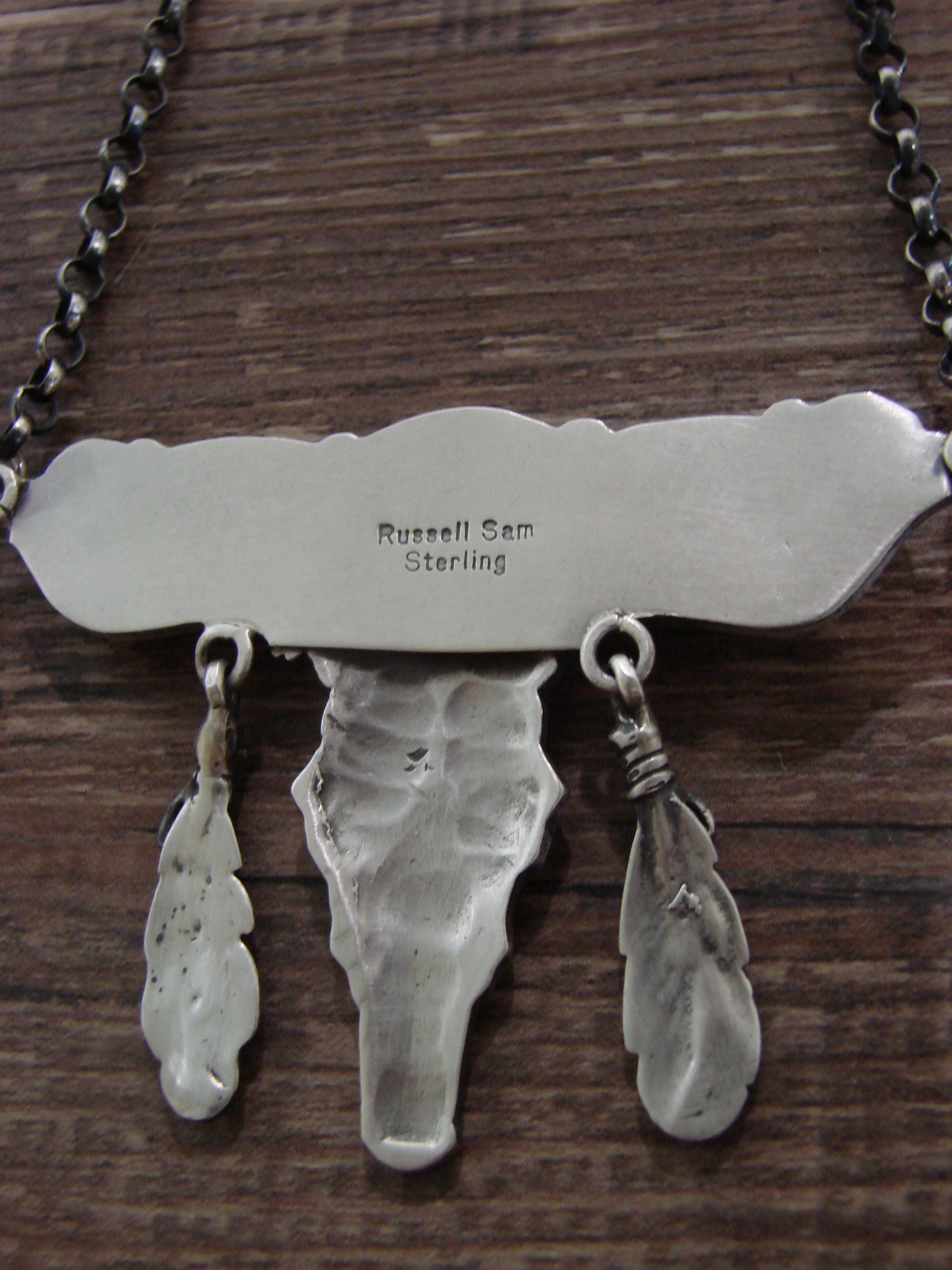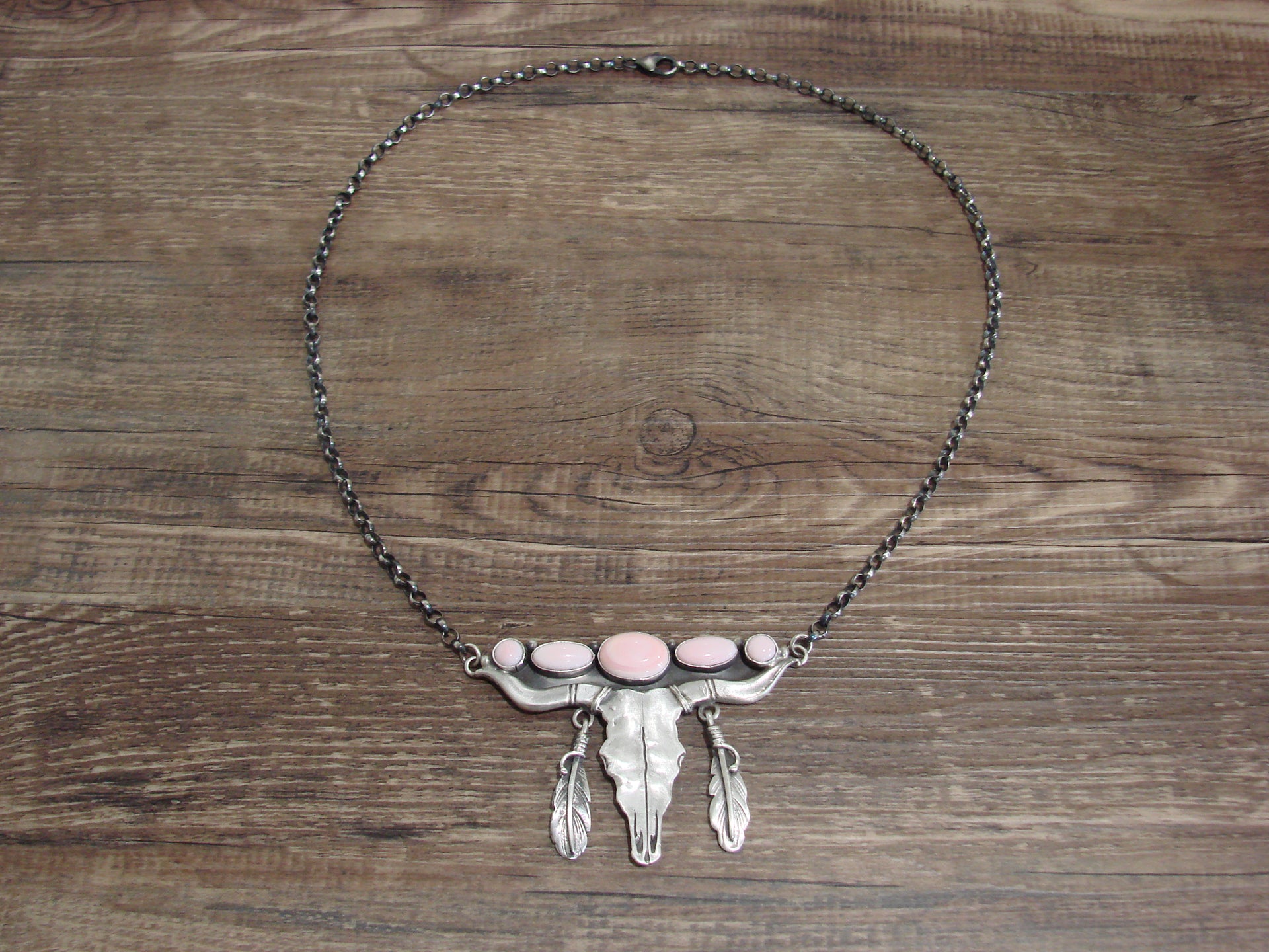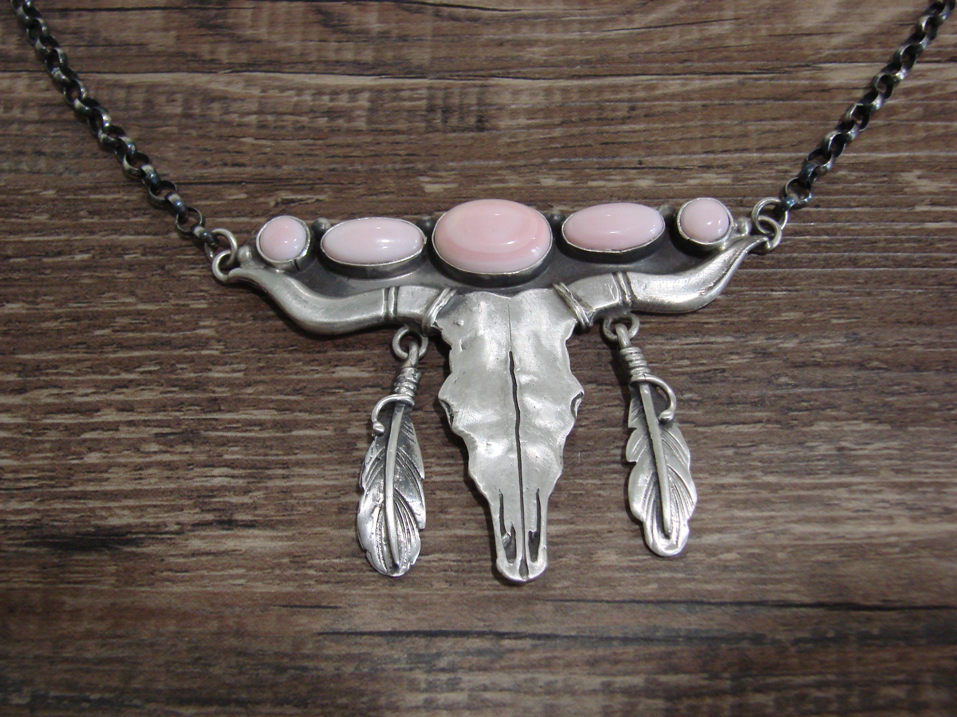 Genuine Native American Navajo Indian Sterling Silver & Pink Queen Conch Shell Long Horn Chain Link Necklace. This Stunning Hand Made necklace features Genuine Pink Queen Conch Shell Stones intricately set into Smooth Sterling Silver bezel settings. Beautiful details in Sterling Silver surround the stones. This is a Stunning necklace! Handmade by Navajo silversmith Russell Sam. Signed "Russell Sam" and Stamped "Sterling" on the back. Free gift box and shipping included!