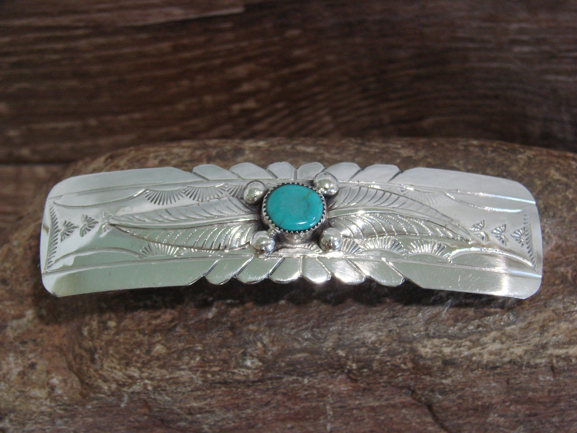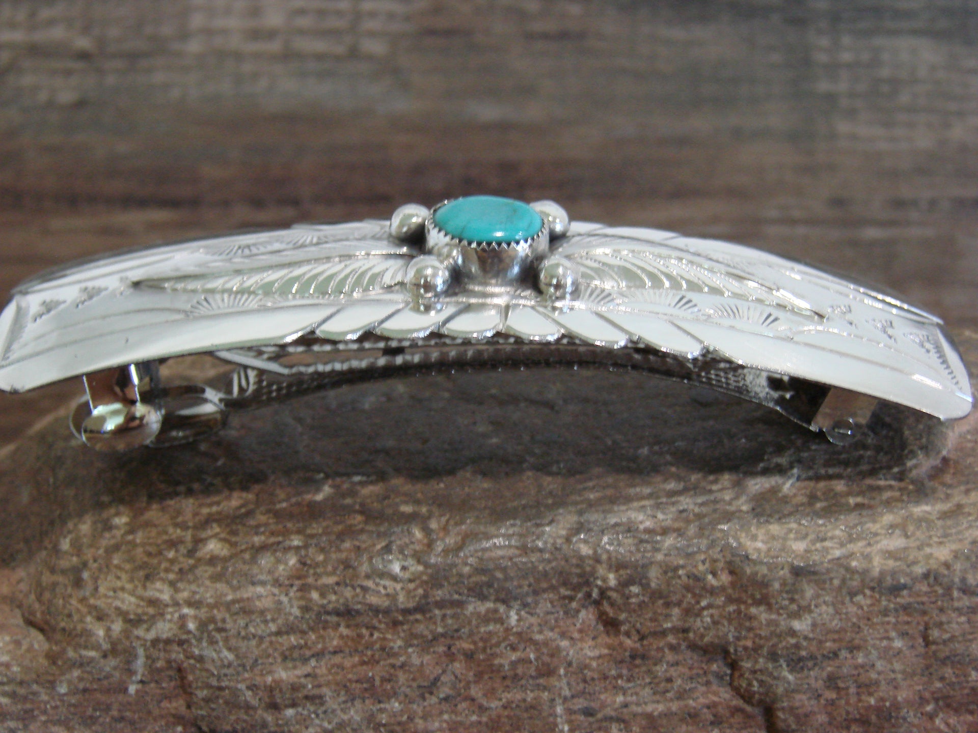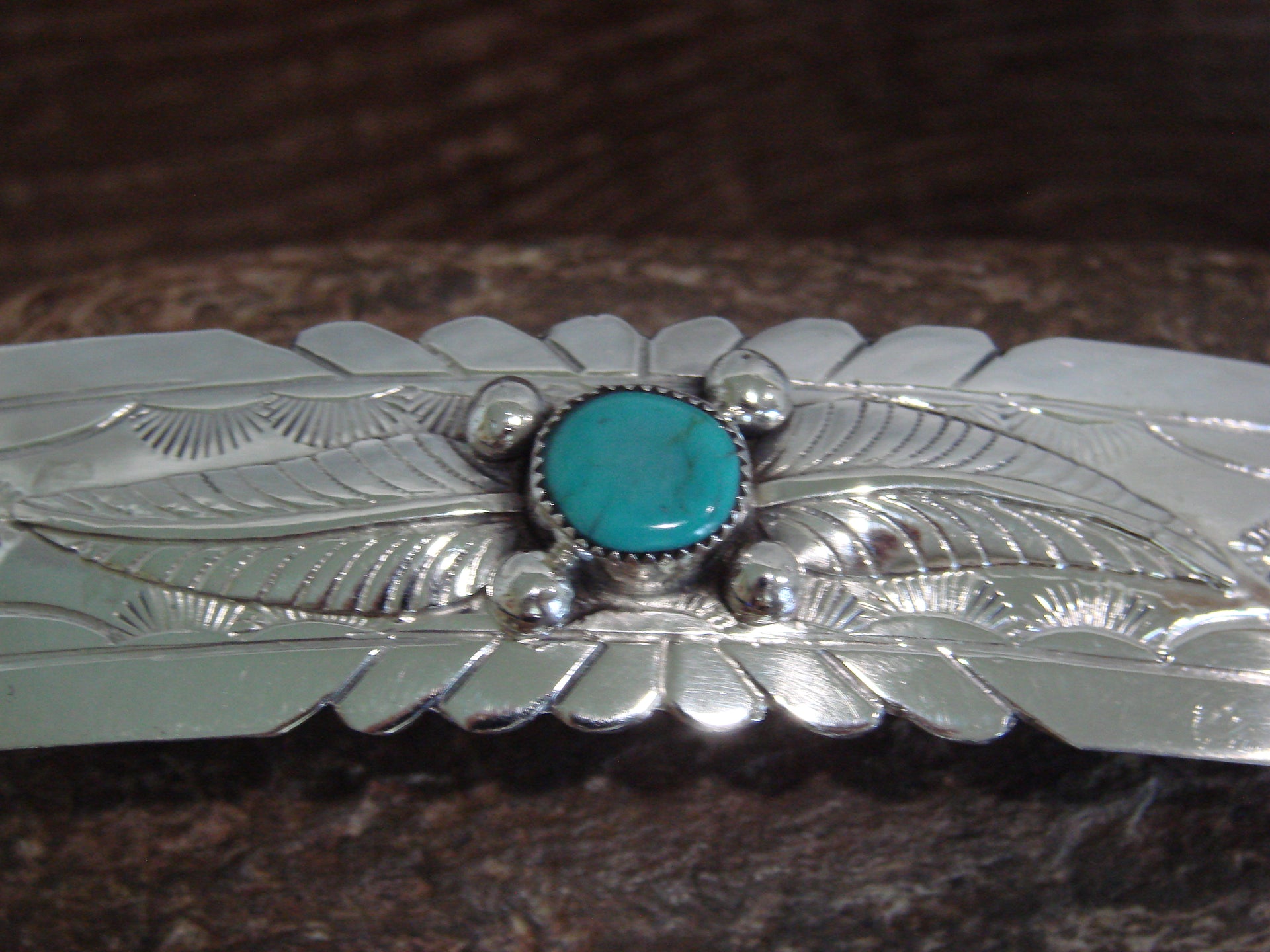 Genuine Native American Navajo Indian Sterling Silver Hand Stamped Turquoise Feather Hair Barrette from Western New Mexico. This Stunning barrette features a Genuine Turquoise stone set into a crown Sterling Silver bezel setting. Surrounding the stone are beautiful details and hand stamping throughout the Sterling Silver. The spring hair clasp is 2 1/2" wide. This Gorgeous barrette is Handmade to Perfection! Handmade and Signed "WM". Stamped "Sterling" on the back. Free shipping and gift box included!