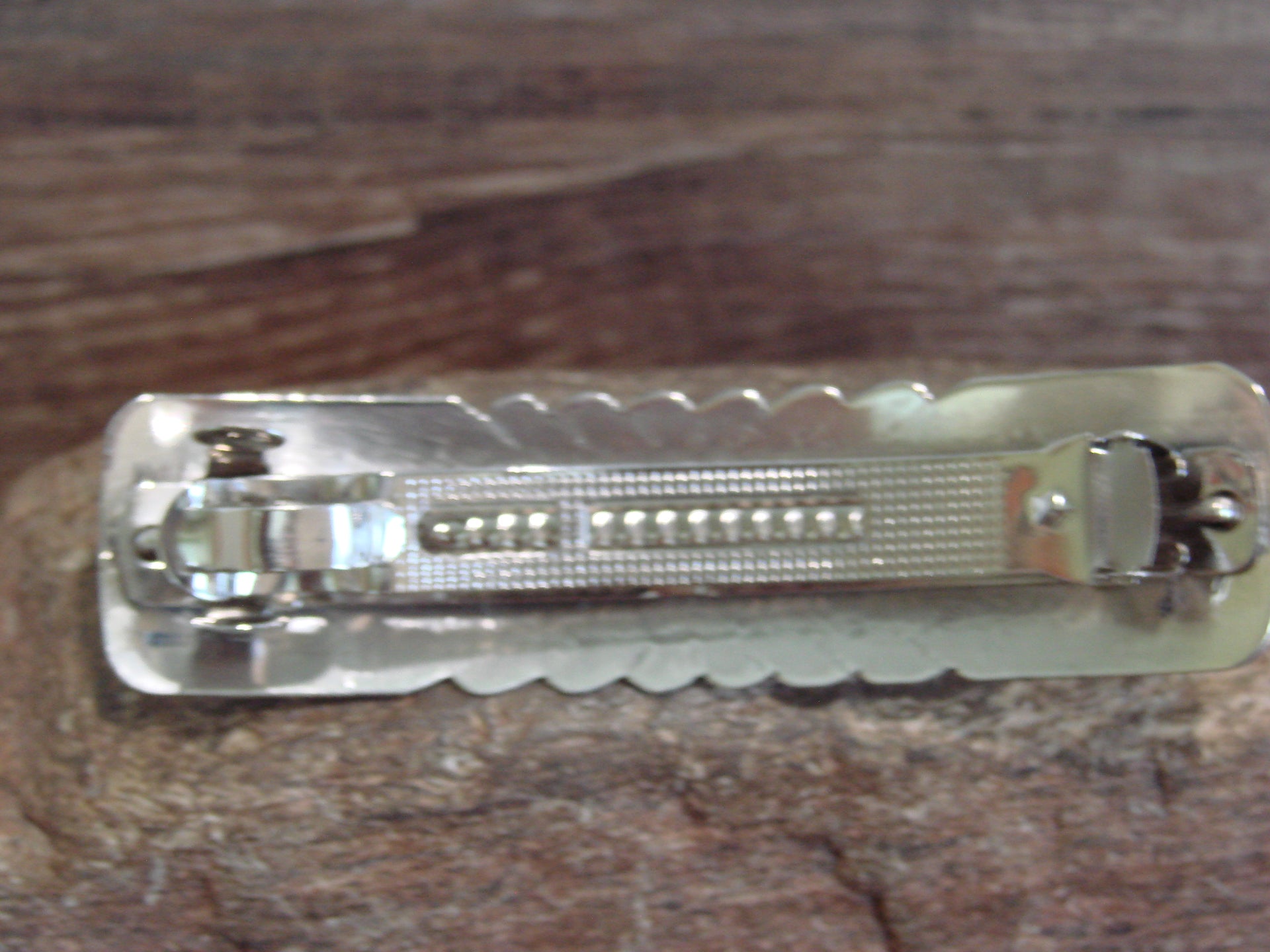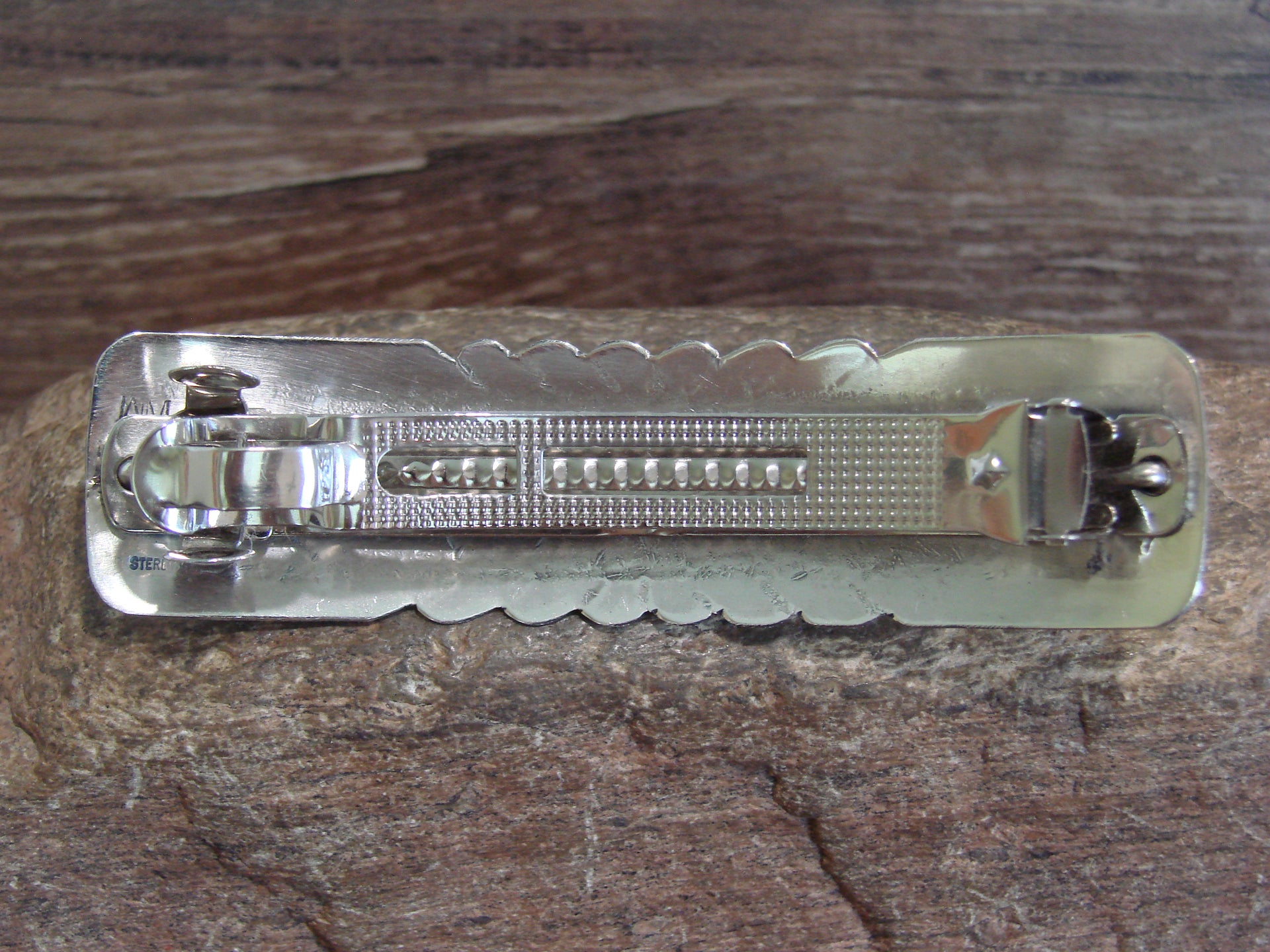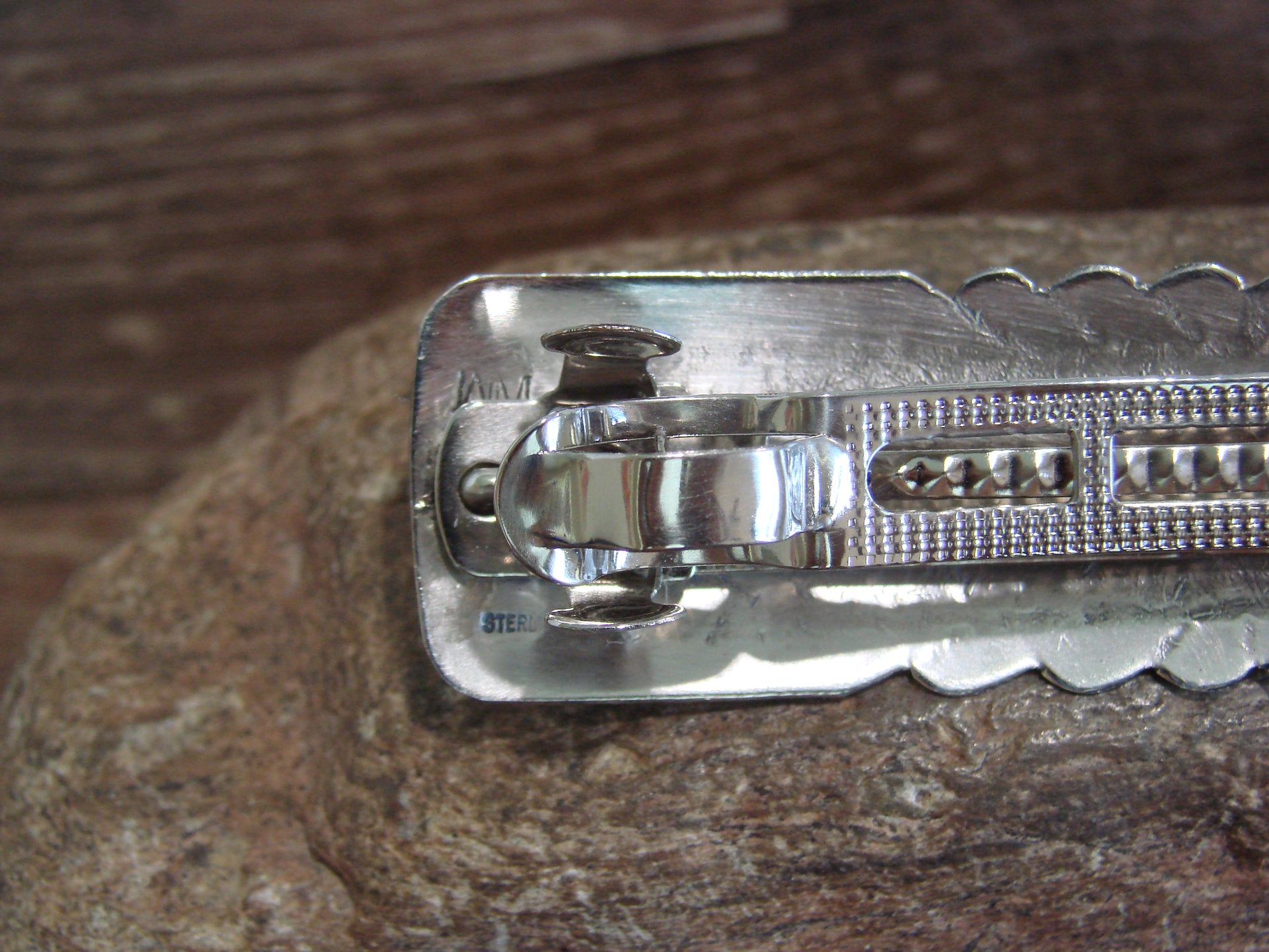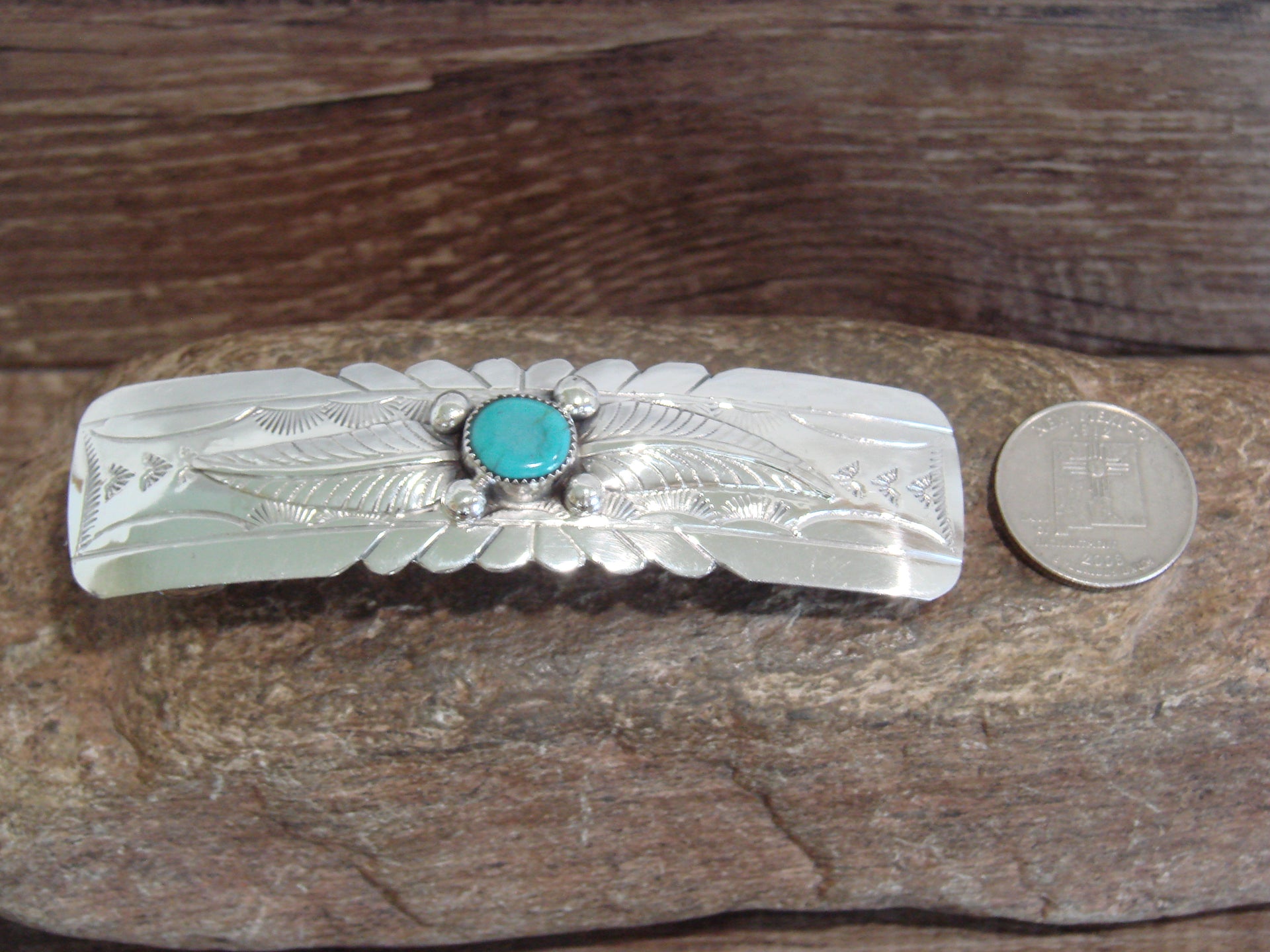 Genuine Native American Navajo Indian Sterling Silver Hand Stamped Turquoise Feather Hair Barrette from Western New Mexico. This Stunning barrette features a Genuine Turquoise stone set into a crown Sterling Silver bezel setting. Surrounding the stone are beautiful details and hand stamping throughout the Sterling Silver. The spring hair clasp is 2 1/2" wide. This Gorgeous barrette is Handmade to Perfection! Handmade and Signed "WM". Stamped "Sterling" on the back. Free shipping and gift box included!