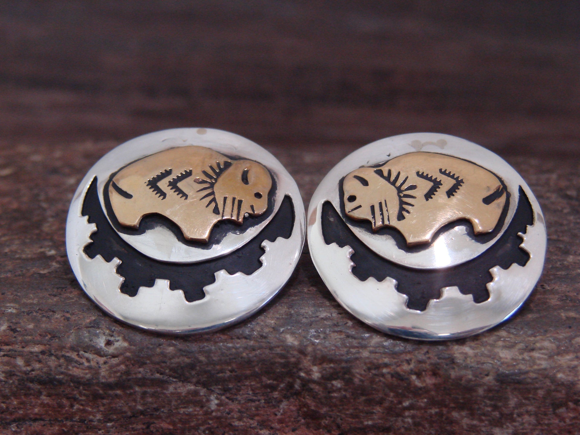 Native American Navajo Indian Sterling Silver & Gold Fill Buffalo Post Earrings from Western New Mexico. This is a stunning pair of dangle earrings! These earrings feature beautiful hand stamping and sterling silver overlay throughout. Fine Navajo Silversmith workmanship quality makes these earrings a beautiful hand made masterpiece. Handmade by well known Navajo Silversmiths T & R Singer. Signed and Stamped Sterling on the back. Free shipping and gift box included!