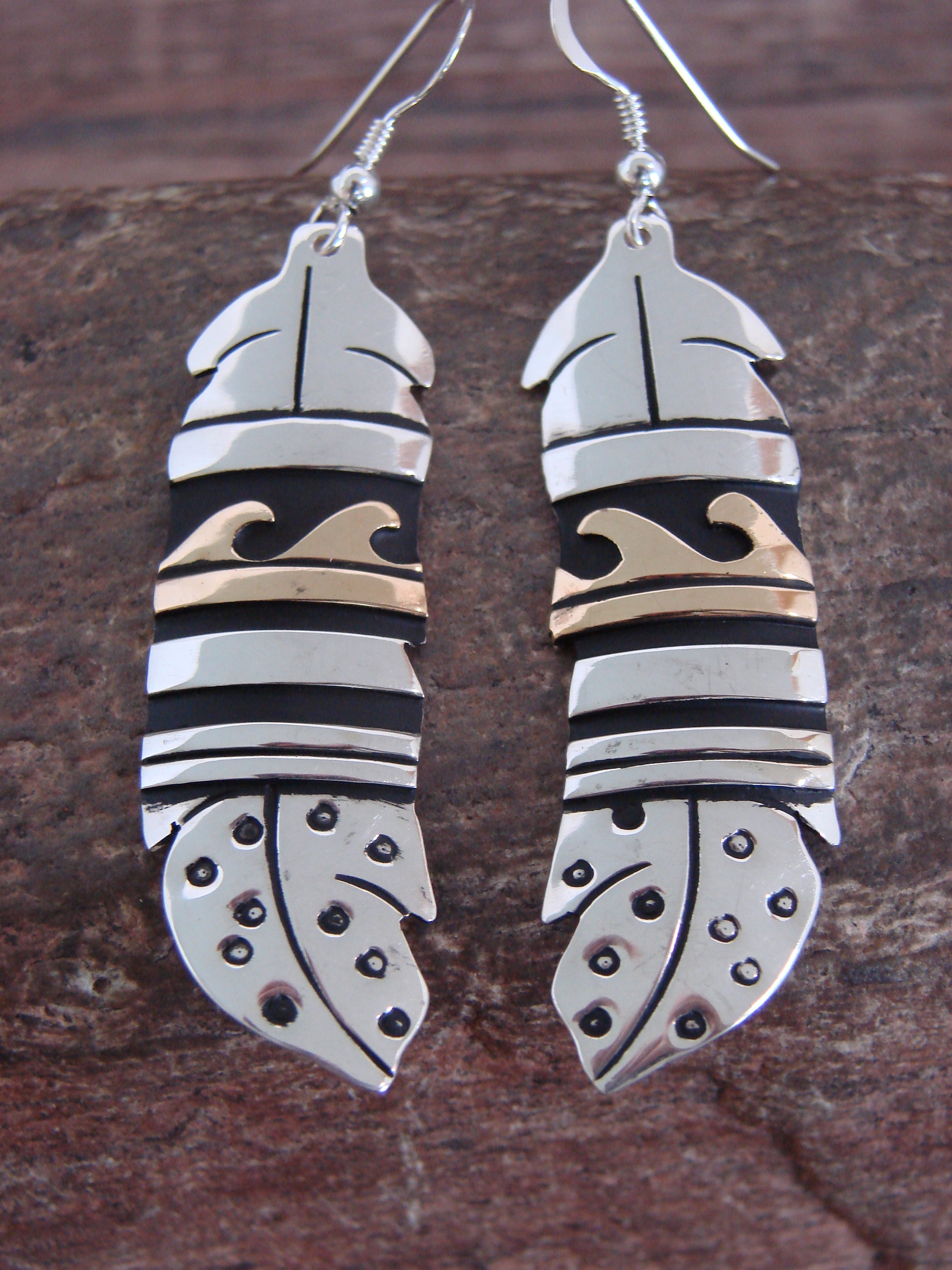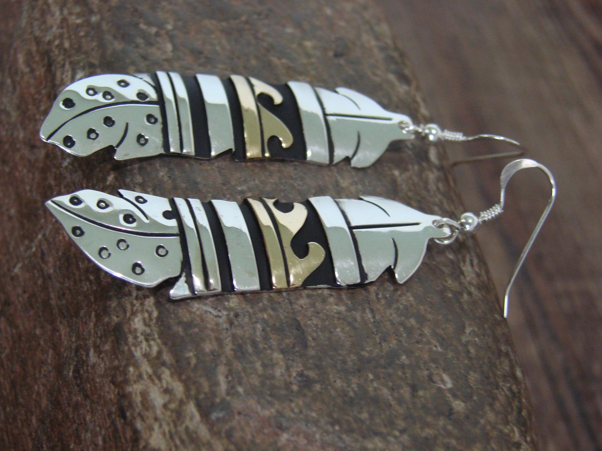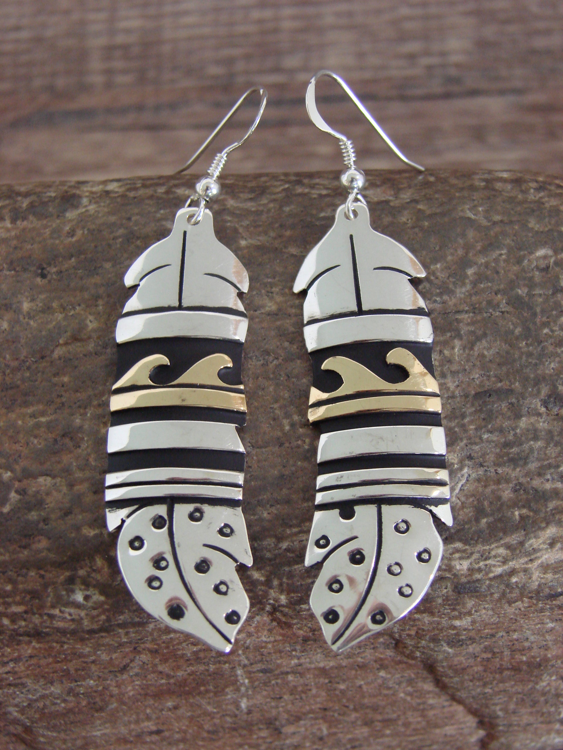 Native American Navajo Indian Sterling Silver & Gold Fill Feather Dangle Earrings from Western New Mexico. This is a stunning pair of dangle earrings! These earrings feature beautiful hand stamping and 12kt Gold overlay. Fine Navajo Silversmith workmanship quality makes these earrings a beautiful hand made masterpiece. Handmade by well known Navajo Silversmiths T & R Singer. Signed and Stamped Sterling on the back. Free shipping and gift box included!