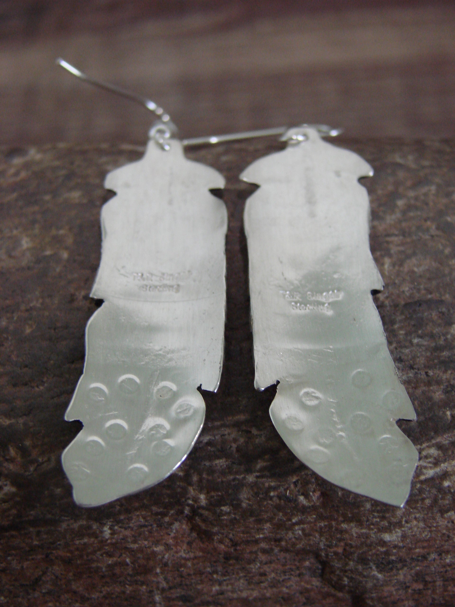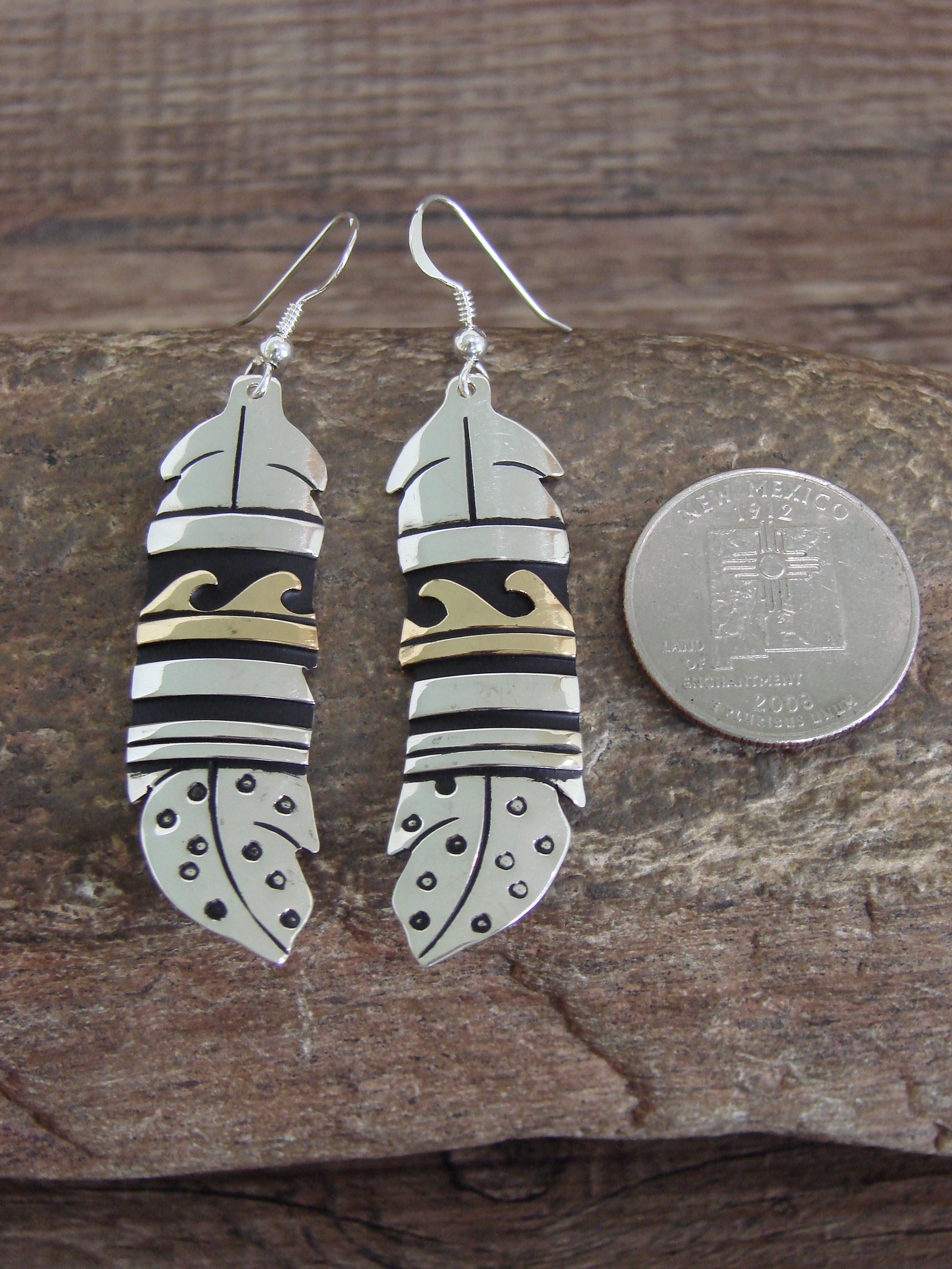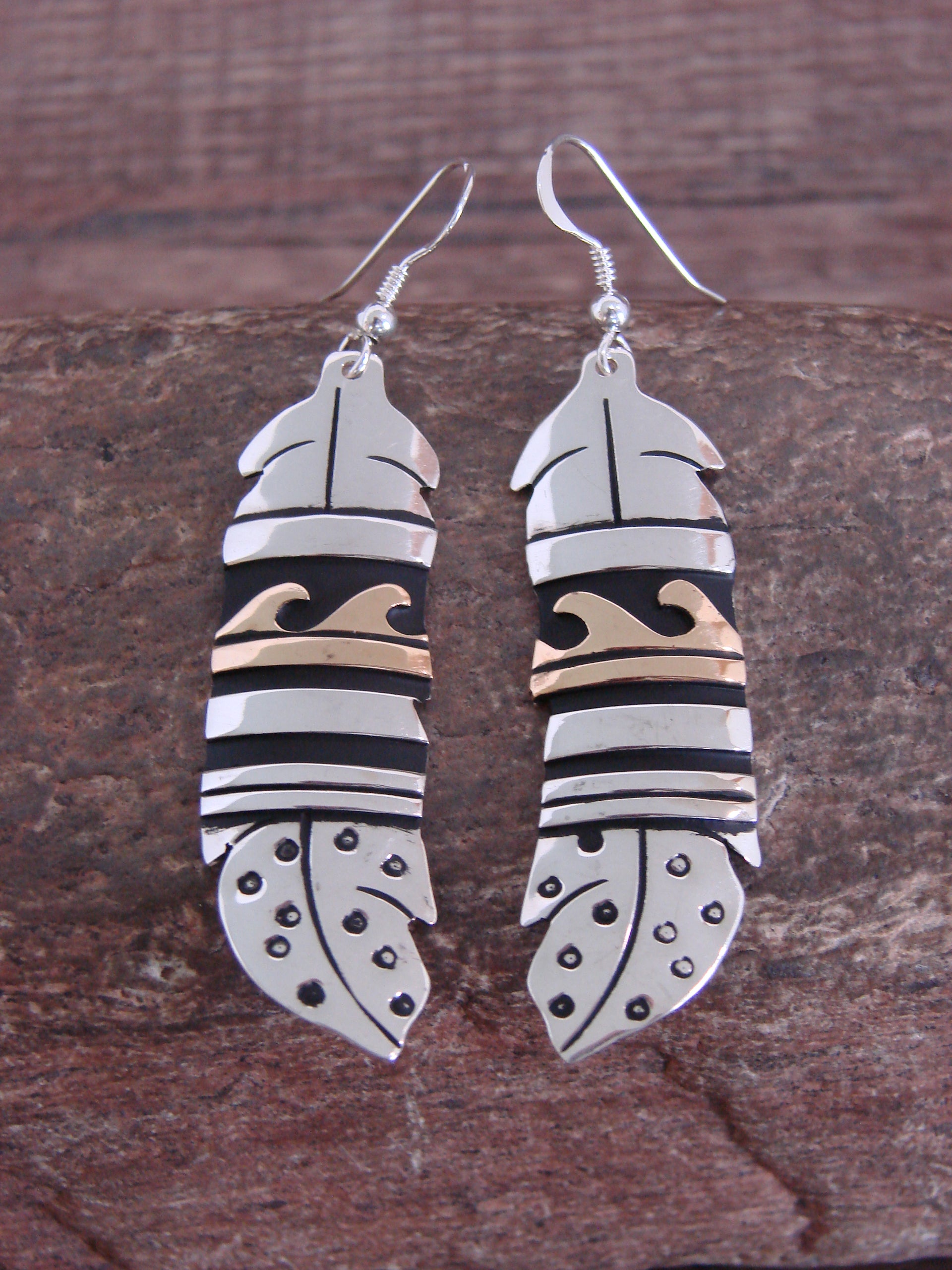 Native American Navajo Indian Sterling Silver & Gold Fill Feather Dangle Earrings from Western New Mexico. This is a stunning pair of dangle earrings! These earrings feature beautiful hand stamping and 12kt Gold overlay. Fine Navajo Silversmith workmanship quality makes these earrings a beautiful hand made masterpiece. Handmade by well known Navajo Silversmiths T & R Singer. Signed and Stamped Sterling on the back. Free shipping and gift box included!