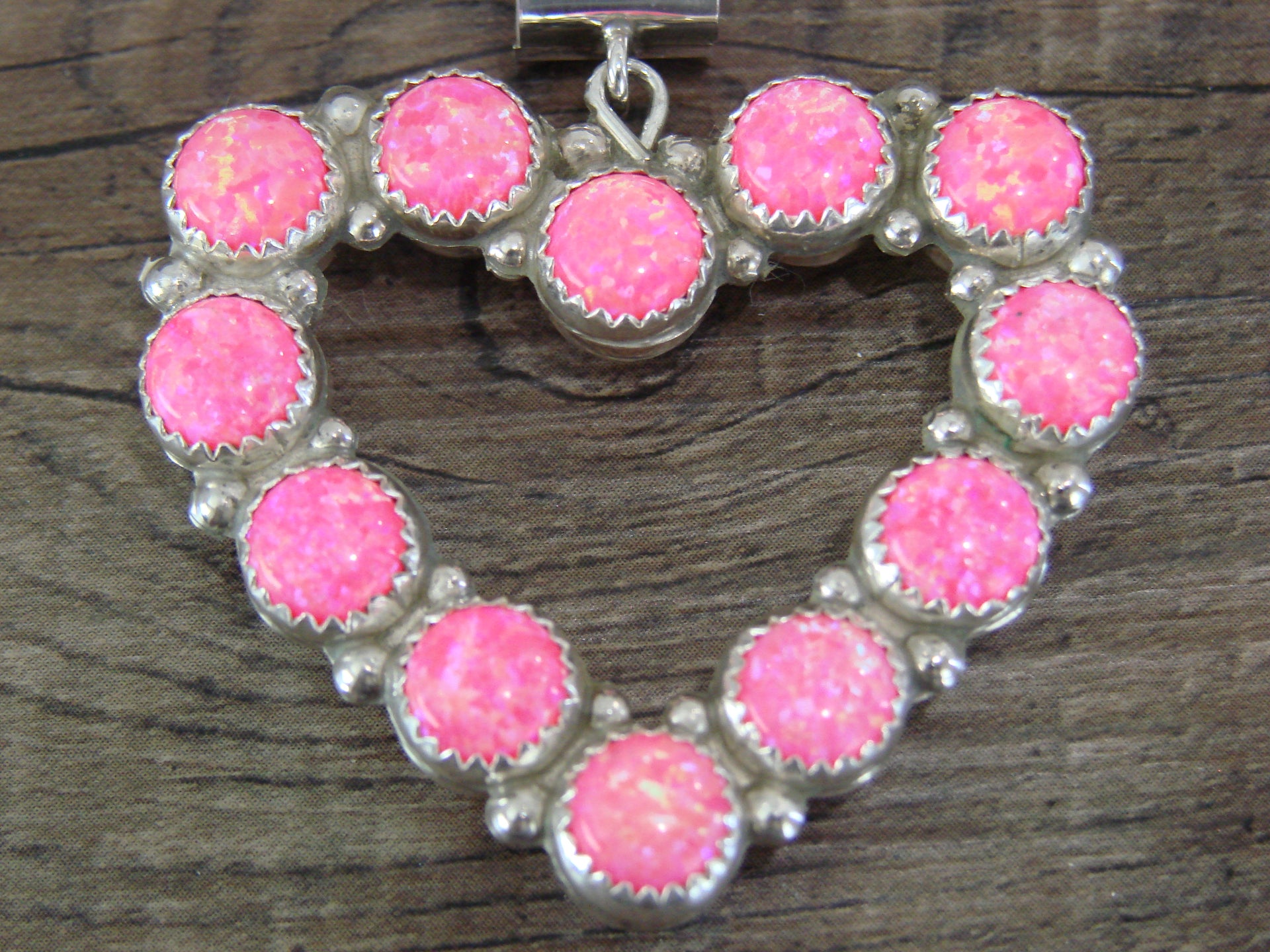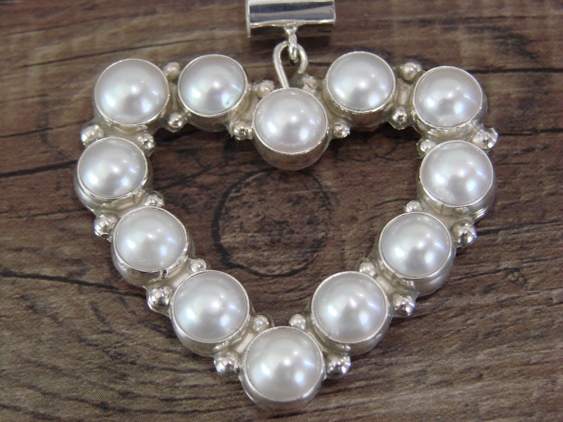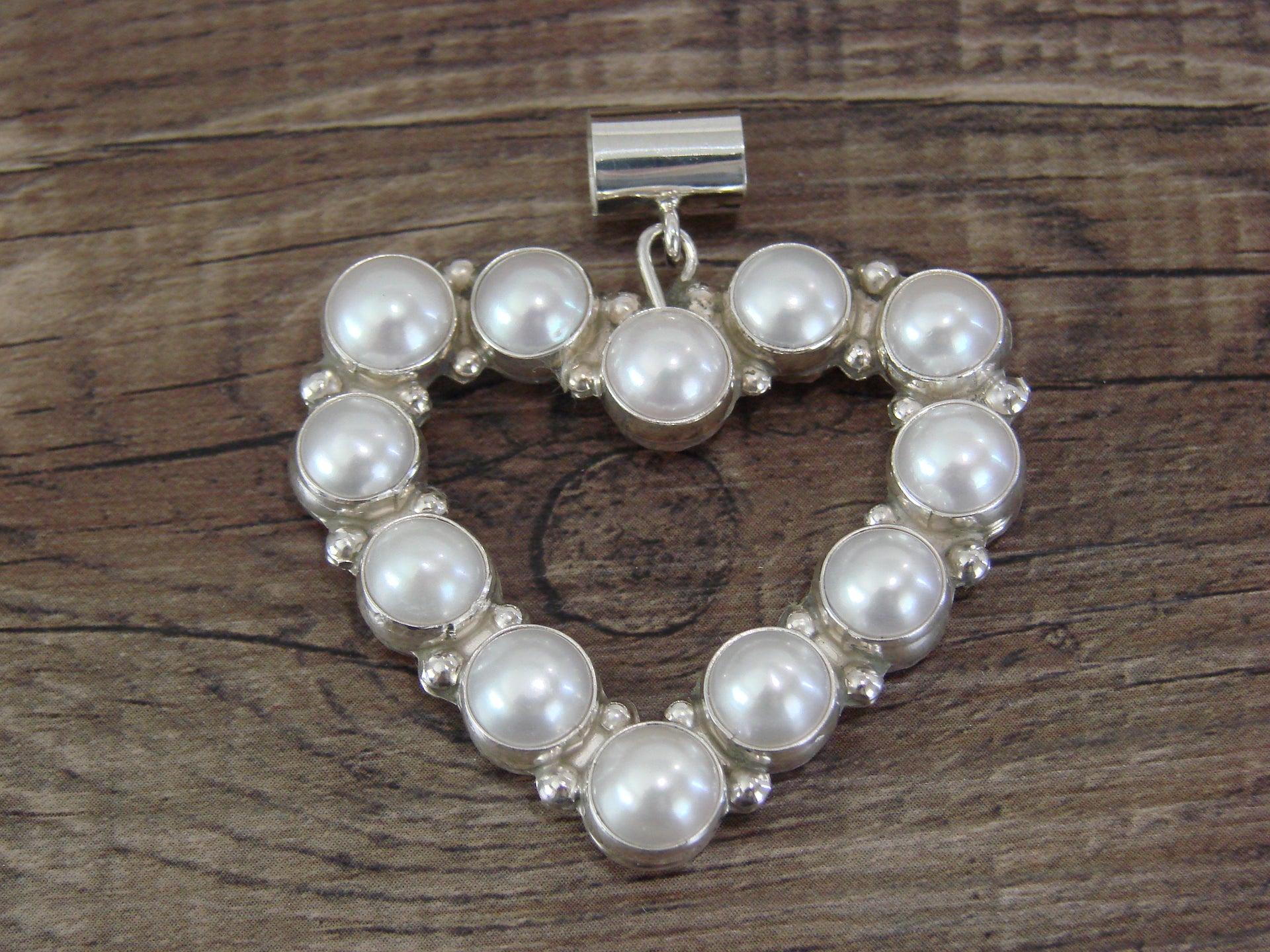 Navajo Indian Sterling Silver Pearl & Pink Opal Reversible Heart Pendant from Western New Mexico. This beautiful Heart features Twelve Pearls on one side and Twelve Pink Opal stones on the other. The Stones are surrounded by details in Sterling and have a stunning look! Navajo Indian handmade by Martin Perry. Signed on the top Bail. Free gift box and shipping included!