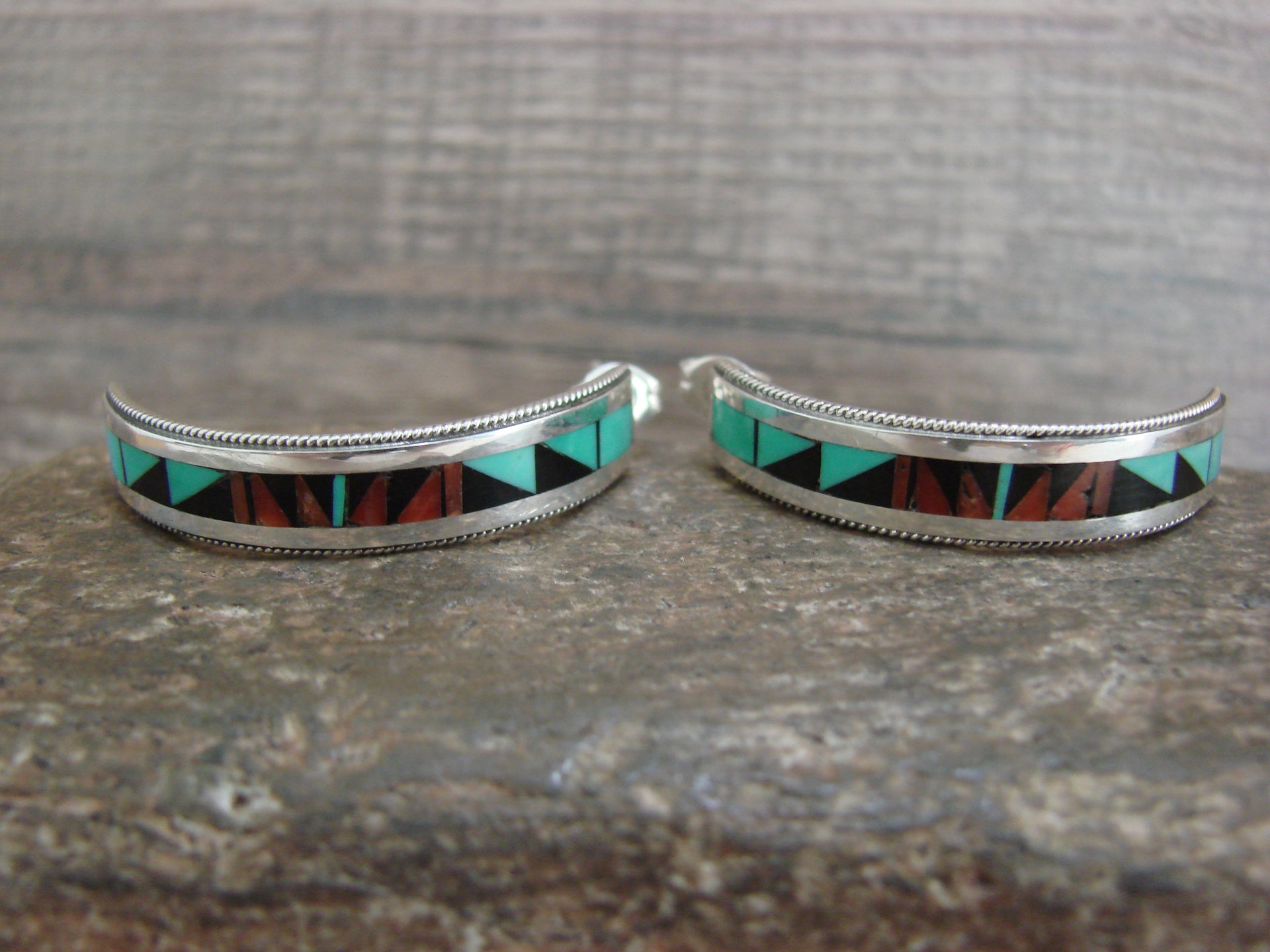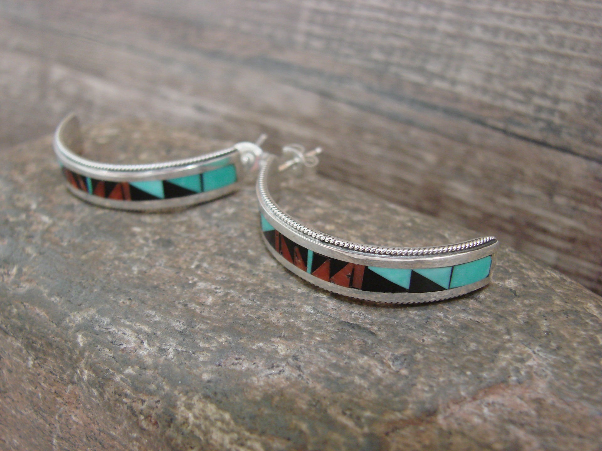 Native American Zuni Indian Sterling Silver & Multi Stone Half Hoop Post Earrings from Western New Mexico. These stunning earrings feature beautifully inlaid Shell, Onyx, Coral, and Turquoise Stones set into a smooth Sterling Silver Half Hoop setting. These earrings are gorgeous! Zuni Indian hand made by Phil & Rachel Weahkee. Signed on the inner hoop. Free shipping and gift box included!