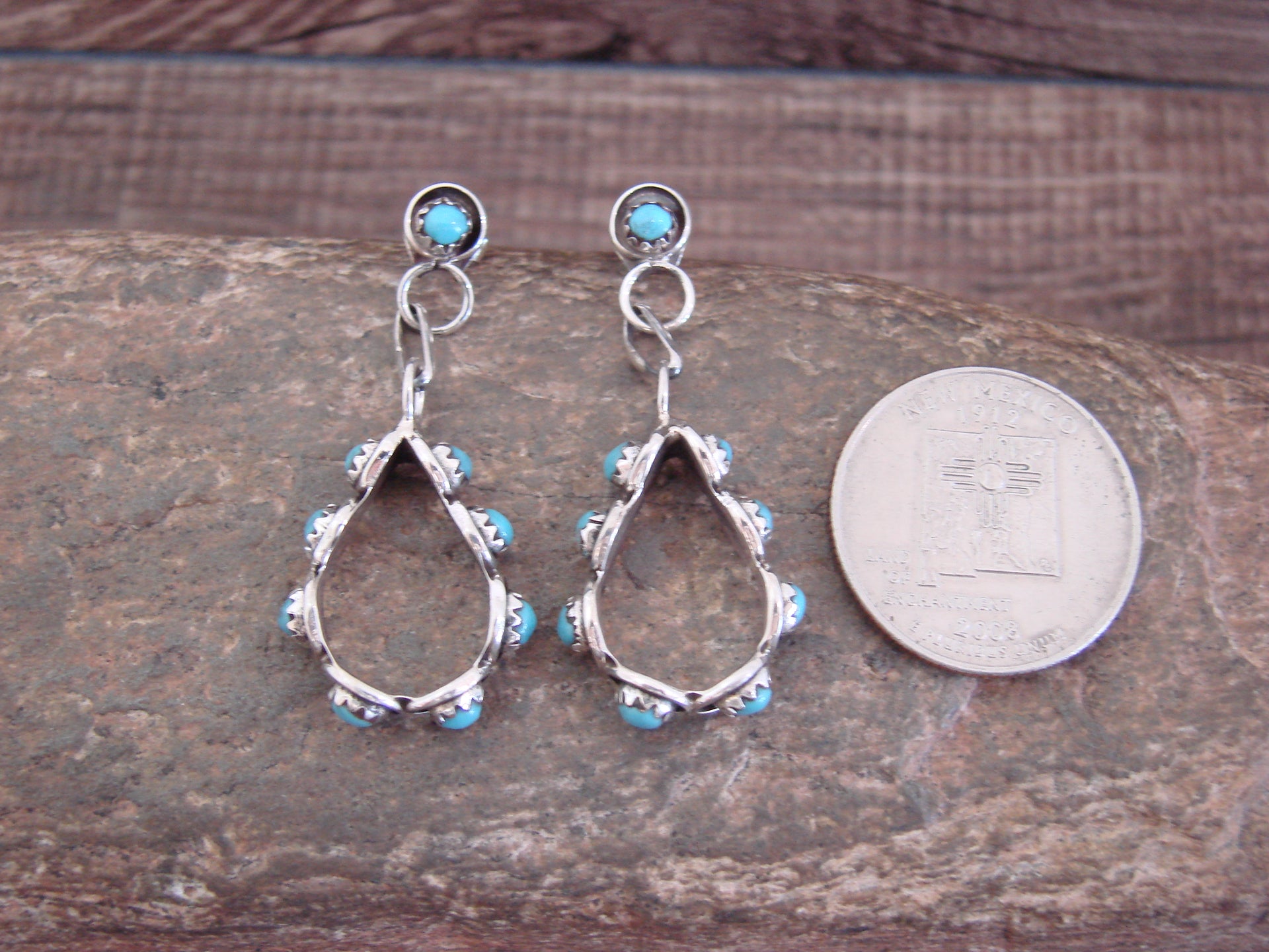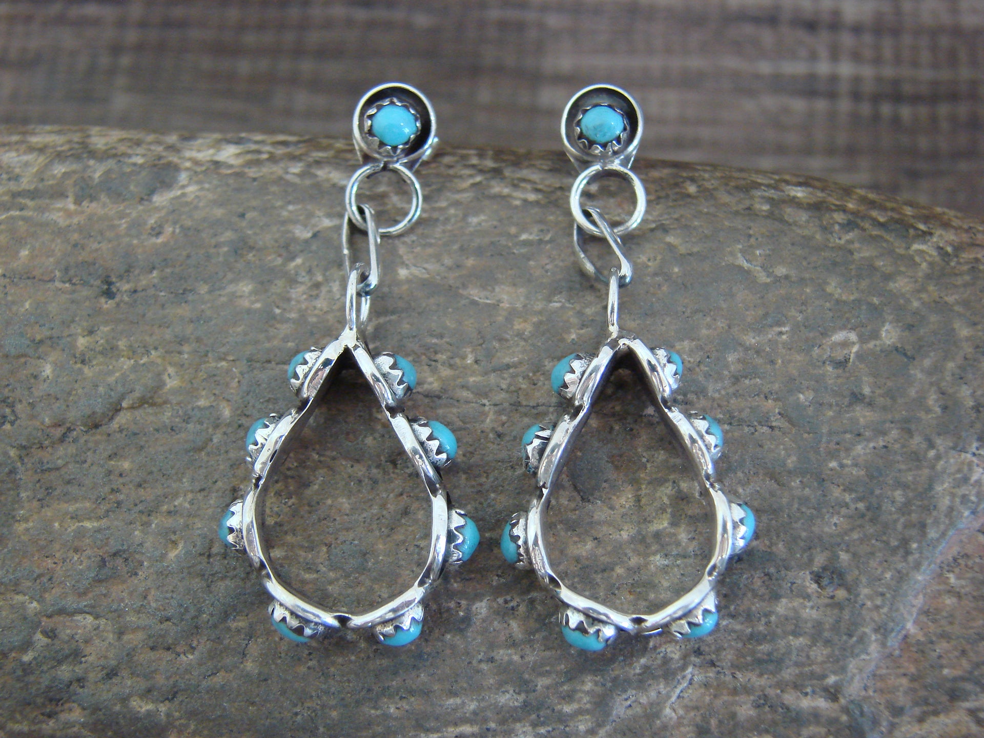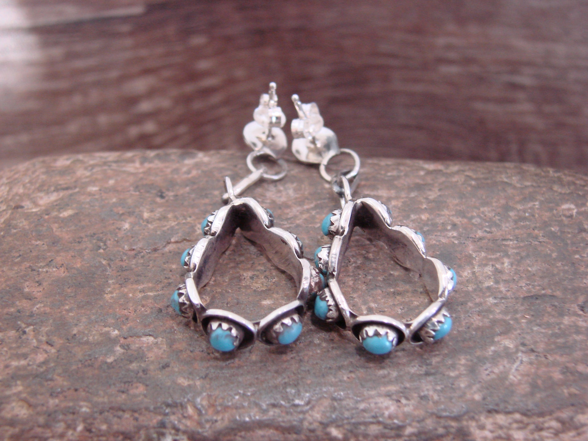Genuine Native American Zuni Indian Sterling Silver & Turquoise Post Dangle Earrings from Western New Mexico. These post style earrings feature genuine Turquoise stones beautifully set into shadowbox crown sterling silver bezel settings. Beautiful details in Sterling Silver surround the stones. This is a Stunning pair of earrings! Zuni Indian handmade to Perfection by Marlon Quam. Unsigned. Free shipping with a gift box included!