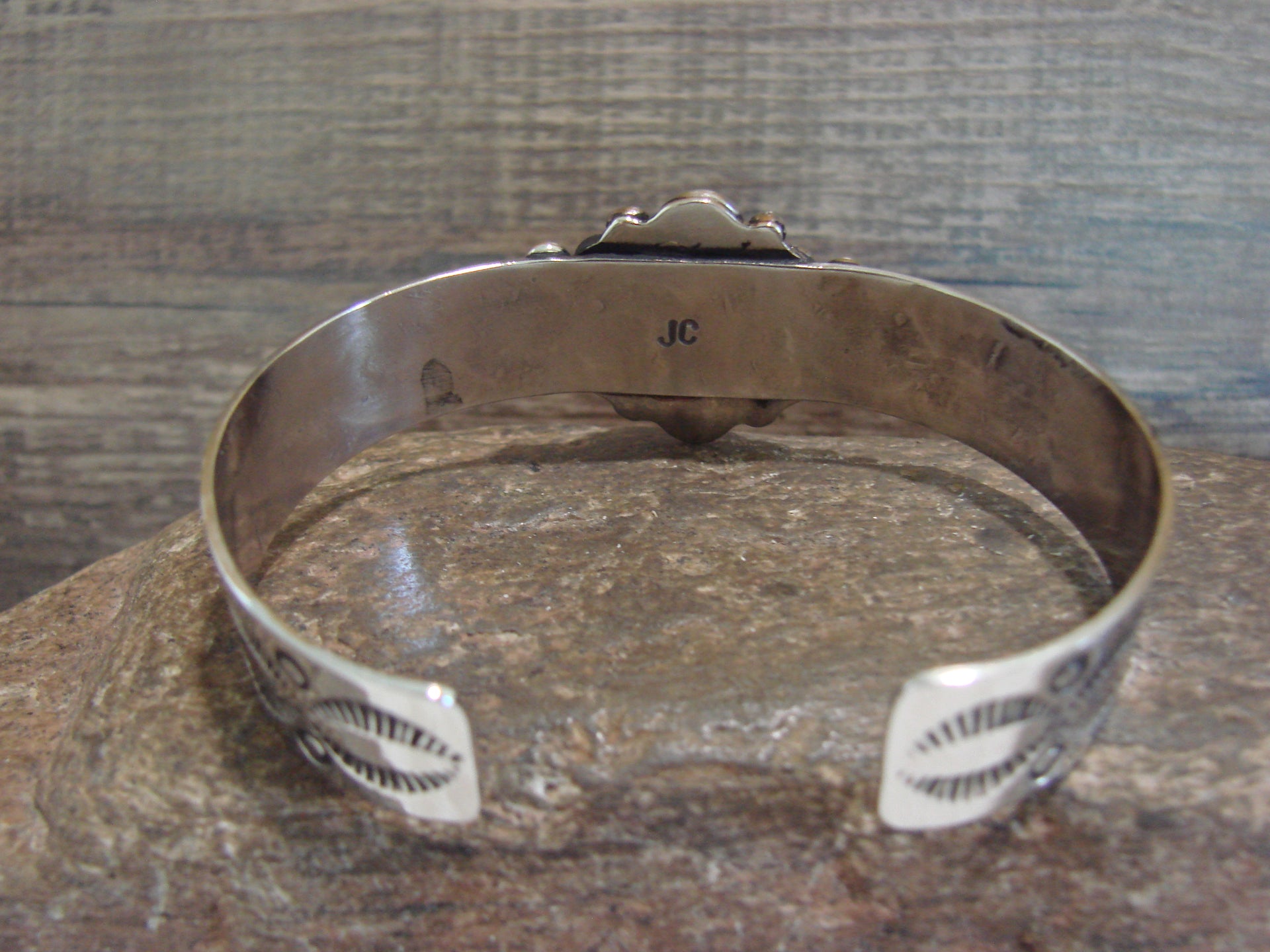 Native American Navajo Indian Handmade Nickel Silver & Red Howlite Bracelet from Western New Mexico. This bracelet features a Red howlite stone set into a smooth Nickel Silver bezel setting. The stone is nicely polished and surrounded by traditional Navajo style design work in Nickel Silver. Navajo Indian handmade by well-known Silversmith Jackie Cleveland. Signed "JC" on the back. Free Shipping with a gift box included!