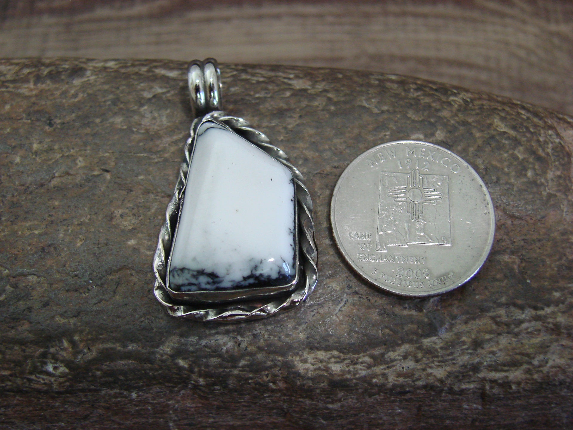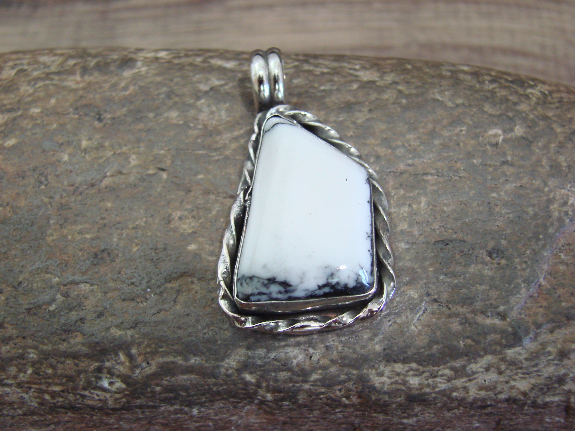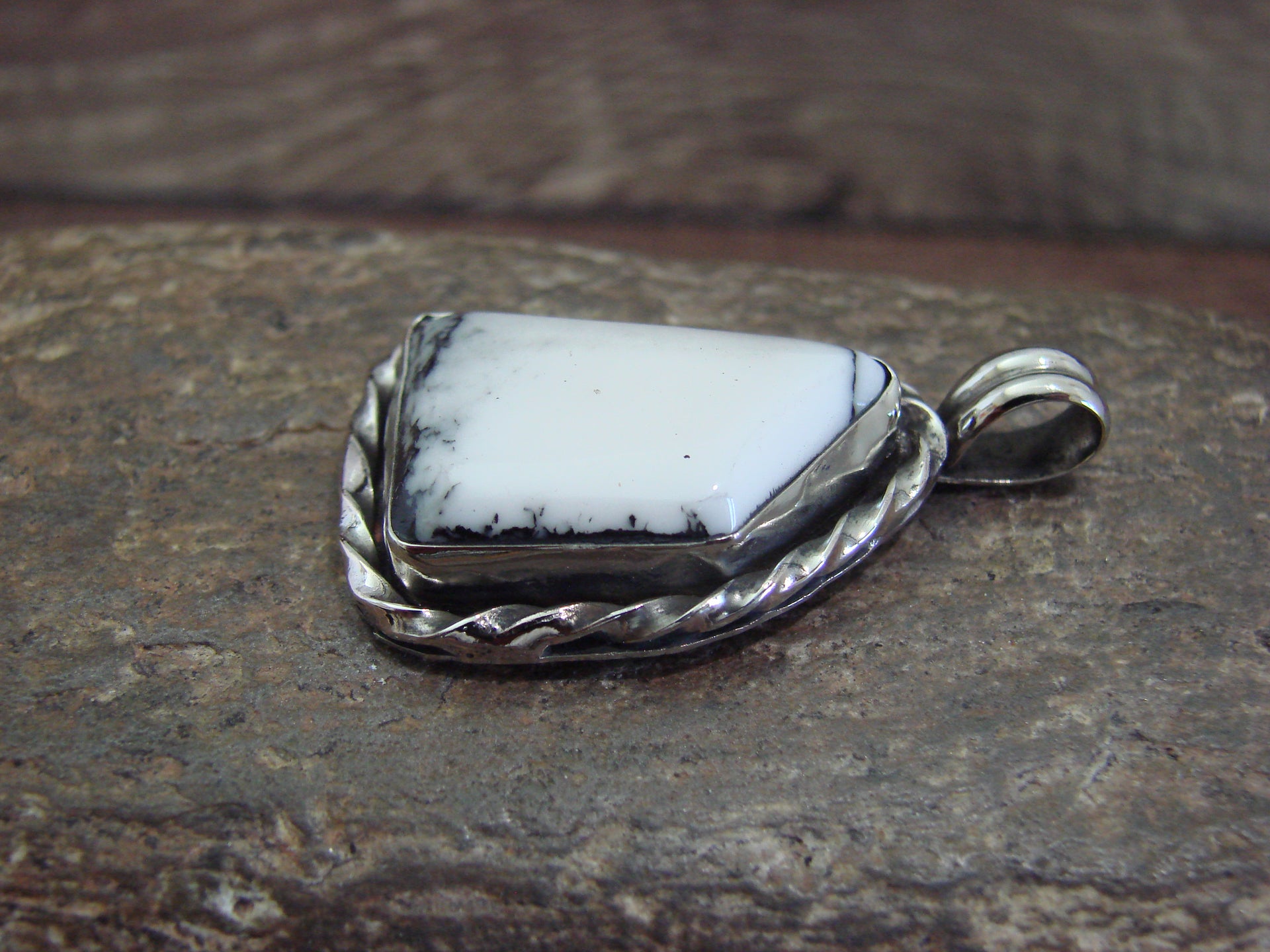 Native American Navajo Indian Nickel Silver & Howlite Pendant from Western New Mexico. This beautiful Pendant is hand cut from Nickel Silver. The Howlite Stone is securely set into a smooth Nickel Silver bezel setting. Handmade by Jackie Cleveland, wife of the late Navajo Silversmith Albert Cleveland. Jackie is widely known for her traditional Navajo style and hand stamping. Free gift box and shipping included!