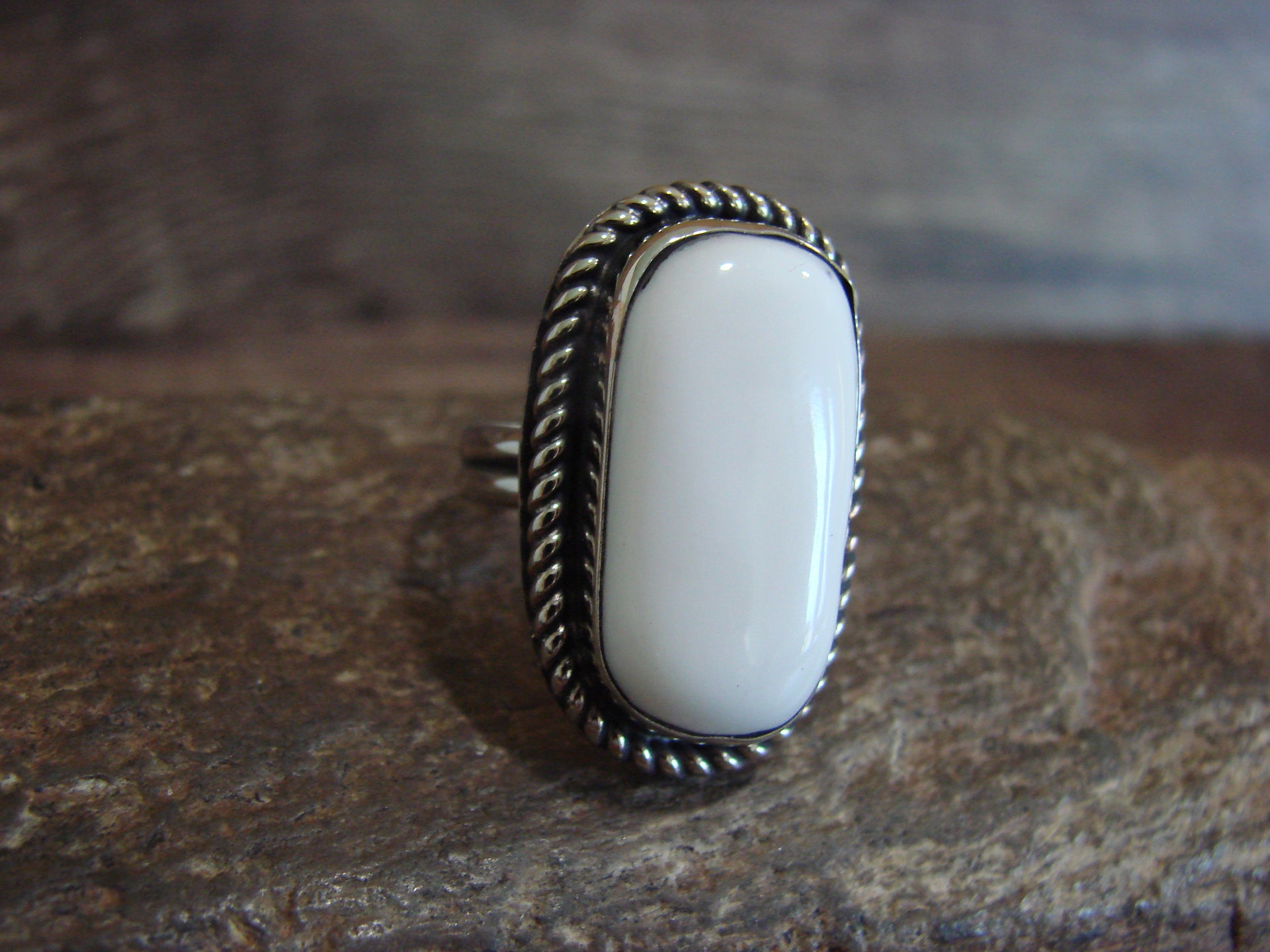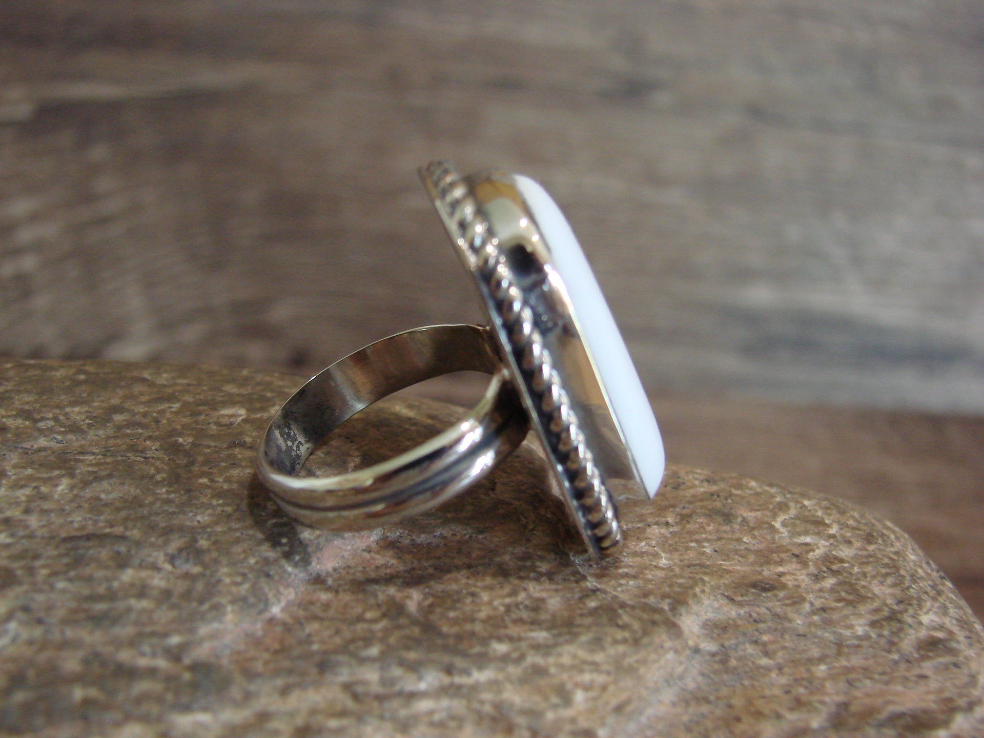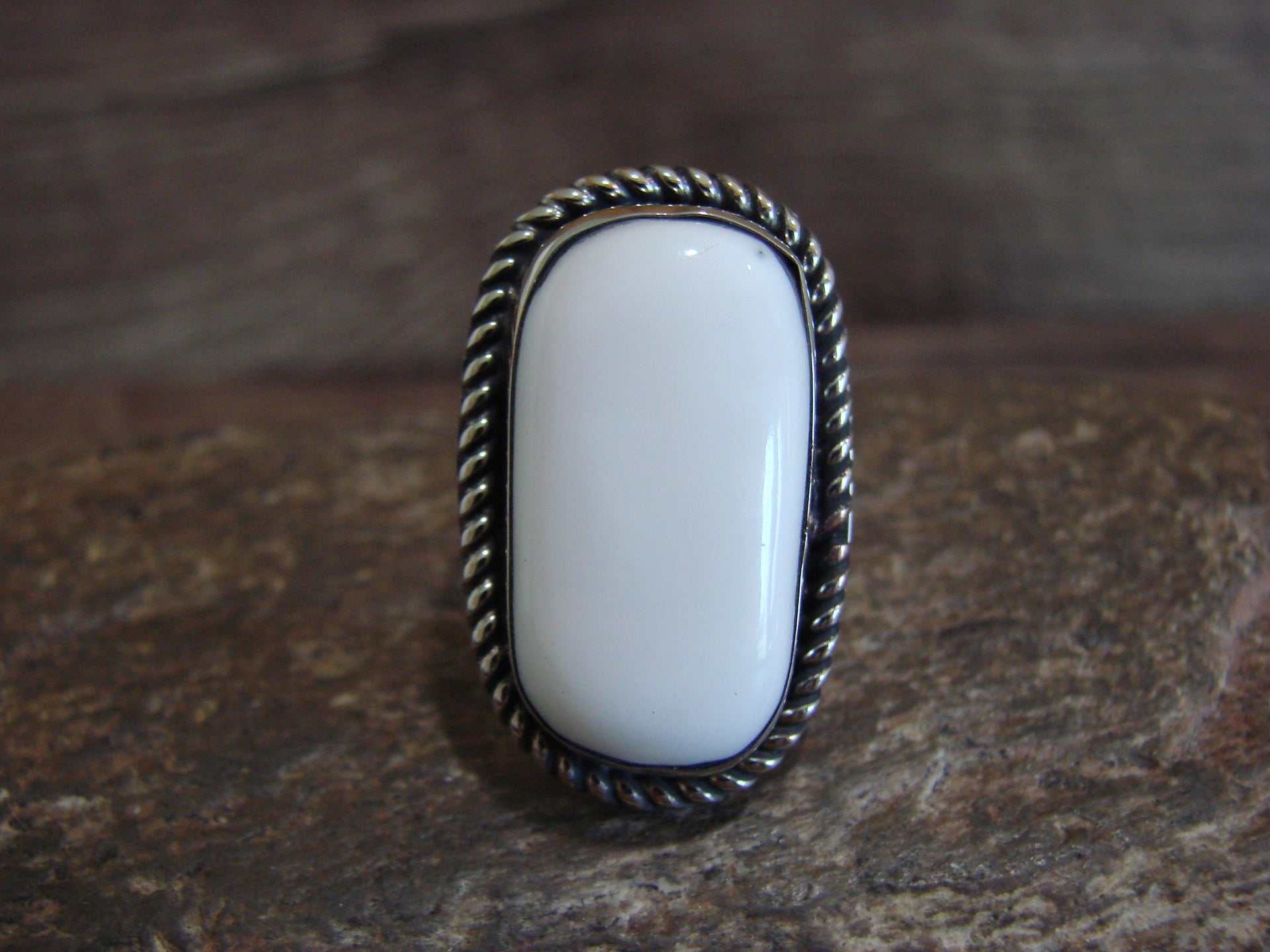 Native American Navajo Indian Nickel Silver & Howlite Ring from Western New Mexico. This ring features a Howlite stone set into a smooth Nickel Silver bezel setting. Beautiful Nickel Silver details Surround the Stone. This ring is made in Nickel Silver. This ring is Stunning! Navajo Indian handmade by Silversmith Jackie Cleveland. Signed "JC" on the back. Free Shipping and Gift Box included!