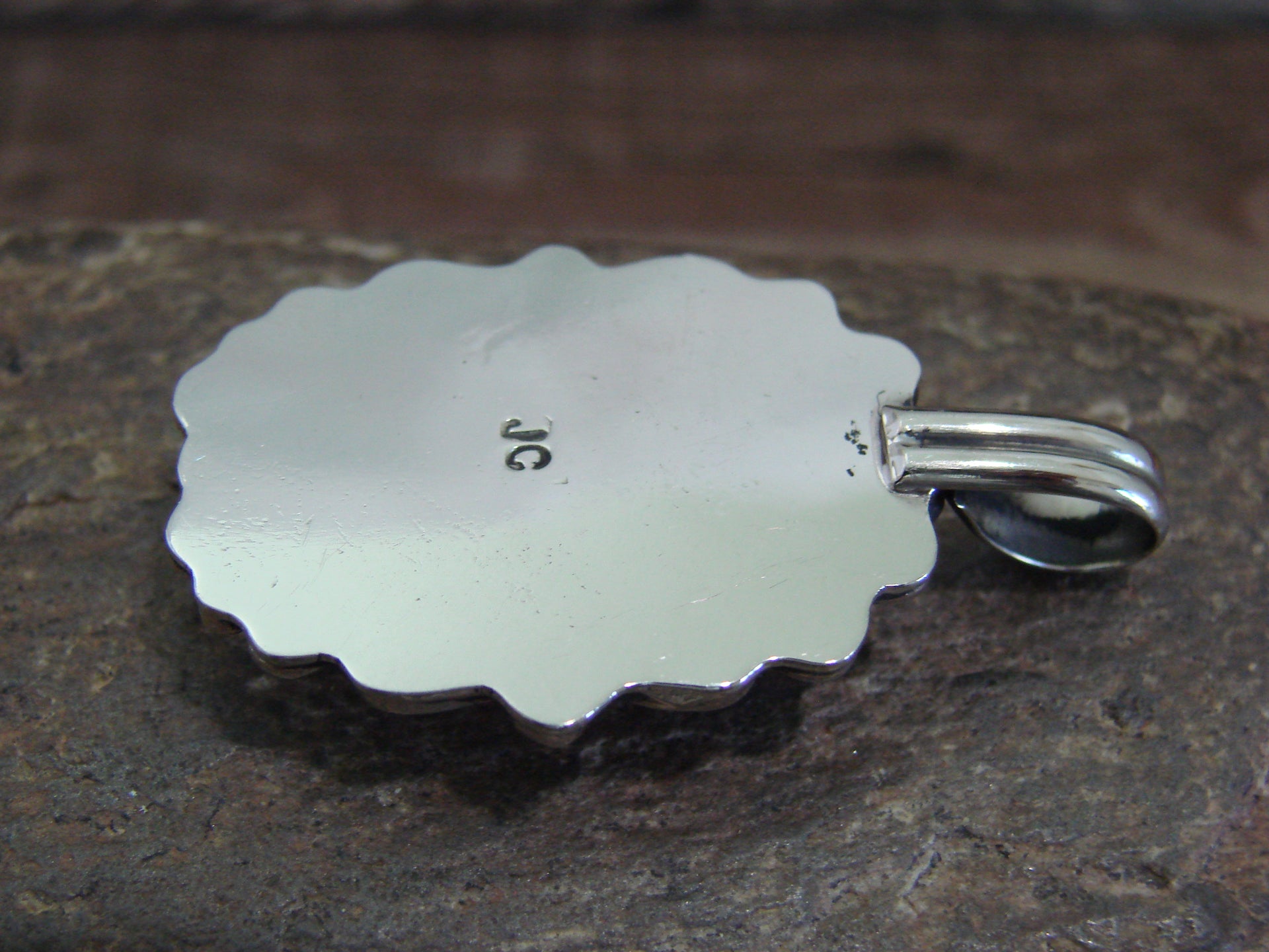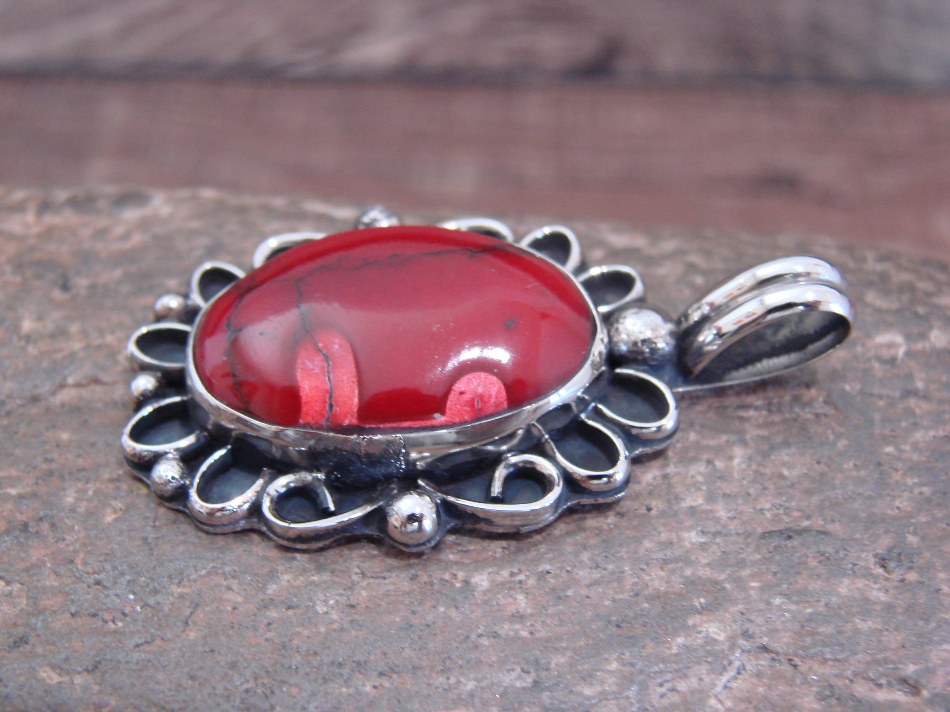 Native American Navajo Indian Nickel Silver & Red Howlite Pendant from Western New Mexico. This beautiful Pendant is hand cut from Nickel Silver. The Red Howlite Stone is securely set into a smooth Nickel Silver bezel setting. Handmade by Jackie Cleveland, wife of the late Navajo Silversmith Albert Cleveland. Signed "JC" on back. Jackie is widely known for her traditional Navajo style and hand stamping. Free gift box and shipping included!