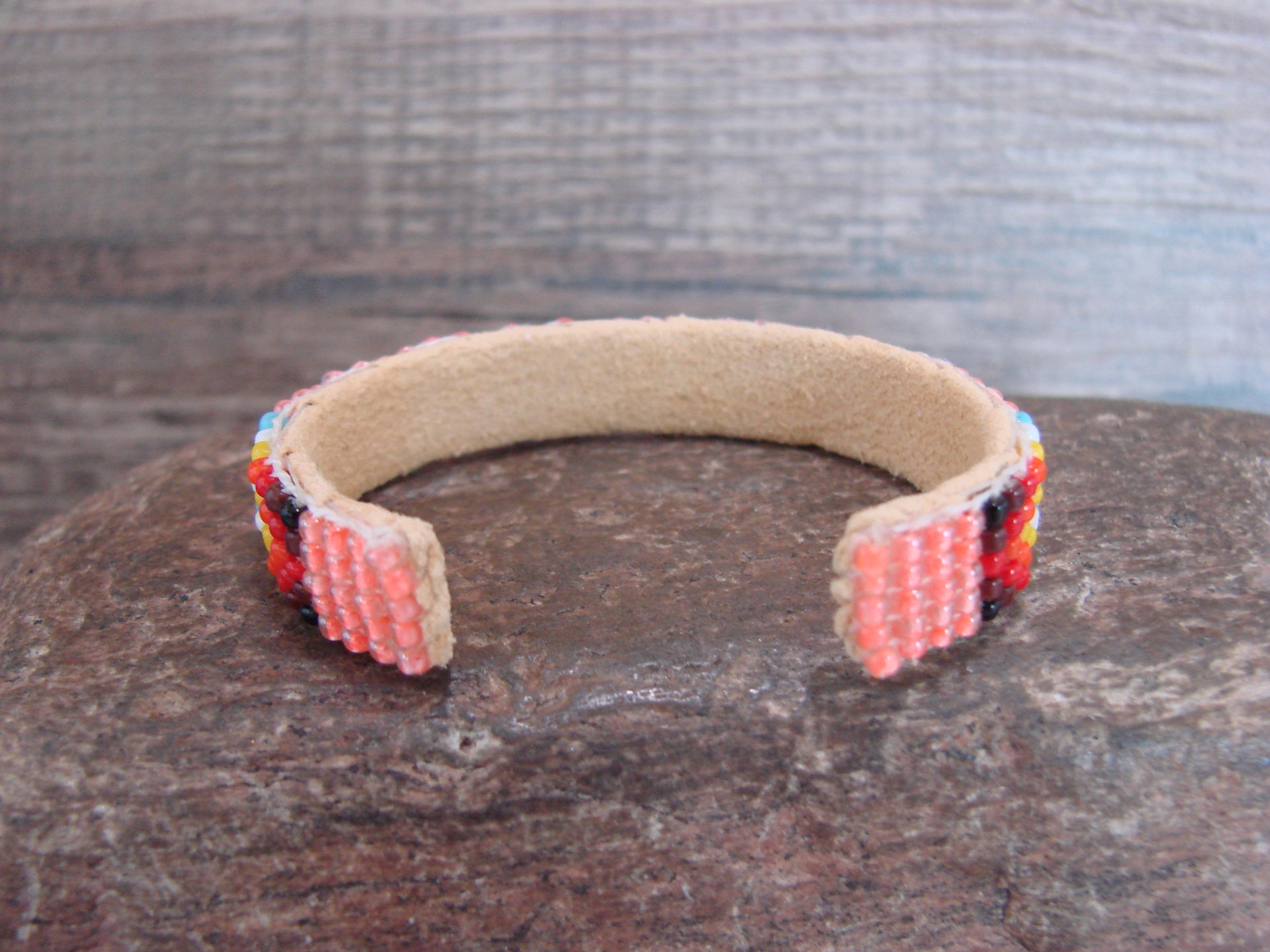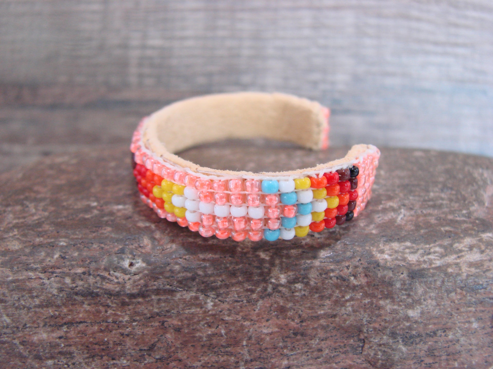Native Treasures Navajo Indian Hand Beaded Baby/Chlid's Bracelet from Western New Mexico. This small bracelet features a beautiful hand beaded design throughout. The bracelet is very colorful and has a great look. This bracelet can easily be adjusted to fit different sized wrists. The inside is lined with white leather. Navajo Indian handmade by Jackie Cleveland. The back is unsigned. Free gift box included!