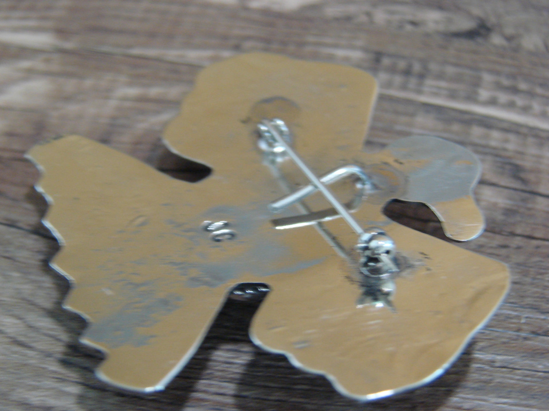 Native American Navajo Indian Nickel Silver & Turquoise Thunderbird Pendant Pin from Western New Mexico. This beautiful Pendant Pin is hand cut from Nickel Silver and features stunning traditional hand stamping throughout. The Genuine Turquoise stone is securely set into a crown Nickel Silver bezel setting. Handmade by Jackie Cleveland, wife of the late Navajo Silversmith Albert Cleveland. Signed "JC" on back. Jackie is widely known for her traditional Navajo style and hand stamping. Free gift box and shipping included!