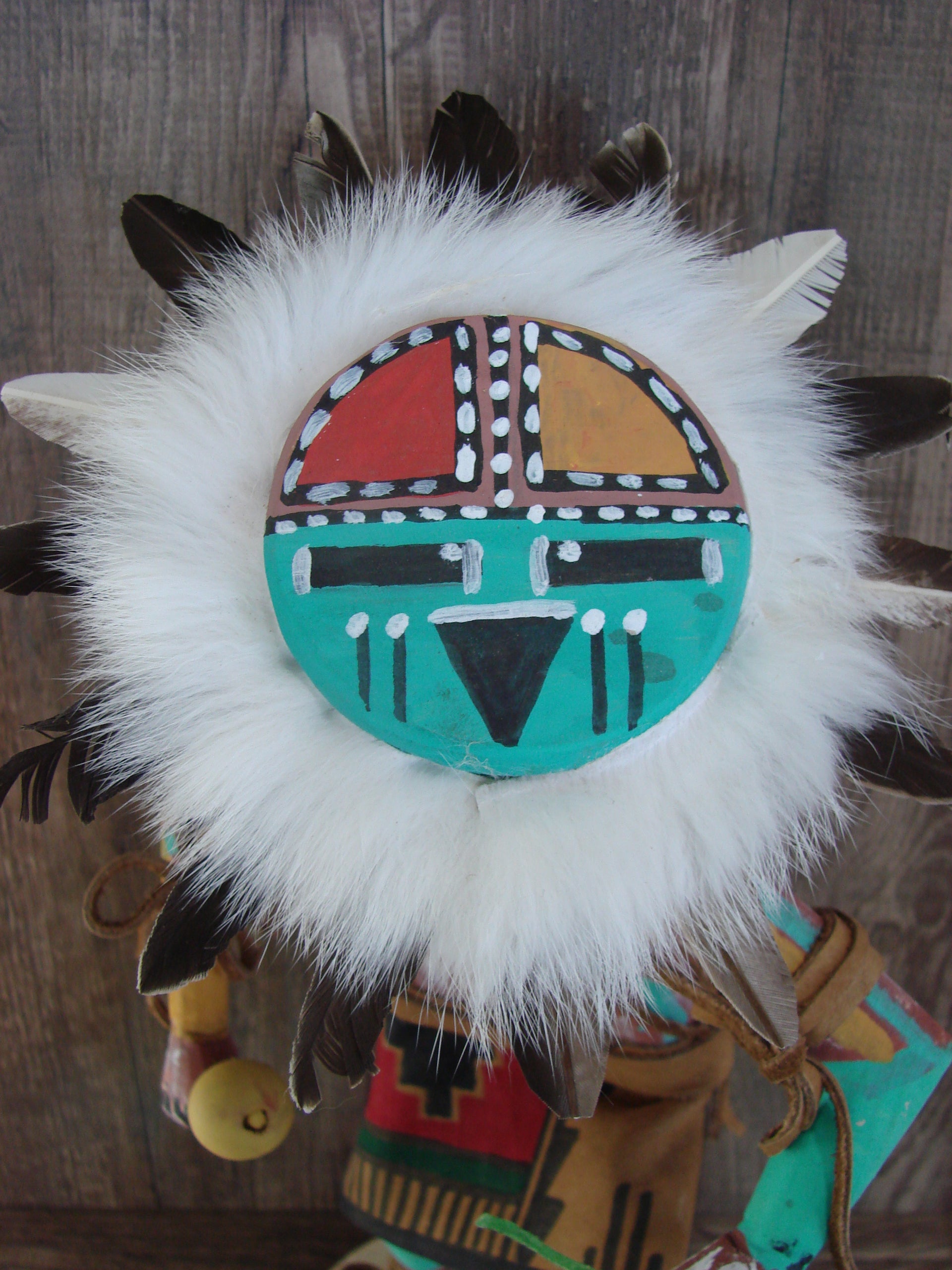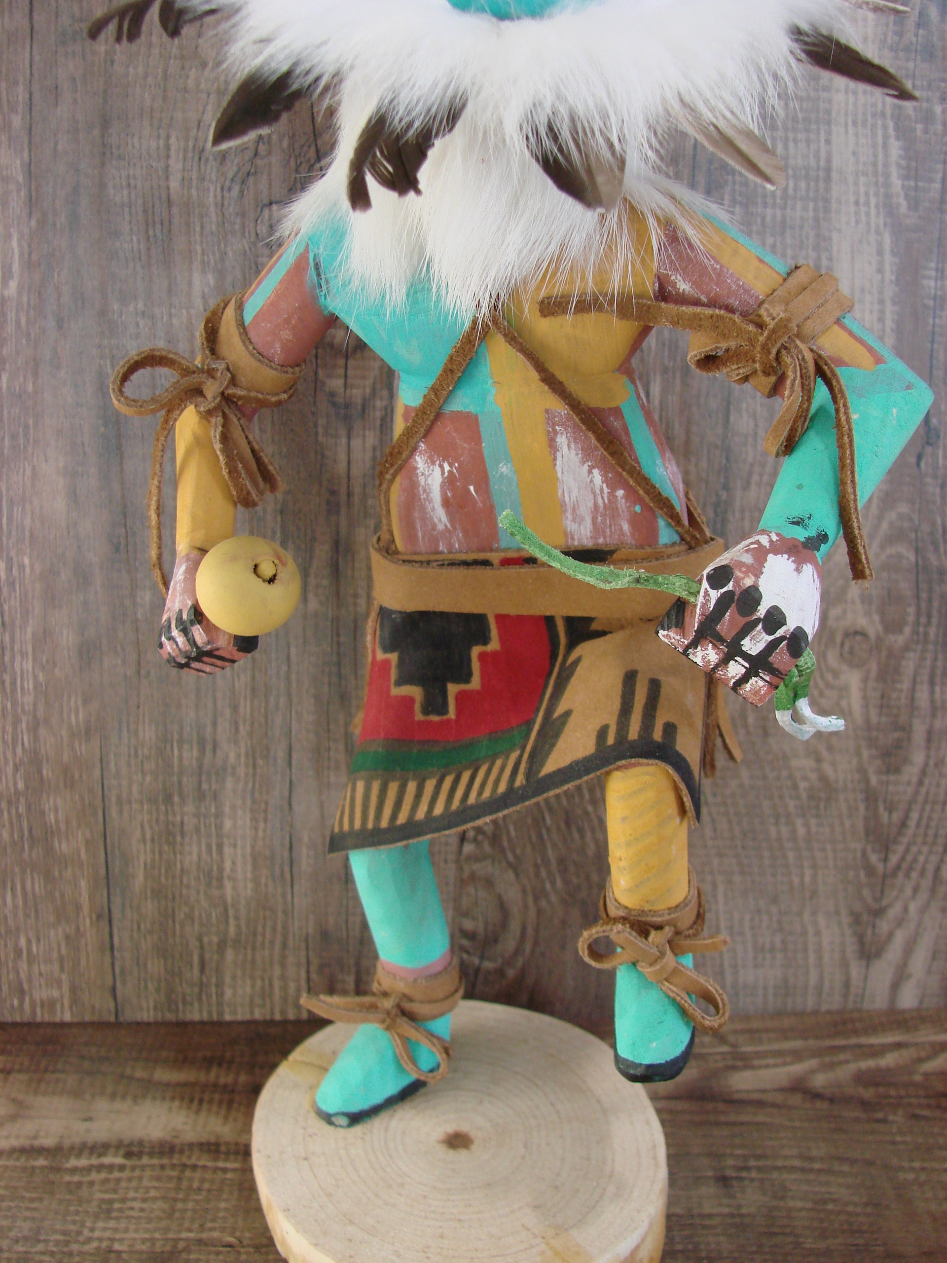 Native American Navajo Indian Kachina Dancer from the Navajo Nation. This Kachina features beautiful hand painting and hand carving from top to bottom. This Kachina is carved into pine and decorated with feathers, Rabbit Fur, and leather. Navajo Indian Handmade and Signed by Randy Tsosie on the base. Free shipping included!