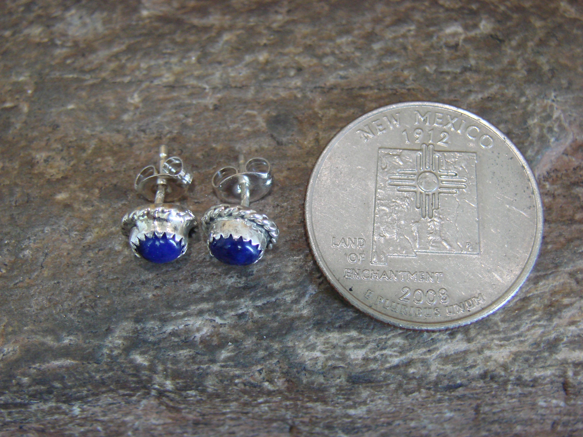 Native American Navajo Indian Lapis Stud Post Earrings from Western New Mexico. These beautiful 1/4" Round earrings feature Dark Blue Lapis stones set into beautiful crown sterling silver bezel settings. The sterling silver work surrounding the earrings is very nicely detailed and polished to a finish! Navajo Indian handmade by Esther White. The back is unsigned due to the size being to small. Free Shipping and Gift Box included!