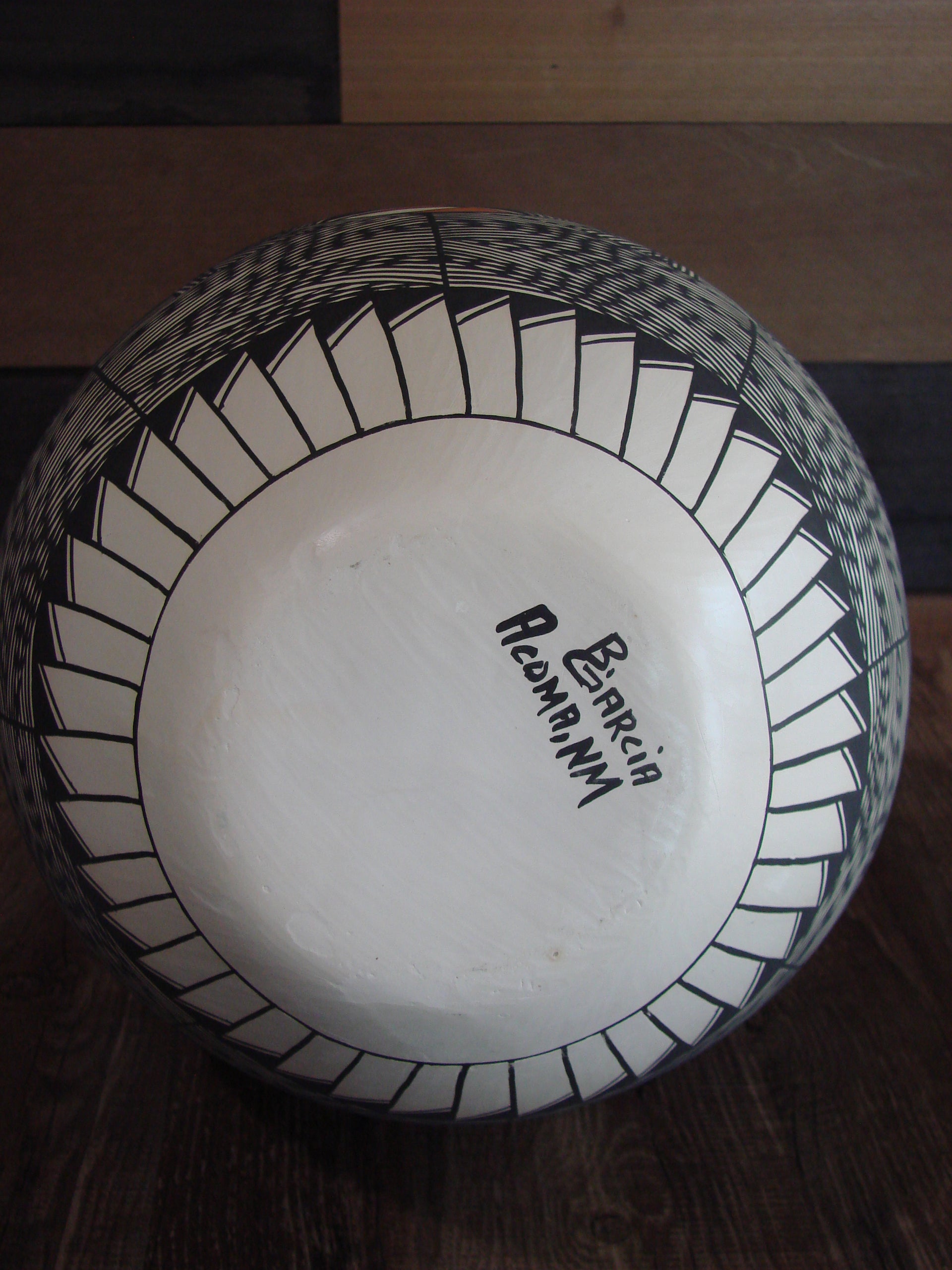 Genuine Native American Acoma Pueblo Indian Hand Painted Fine Line Wedding Vase from Western New Mexico. This Gorgeous piece of pottery features Stunning natural pigment hand painted patterns throughout. The detail is exquisite! Masterfully Hand painted by Acoma artist B. Garcia. The bottom is signed "B Garcia Acoma N.M". Free Shipping included!