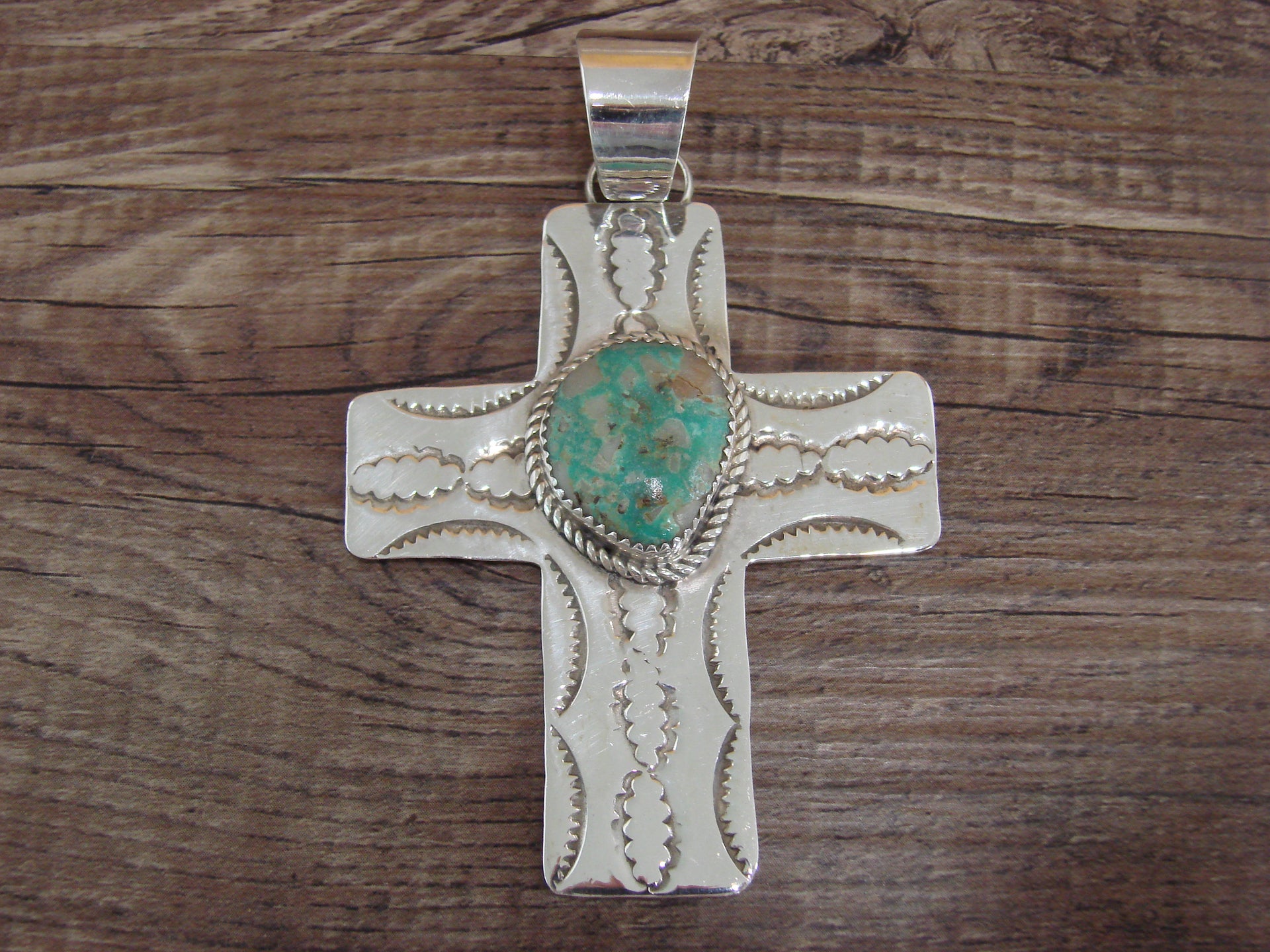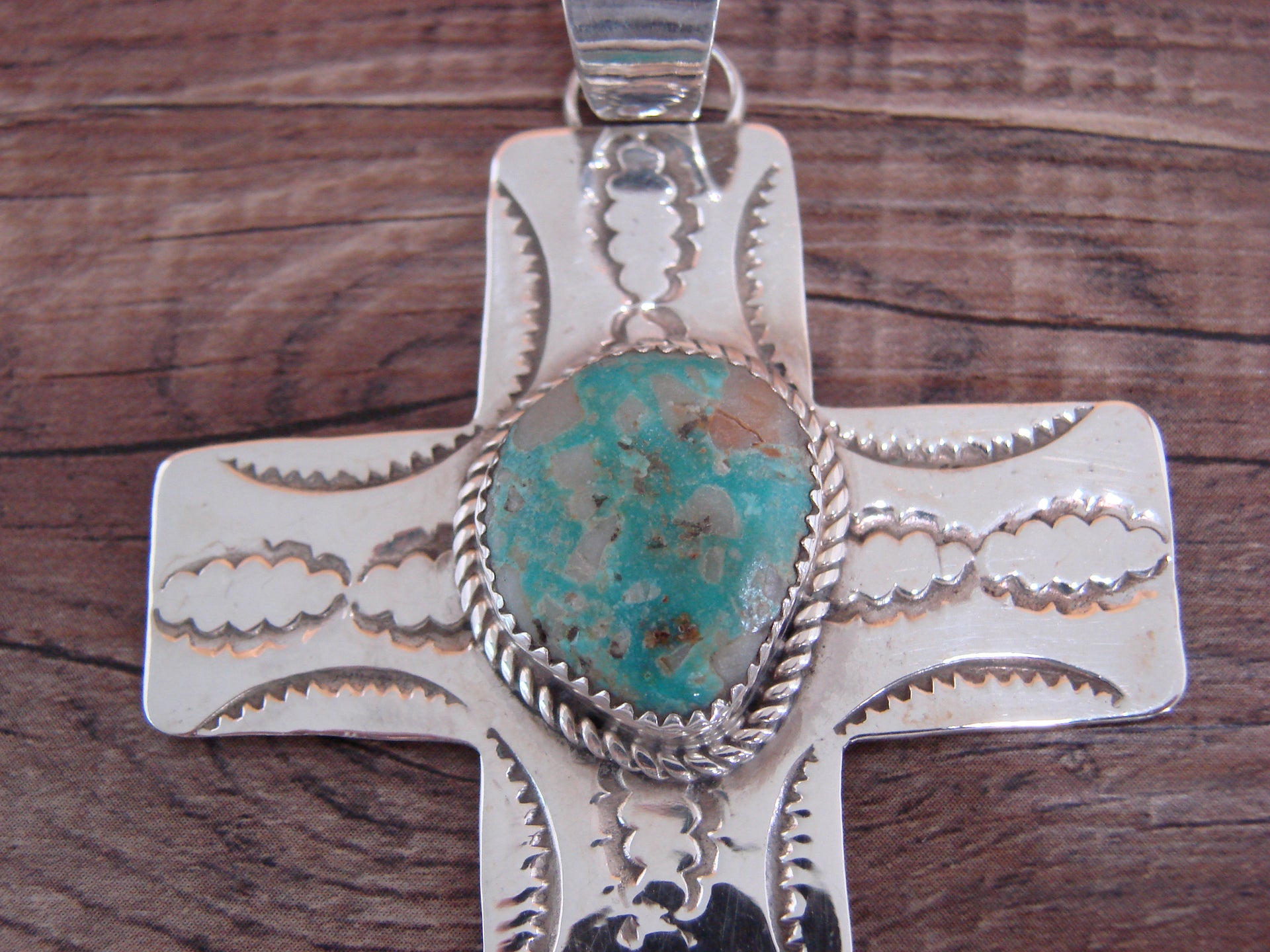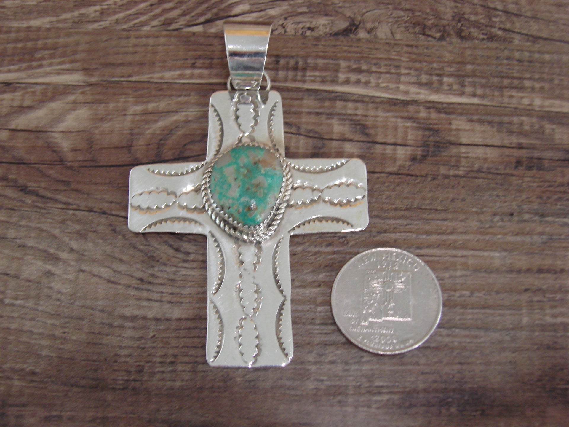 - Large Navajo Sterling Silver & Turquoise Cross Pendant Signed Cleveland