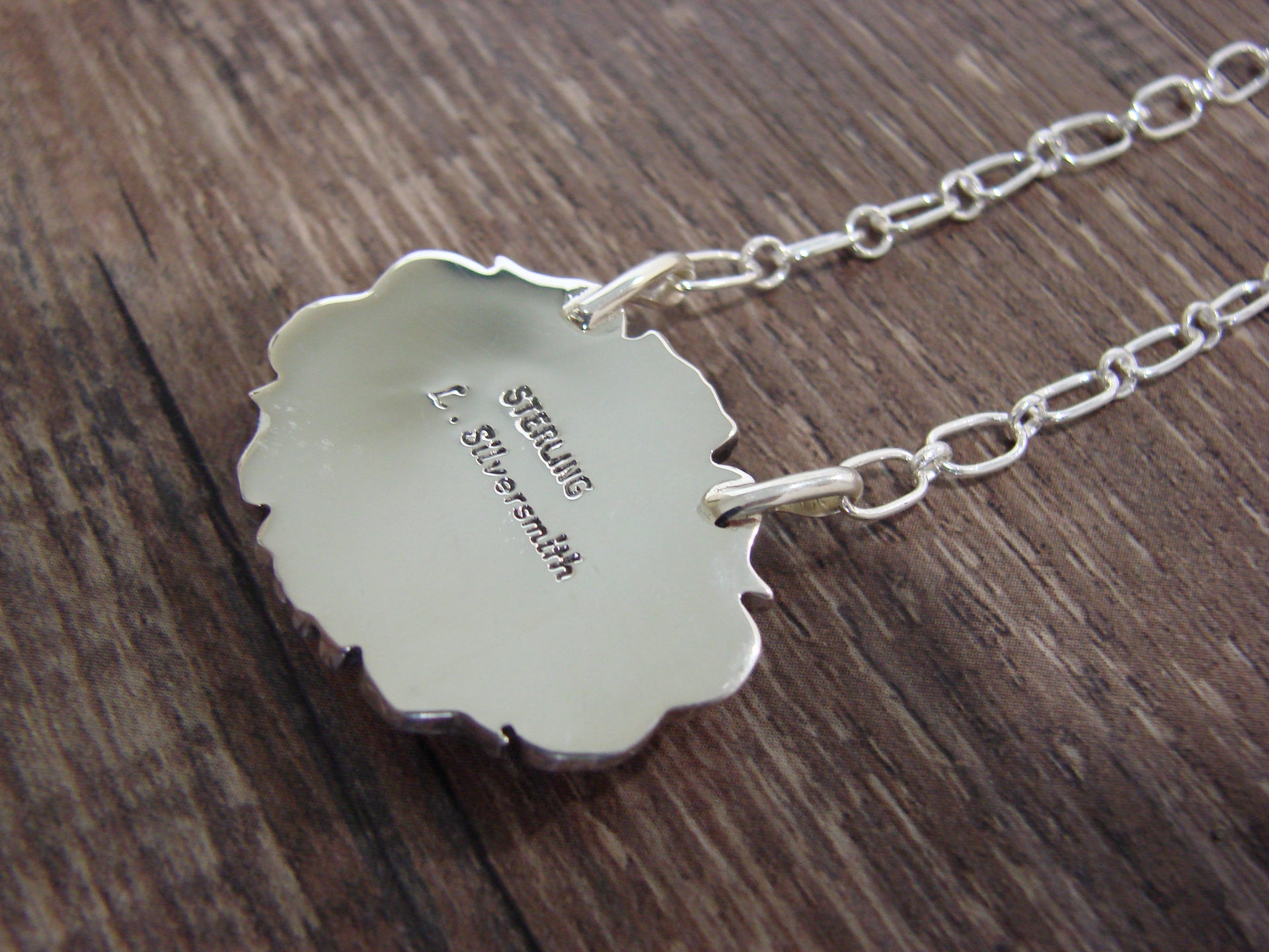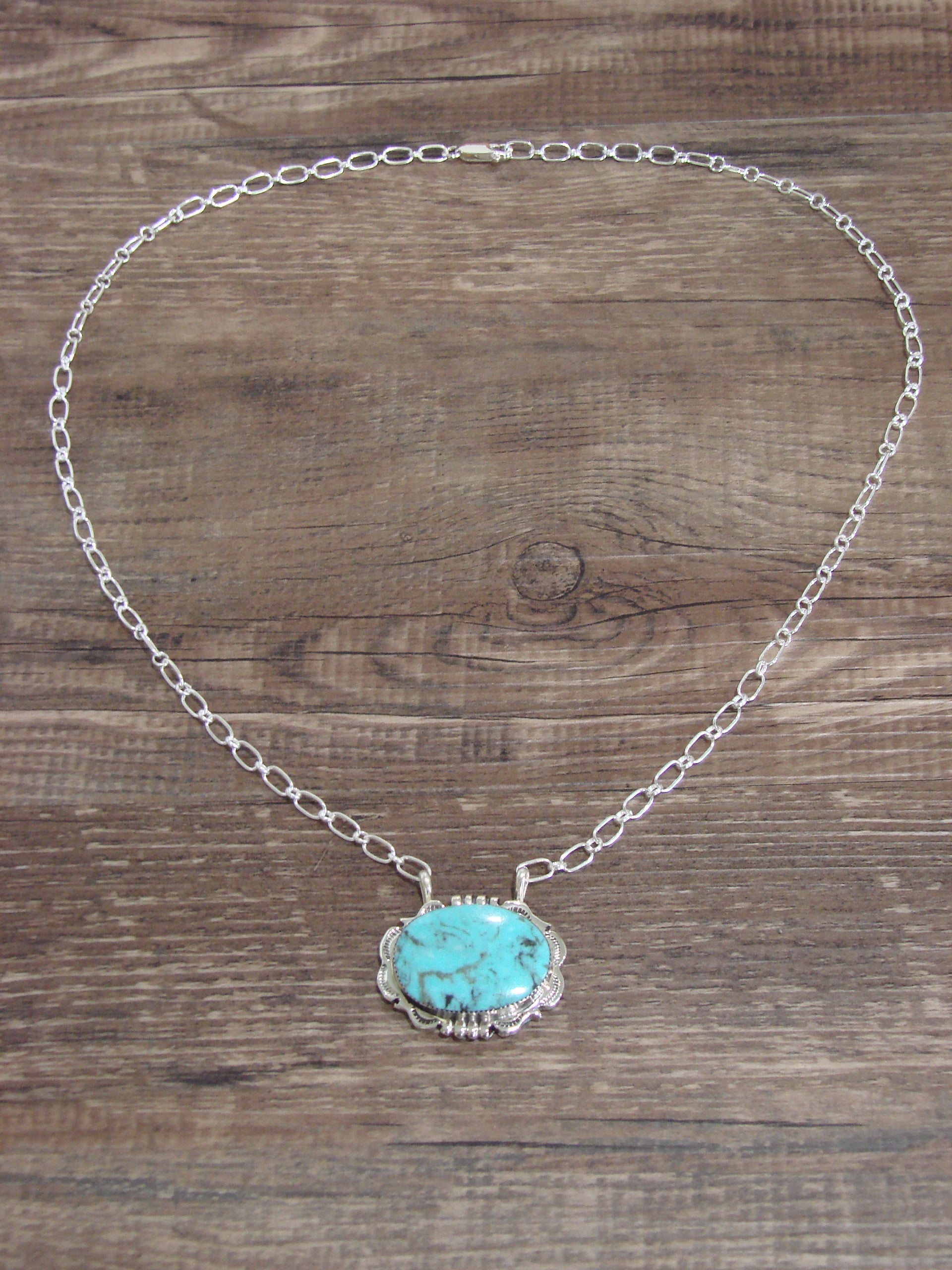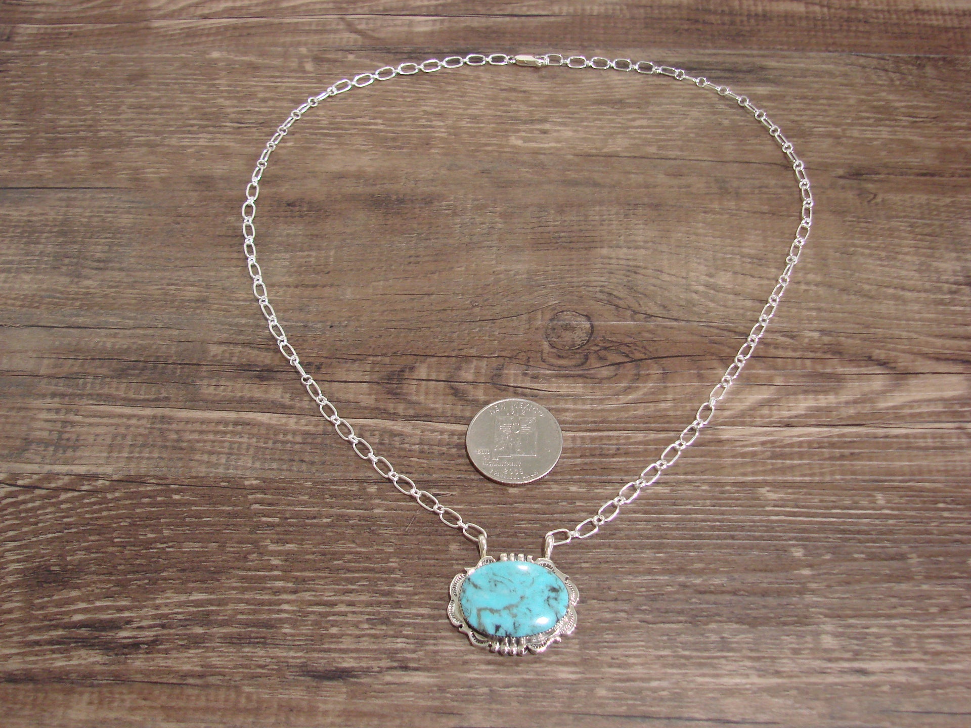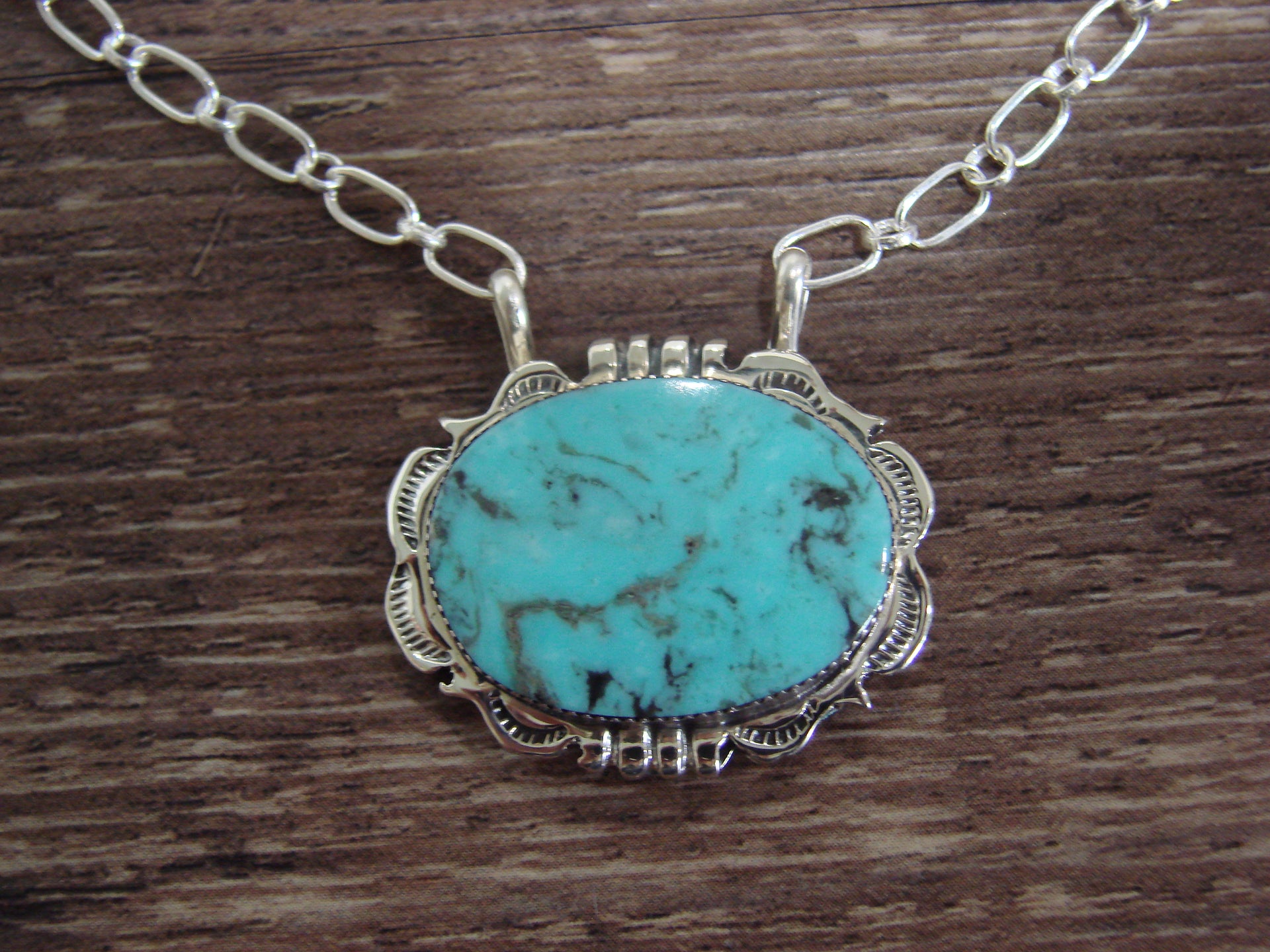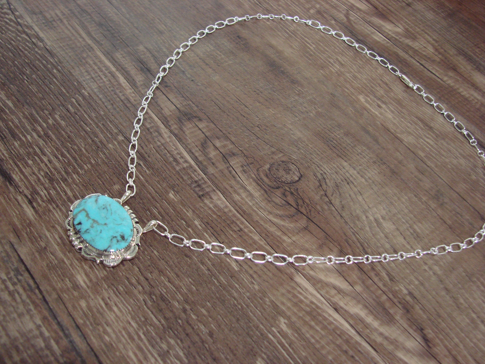 Genuine Native American Navajo Indian Sterling Silver & Turquoise Chain Link Necklace. This Stunning Hand Made necklace features a Genuine Turquoise Stone intricately set into a Crown Sterling Silver bezel setting. Beautiful details in Sterling Silver and Hand Stamping surround the stone. This is a great necklace that can be adjusted to desired length with the Hade Made Sterling Silver links! Expertly Handmade by Navajo silversmith Leroy Silversmith. Signed & Stamped Sterling on the back. Free gift box and shipping included!