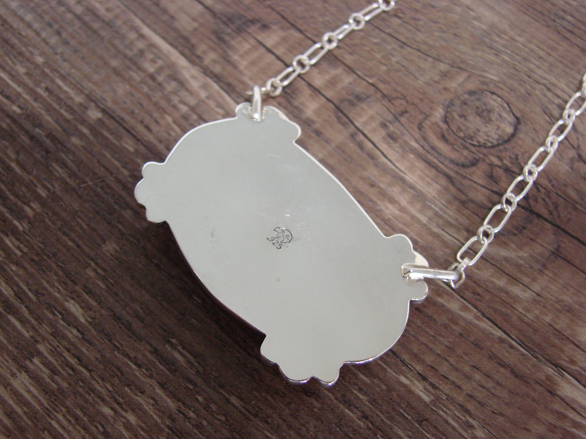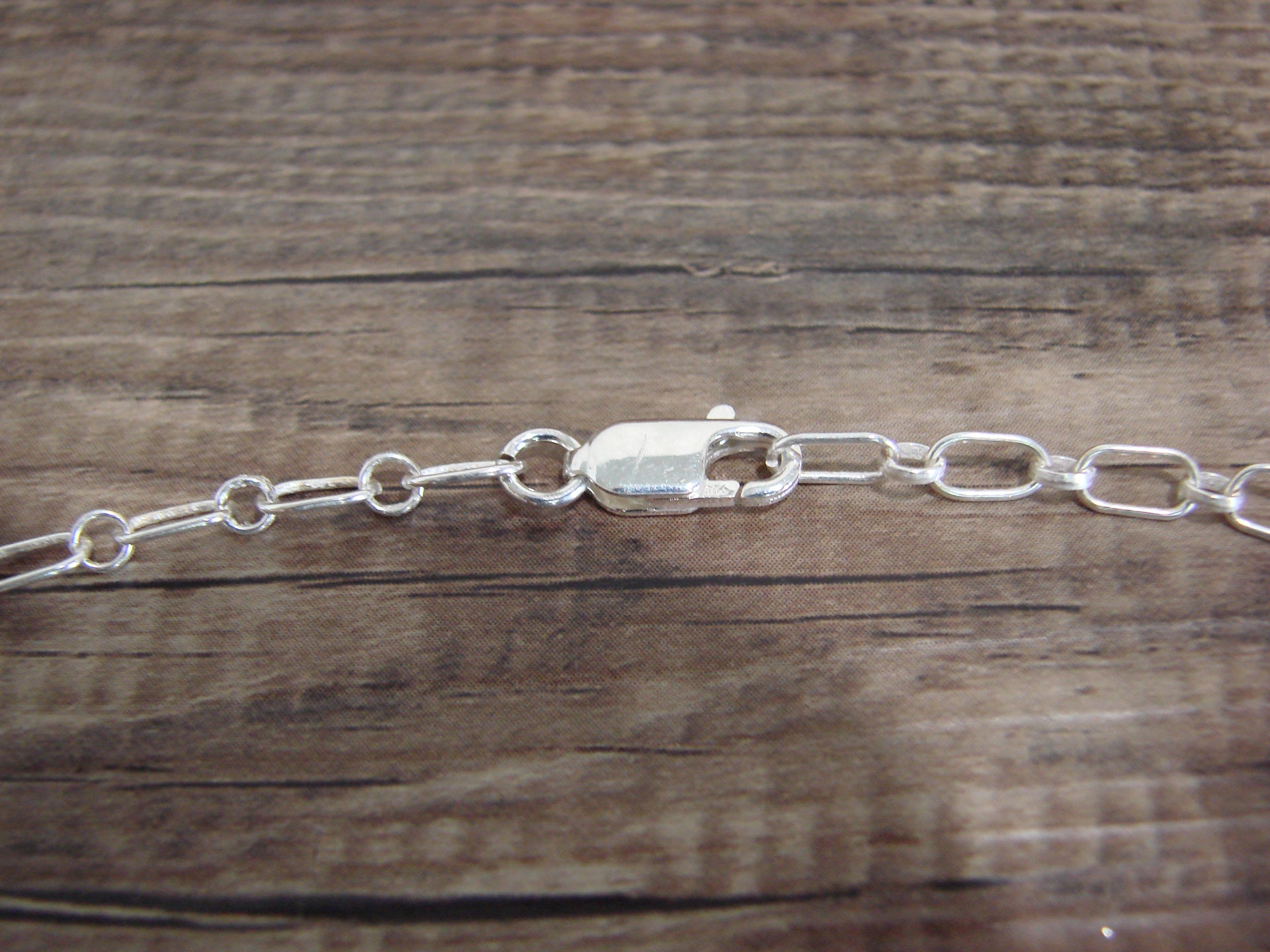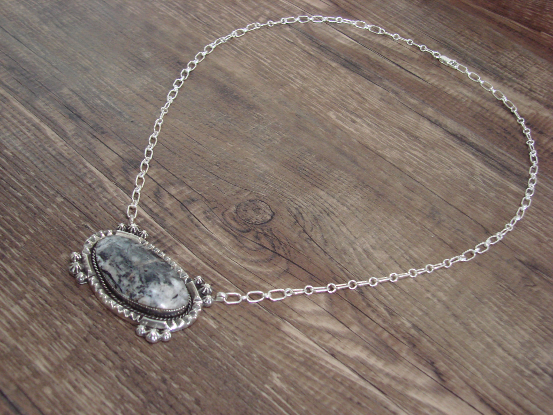 Genuine Native American Navajo Indian Sterling Silver & White Buffalo Turquoise Chain Link Necklace. This Stunning Hand Made necklace features a Genuine White Buffalo Turquoise Stone intricately set into a Crown Sterling Silver bezel setting. Beautiful details in Sterling Silver and Hand Stamping surround the stone. This is a great necklace that can be adjusted to desired length with the Hade Made Sterling Silver links! Expertly Handmade by Navajo silversmith Jimson Belin. Hallmarked on the back. Free gift box and shipping included!