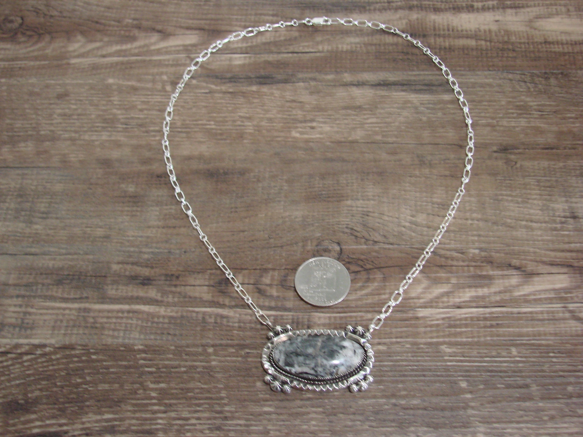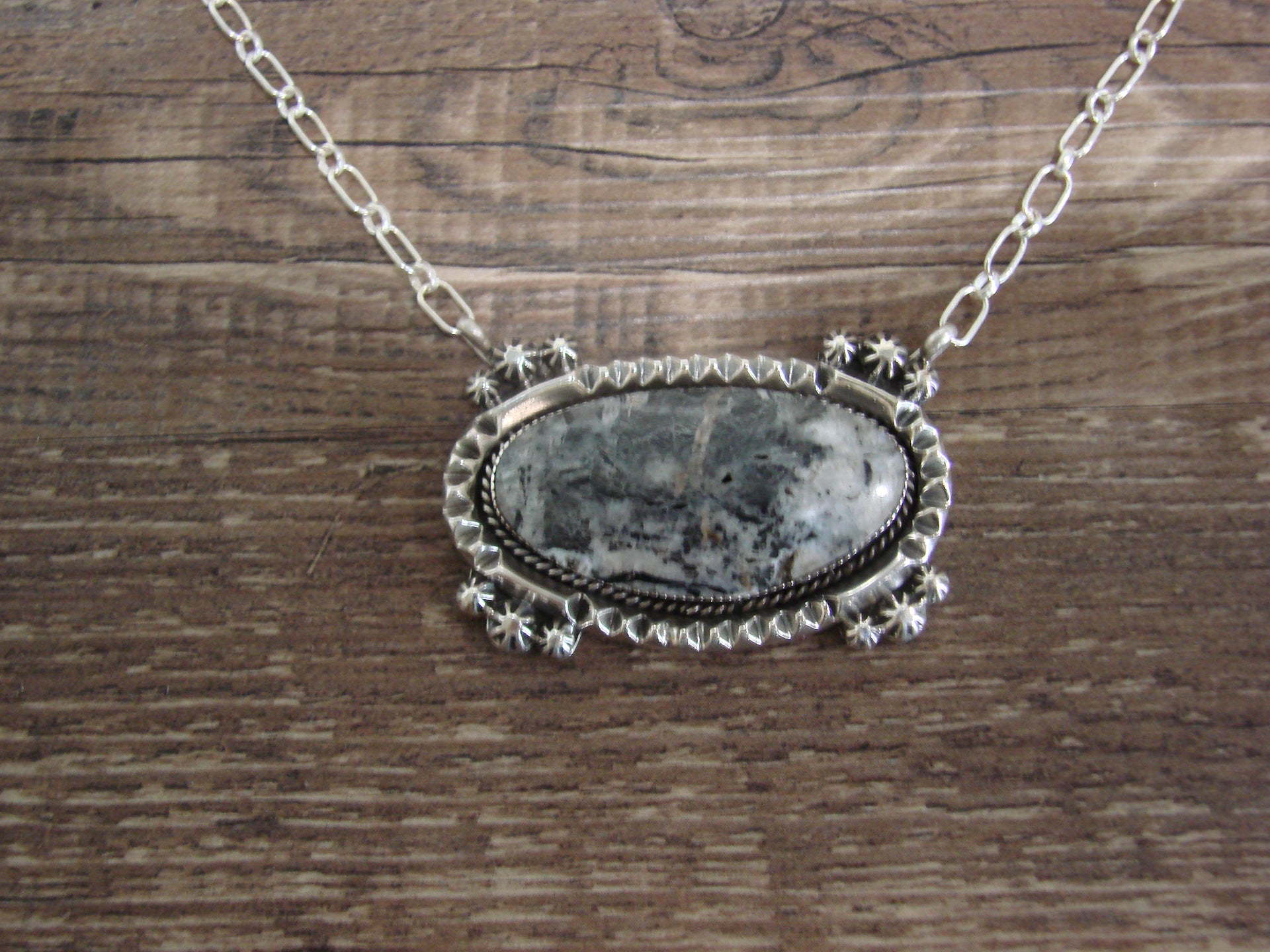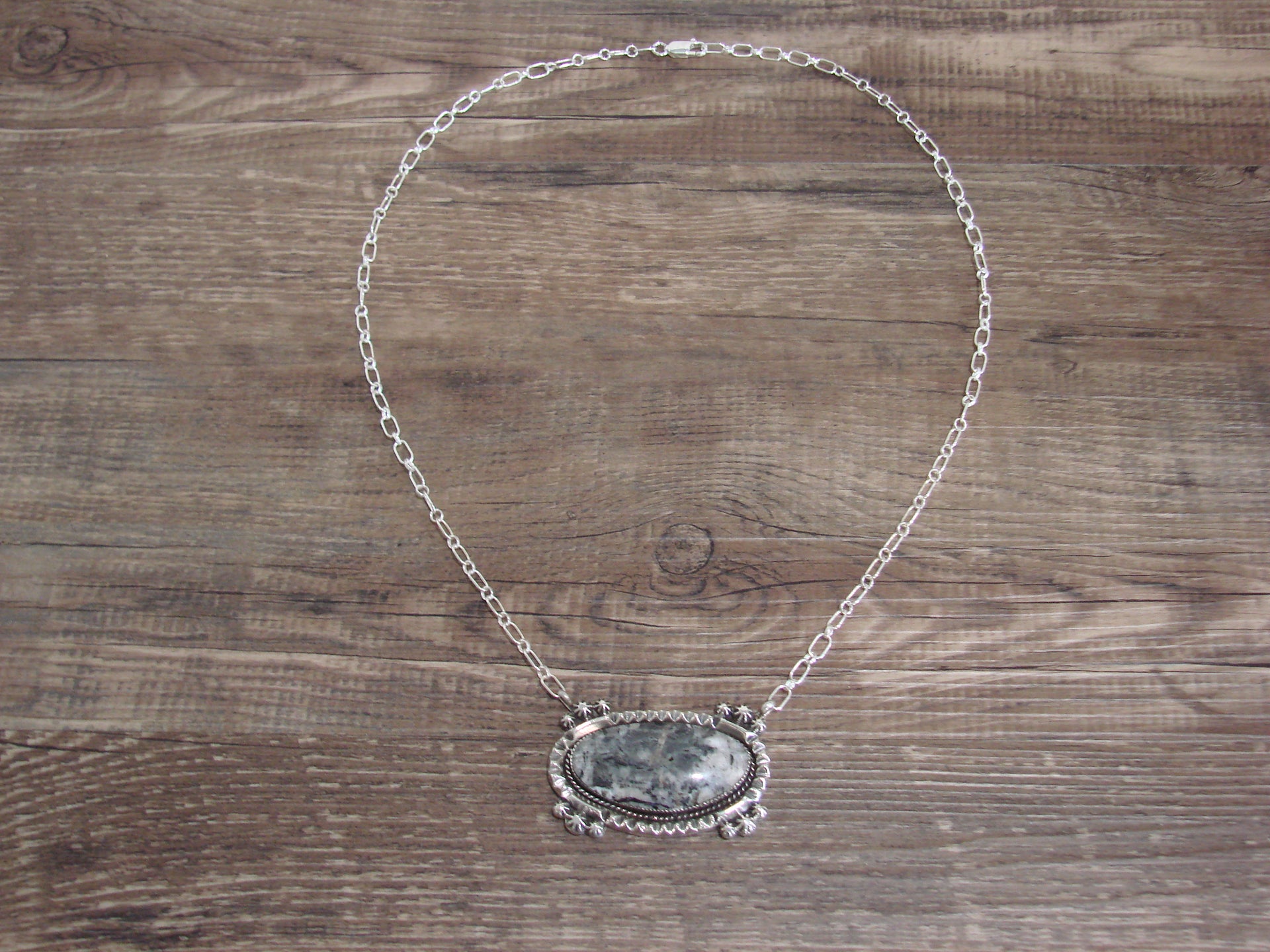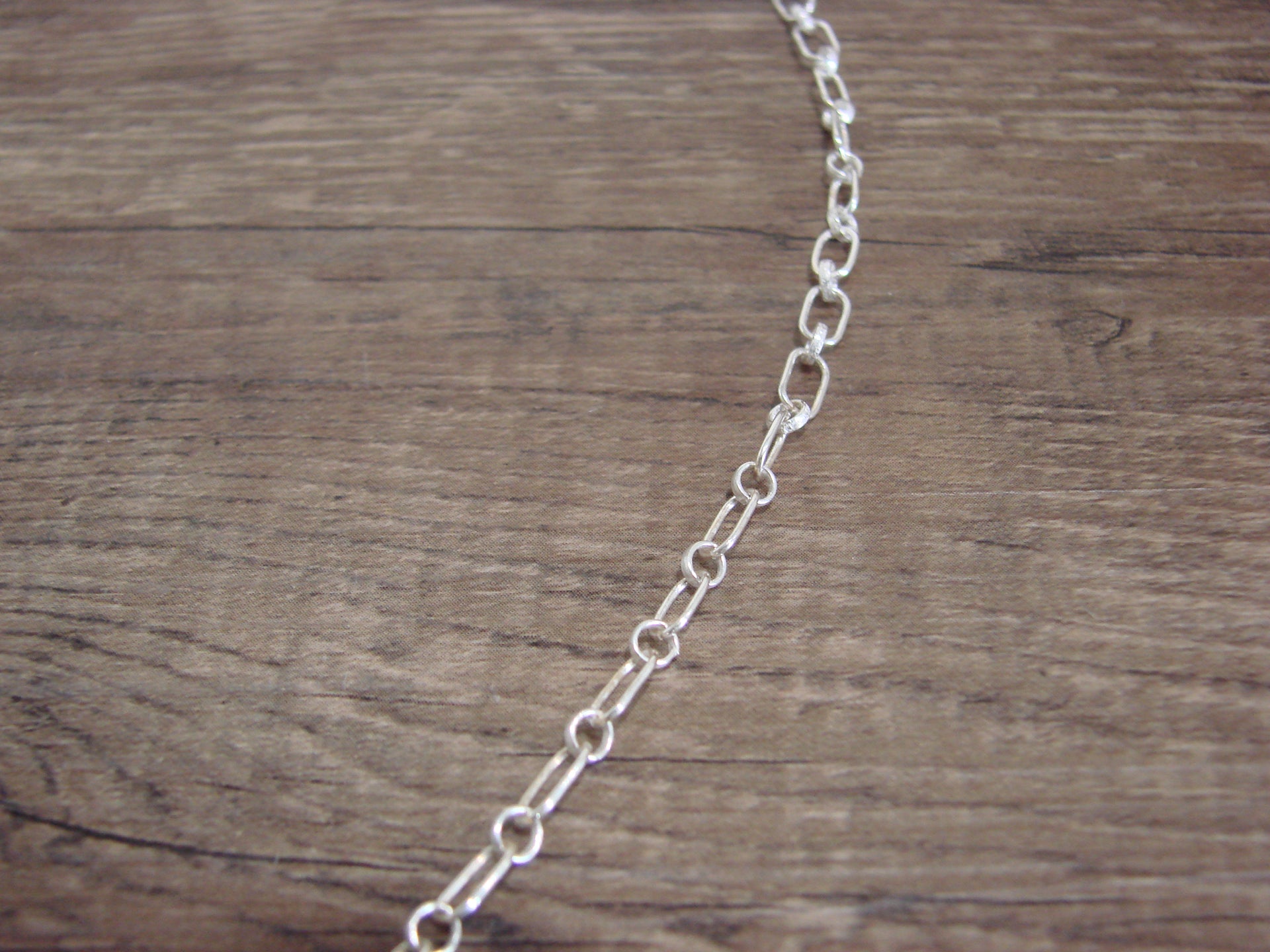Genuine Native American Navajo Indian Sterling Silver & White Buffalo Turquoise Chain Link Necklace. This Stunning Hand Made necklace features a Genuine White Buffalo Turquoise Stone intricately set into a Crown Sterling Silver bezel setting. Beautiful details in Sterling Silver and Hand Stamping surround the stone. This is a great necklace that can be adjusted to desired length with the Hade Made Sterling Silver links! Expertly Handmade by Navajo silversmith Jimson Belin. Hallmarked on the back. Free gift box and shipping included!