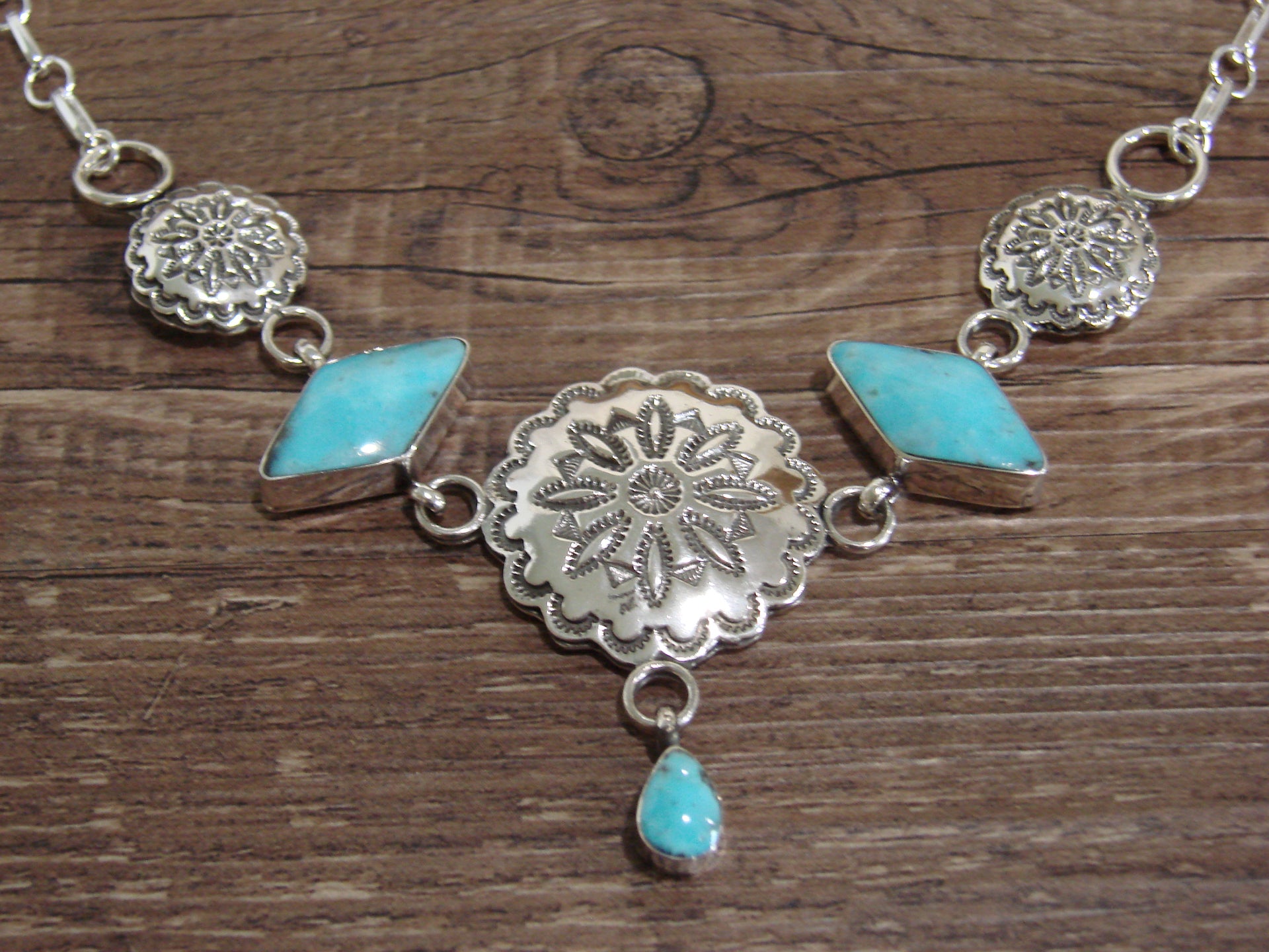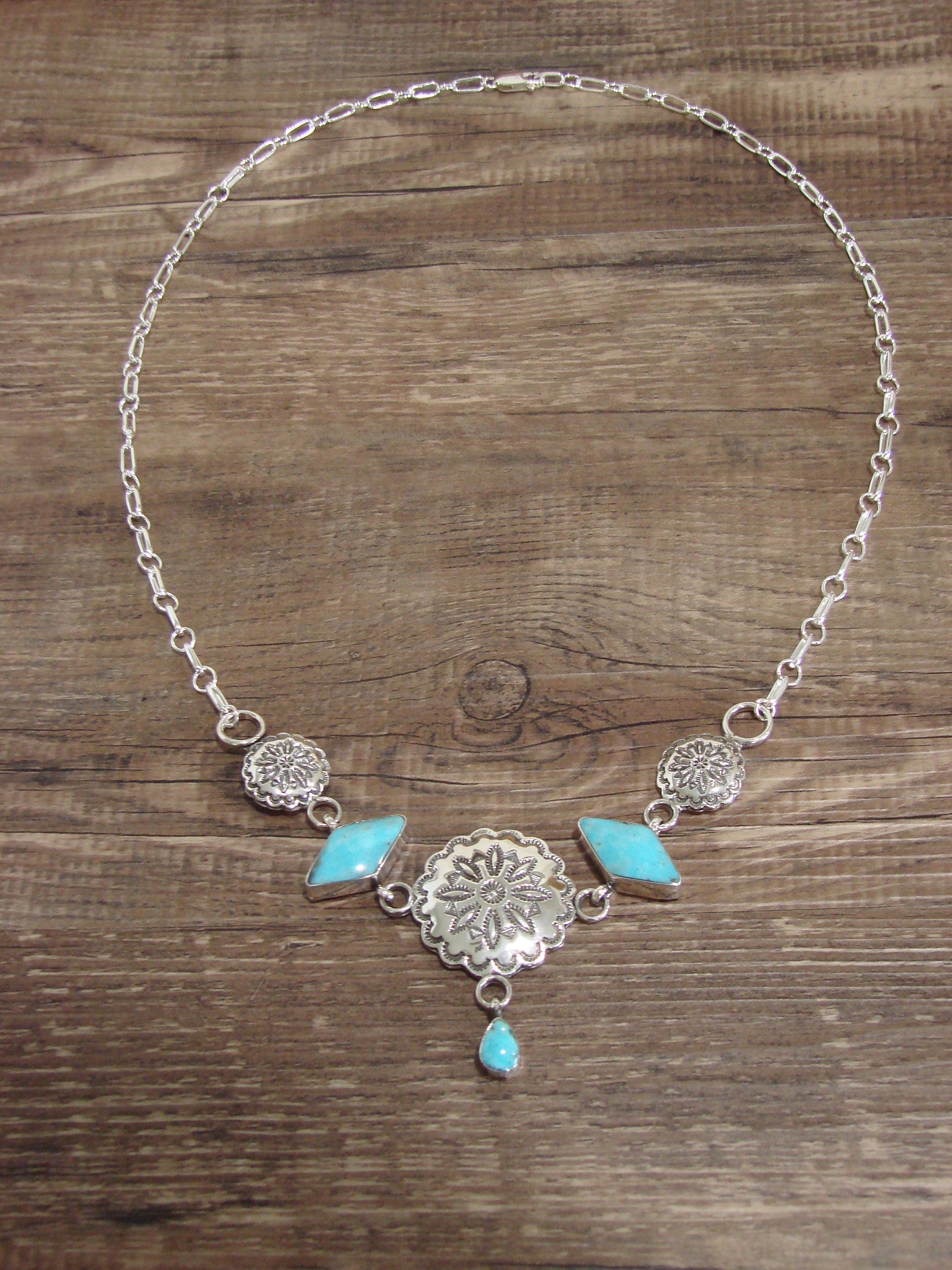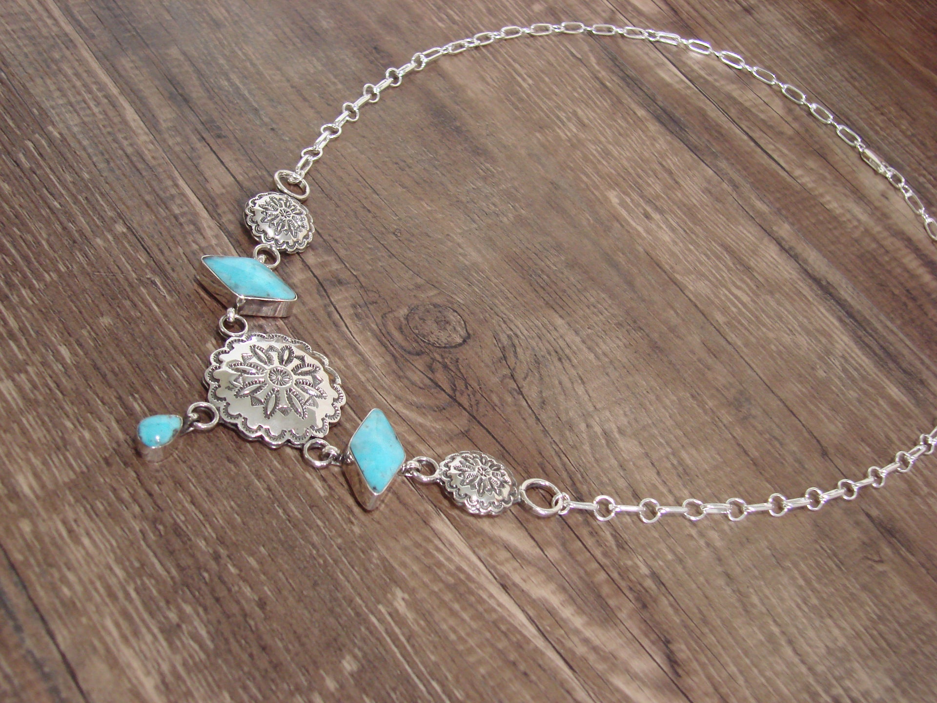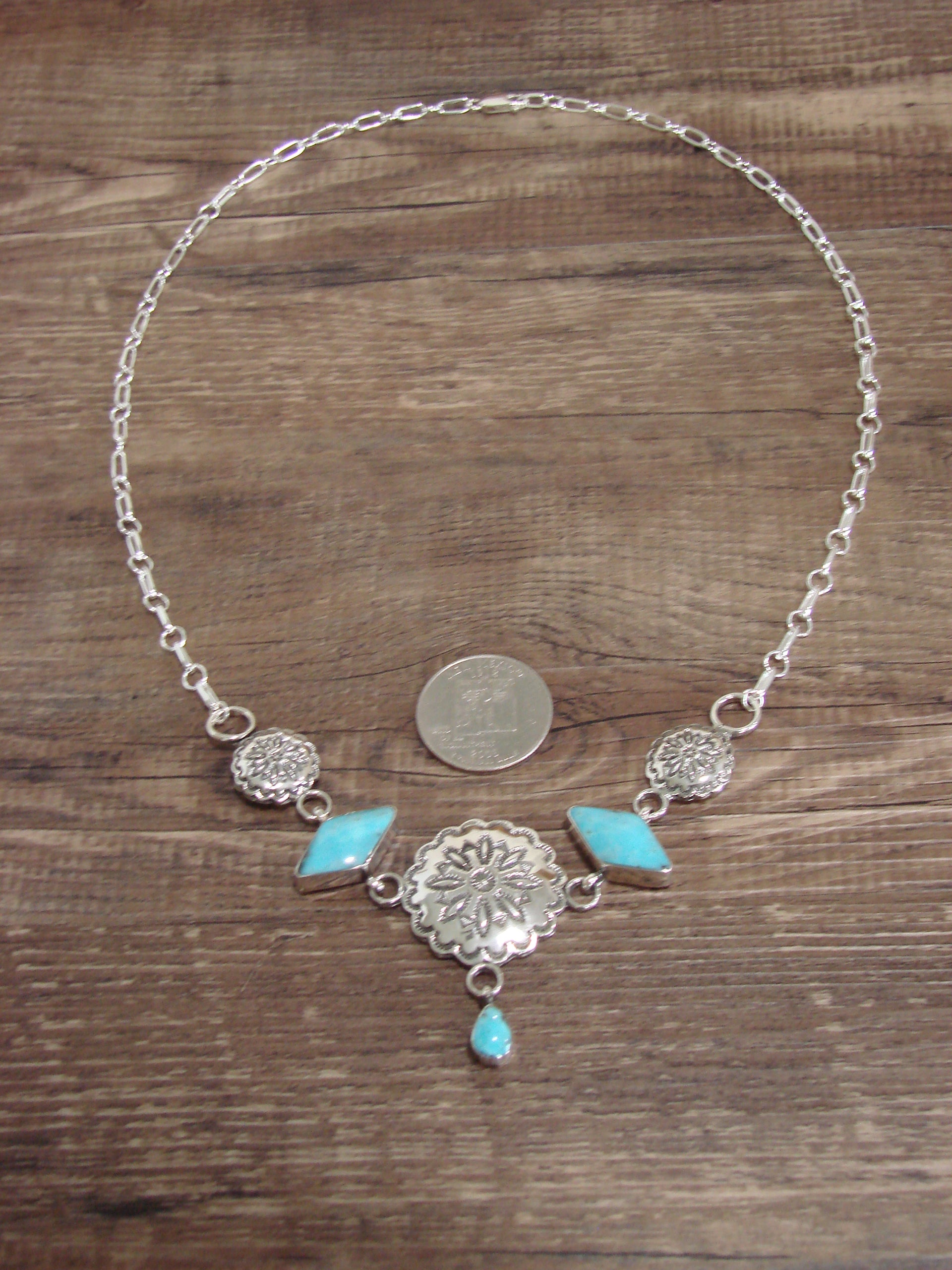 Native American 21" Sterling Silver & Turquoise Concho Link Necklace by Burnside