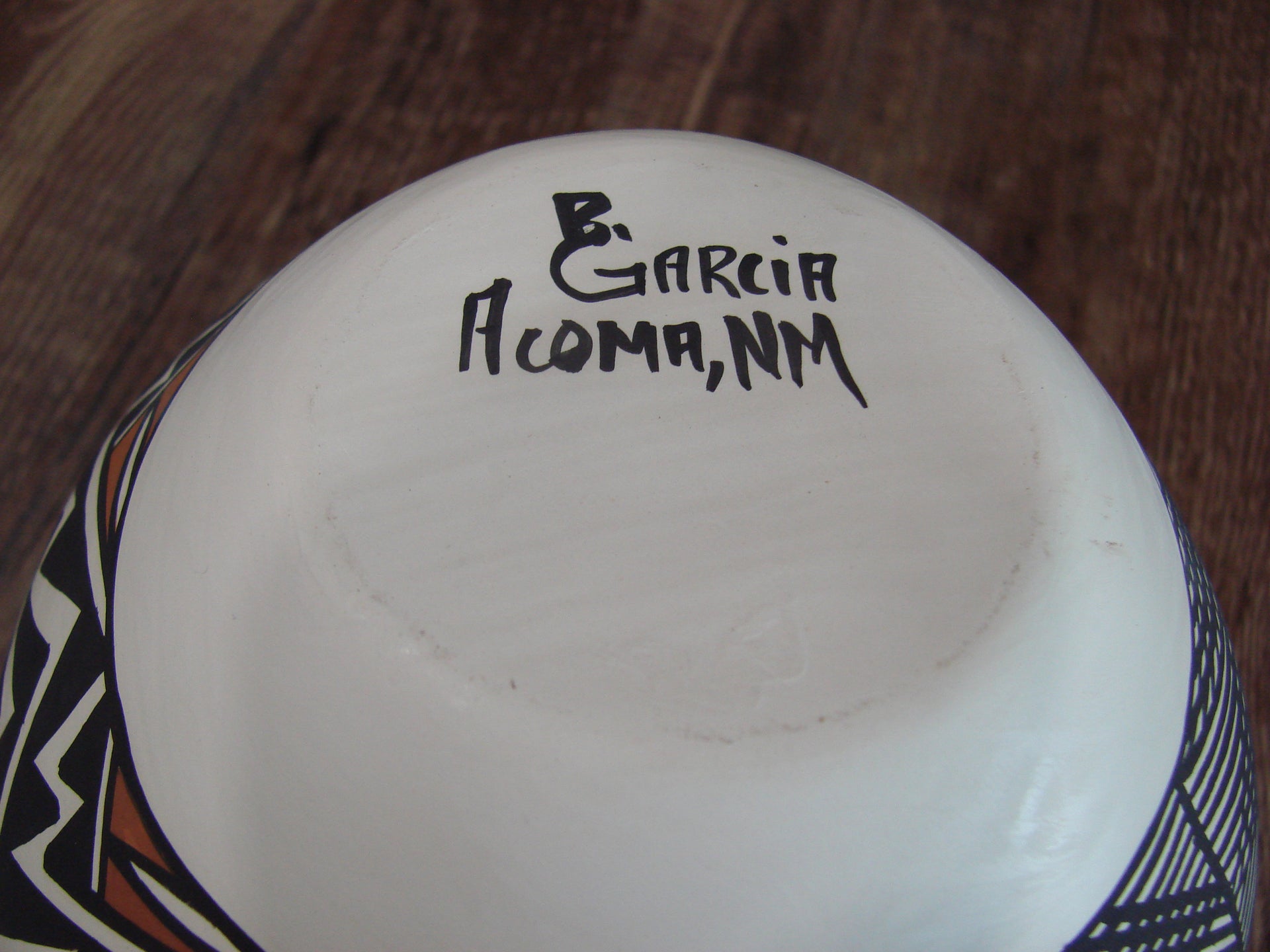 Genuine Native American Acoma Pueblo Indian Hand Painted Fine Line Pottery from Western New Mexico. This Gorgeous piece of pottery features Stunning natural pigment hand painted patterns throughout. The detail is exquisite! Masterfully Hand painted by Acoma artist B. Garcia. The bottom is signed "B Garcia Acoma N.M". Free Shipping included!