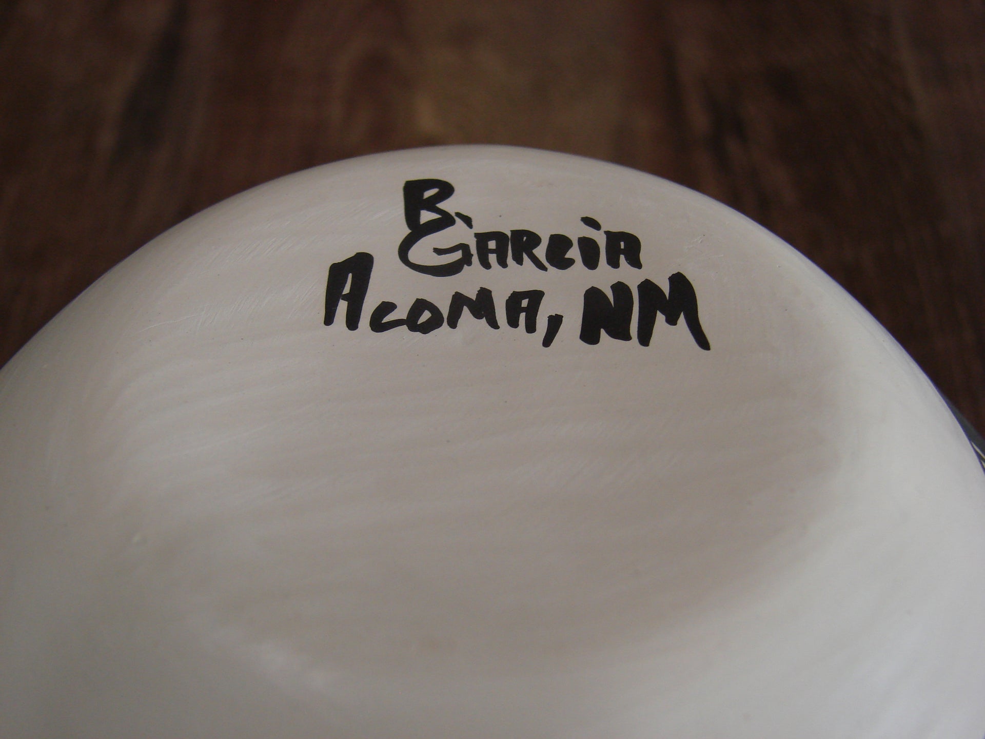 Genuine Native American Acoma Pueblo Indian Hand Painted Fine Line Pottery from Western New Mexico. This Gorgeous piece of pottery features Stunning natural pigment hand painted patterns throughout. The detail is exquisite! Masterfully Hand painted by Acoma artist B. Garcia. The bottom is signed "B Garcia Acoma N.M". Free Shipping included!