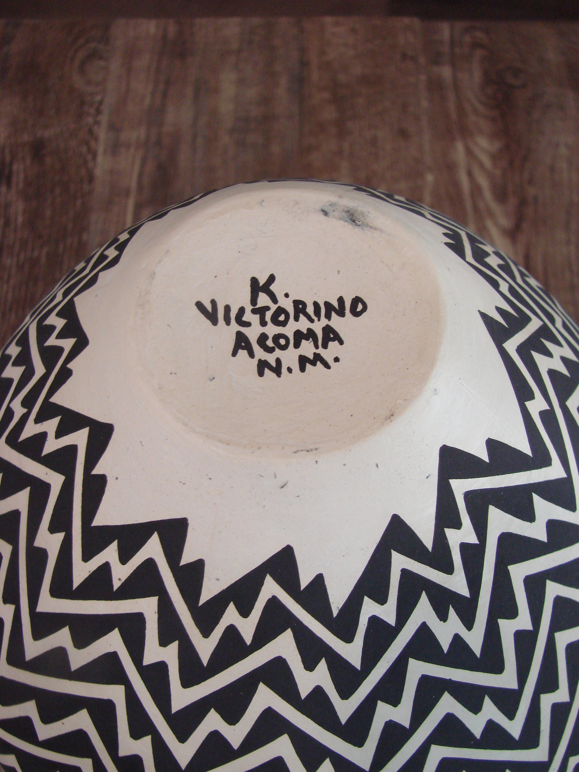 Genuine Native American Acoma Pueblo Indian Hand Coiled and Hand Painted Fine Line Pottery from Western New Mexico. This piece of pottery features Stunning natural pigment and hand painted patterns throughout. The detail is exquisite! Masterfully Hand Made by Acoma artist K. Victorino. The bottom is signed. Free Shipping included!