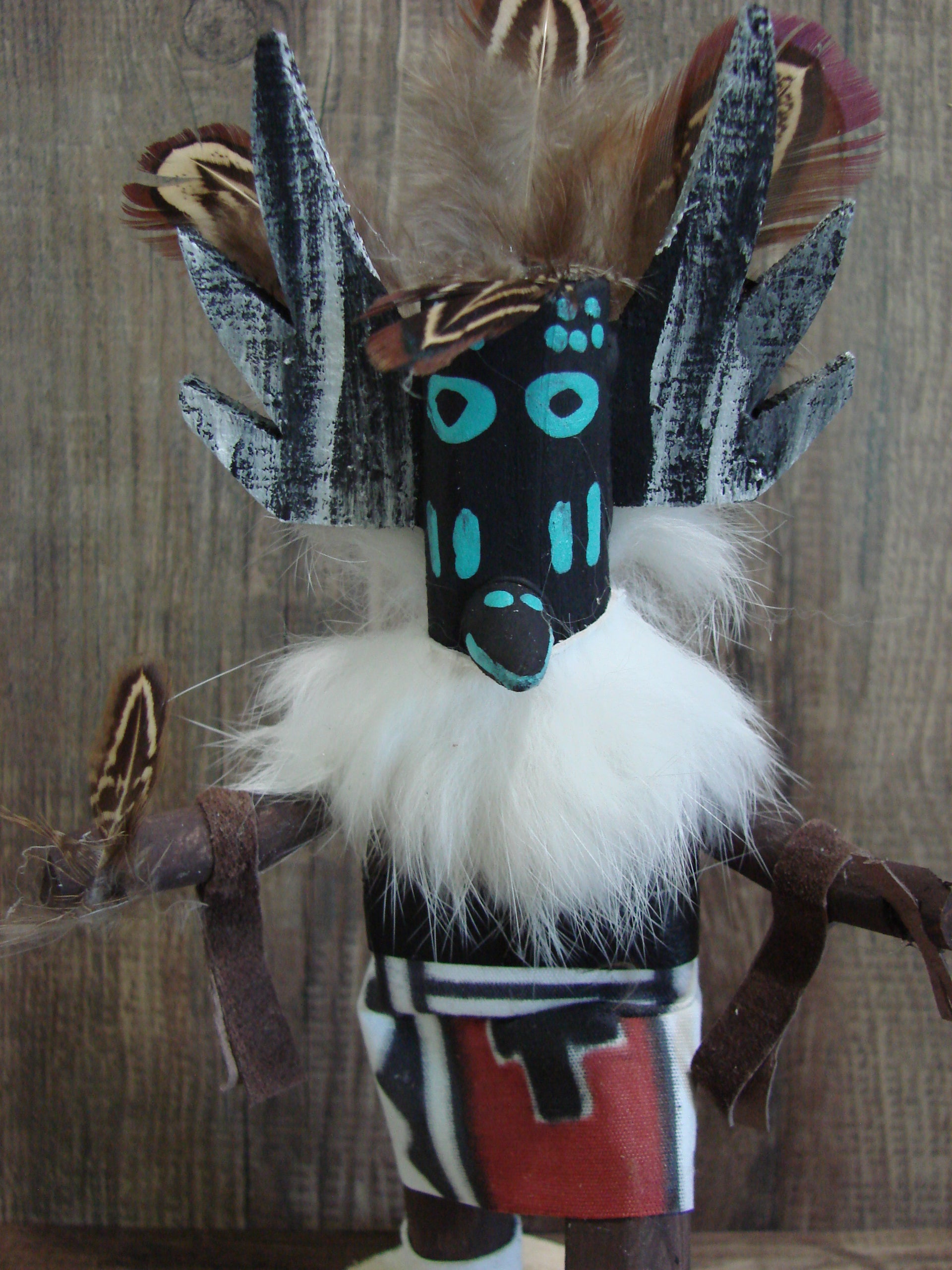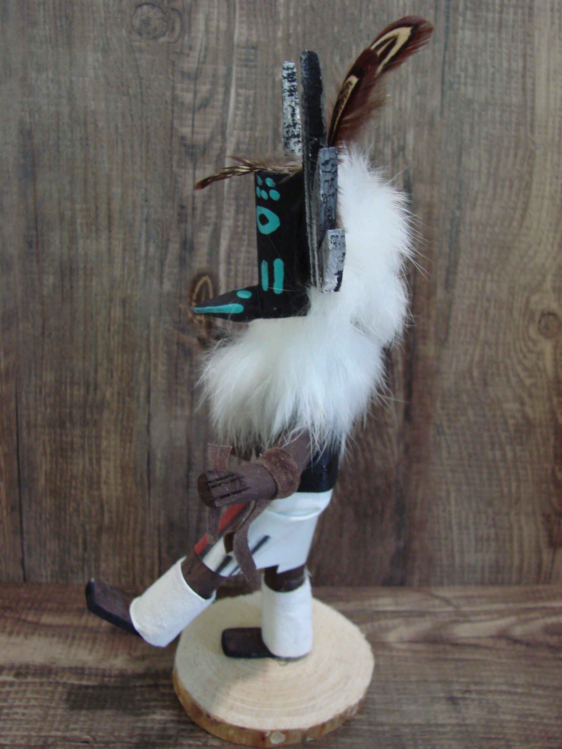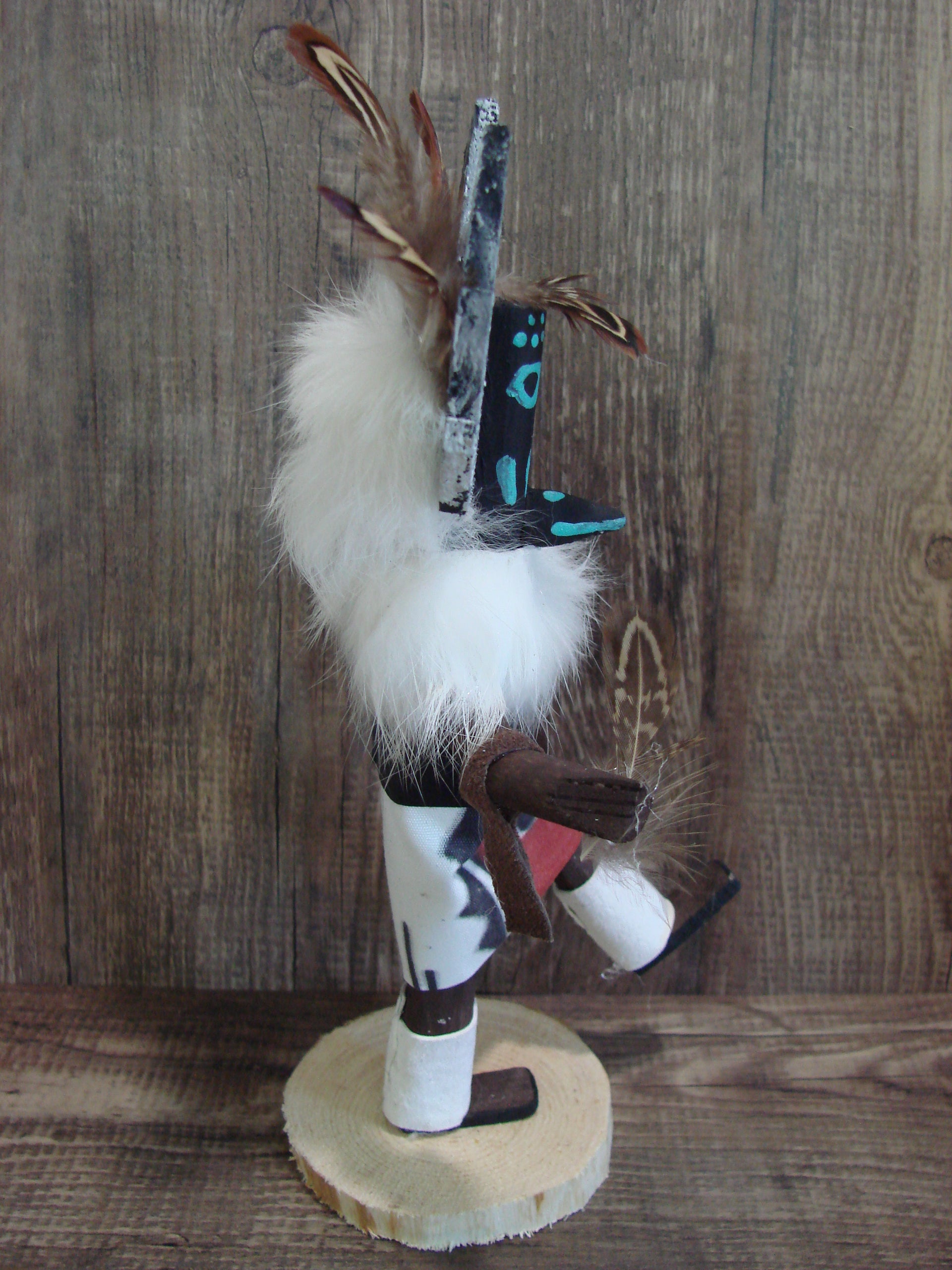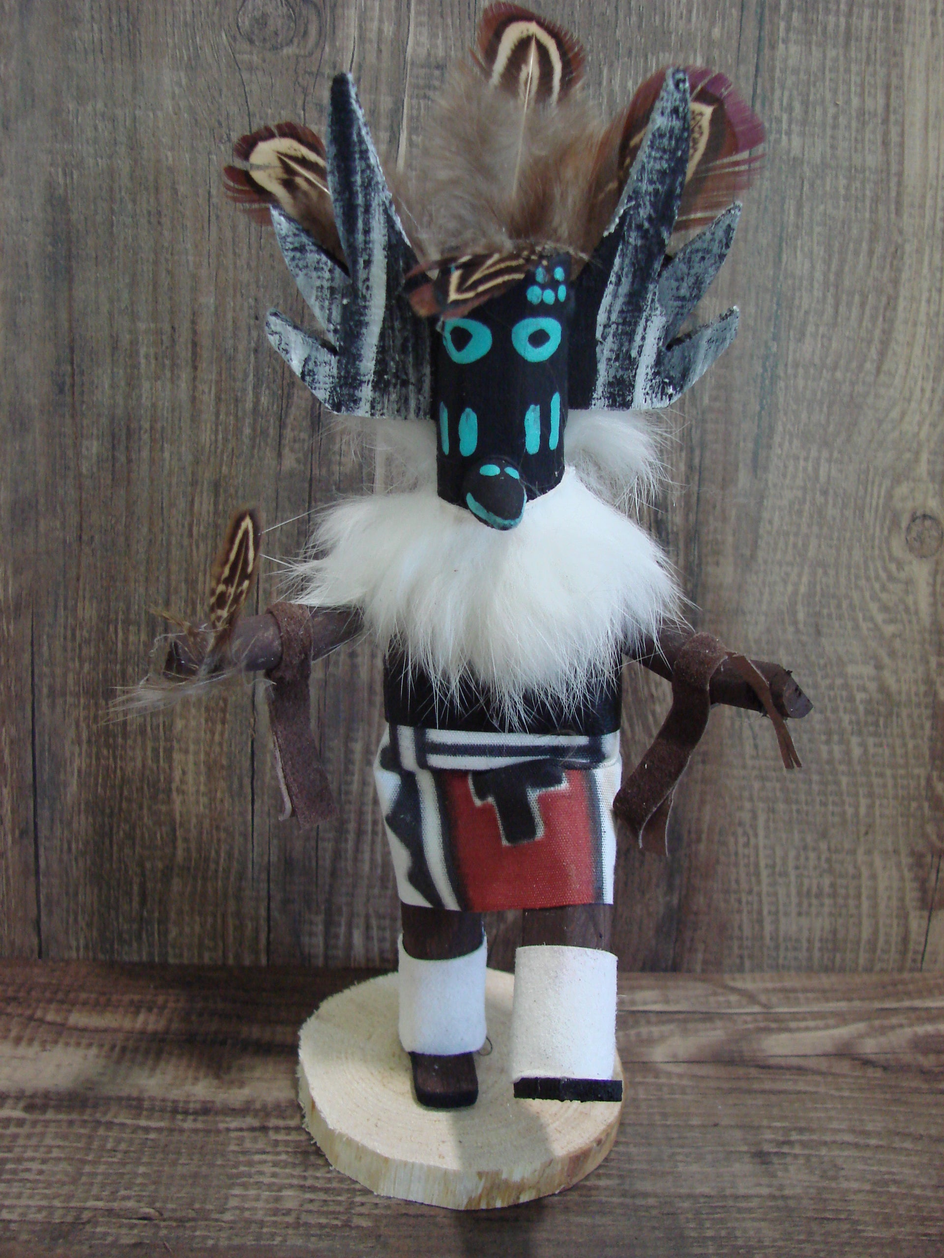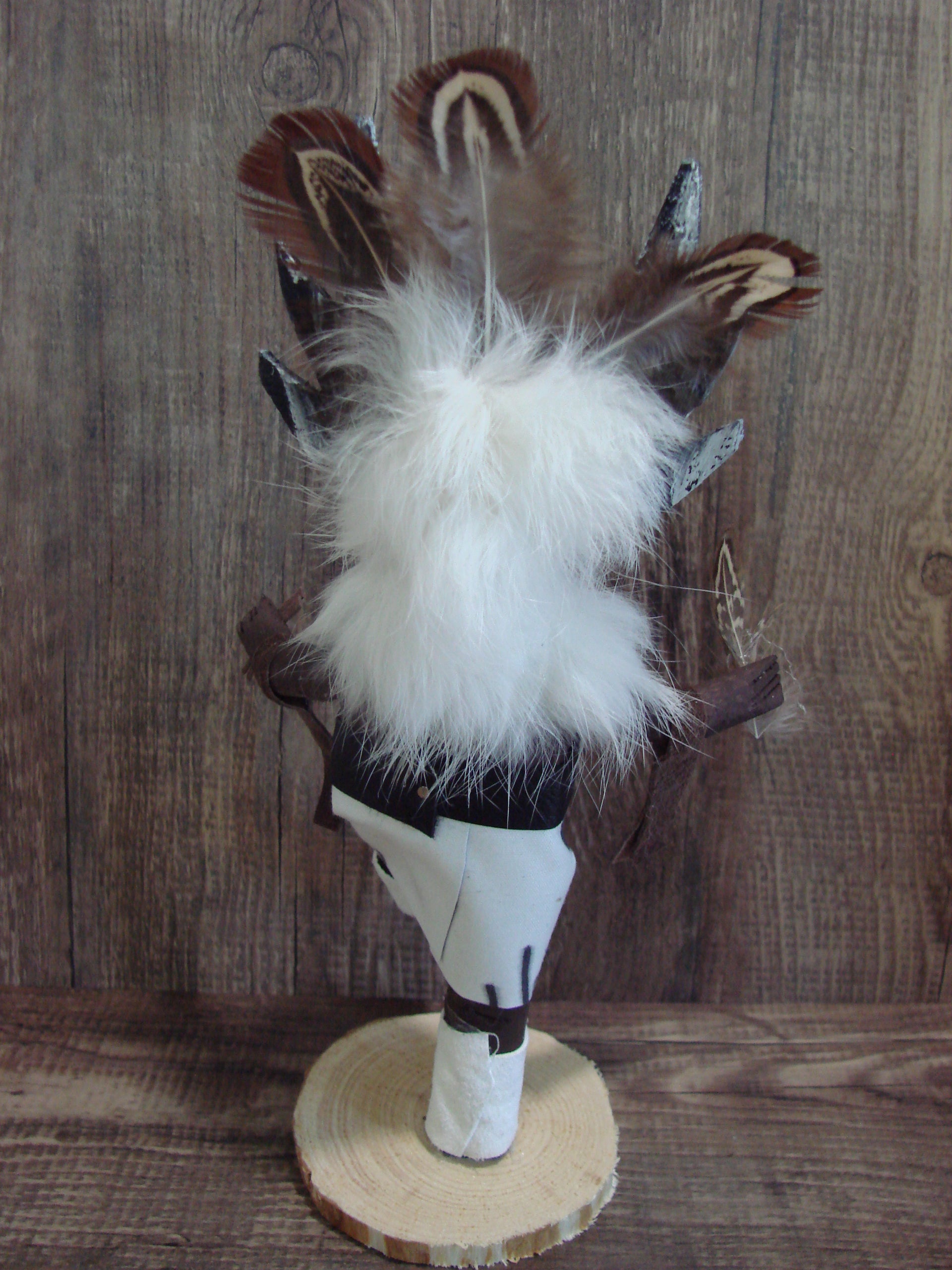 Native American Navajo Indian Kachina Dancer from the Navajo Nation. This Kachina features beautiful hand painting and hand carving from top to bottom. This Kachina is carved into pine and decorated with feathers, Rabbit Fur, and leather. Navajo Indian Handmade and Signed by E.W. on the base. Free shipping included!