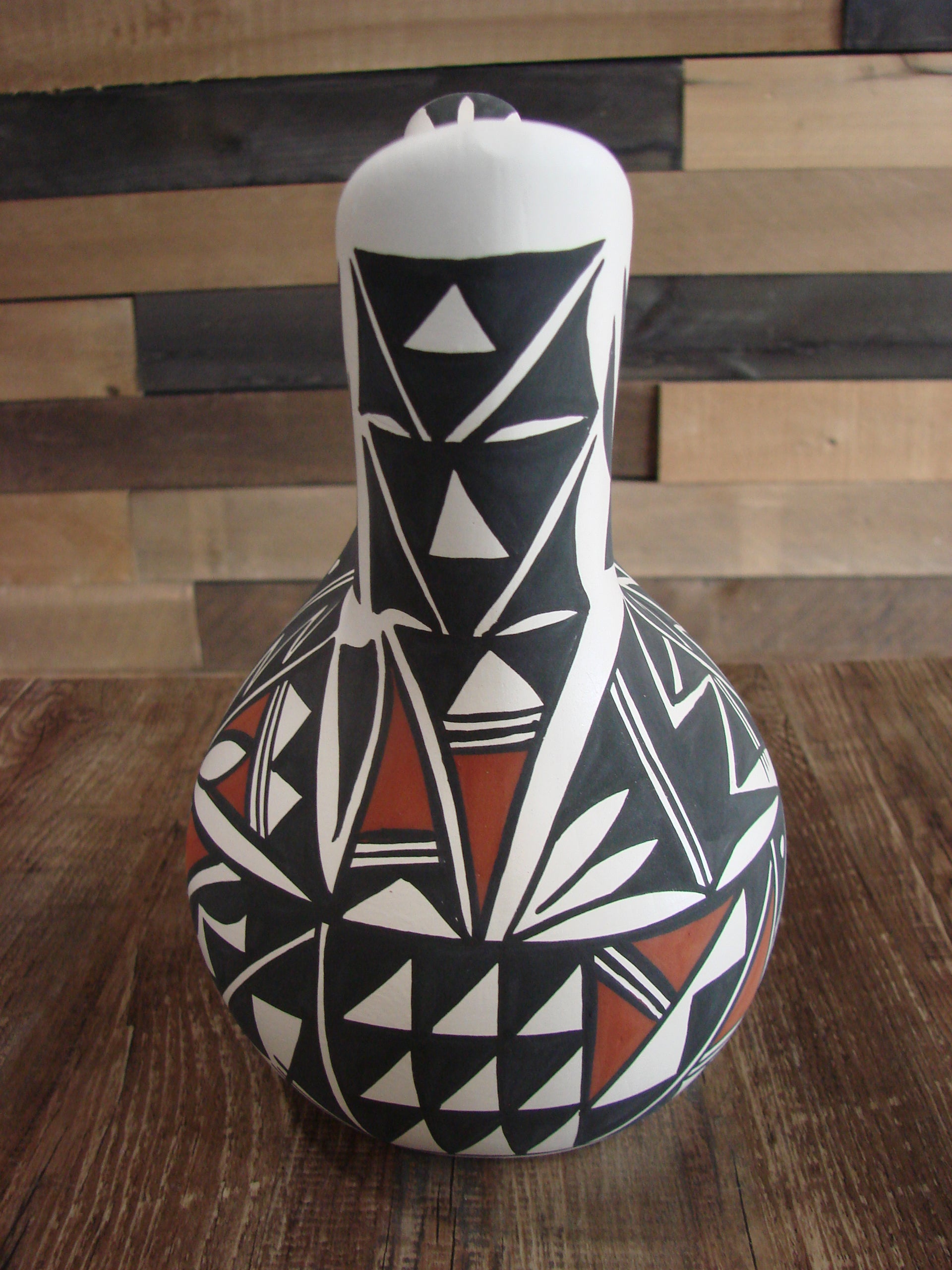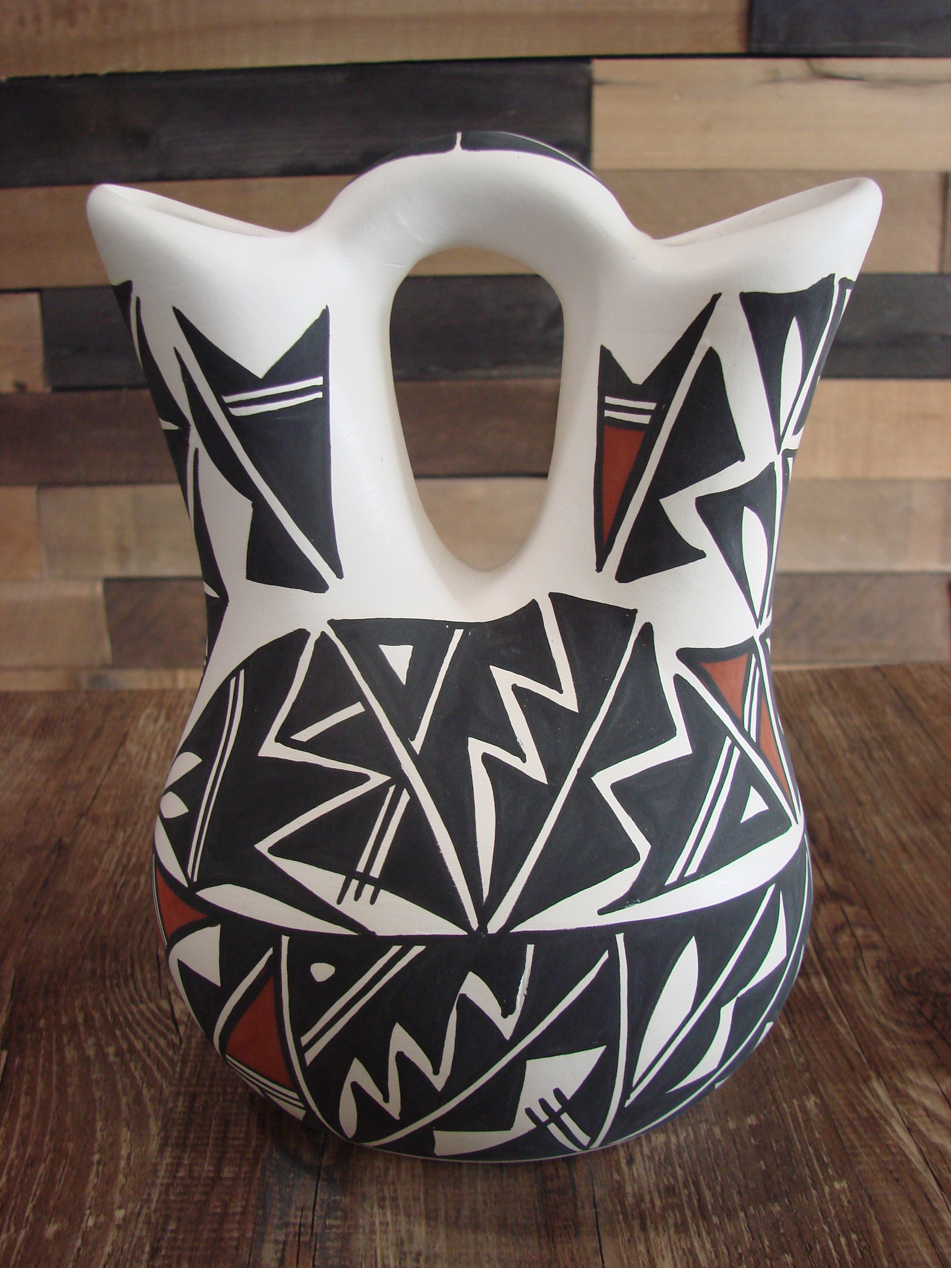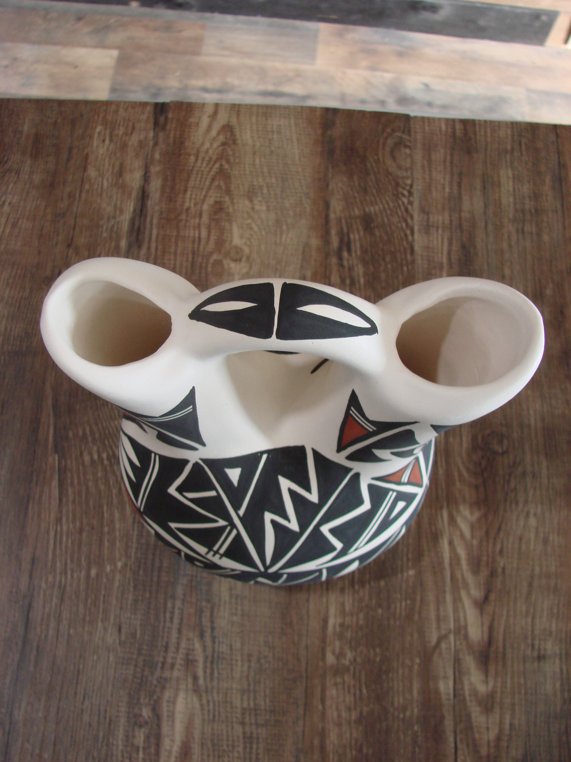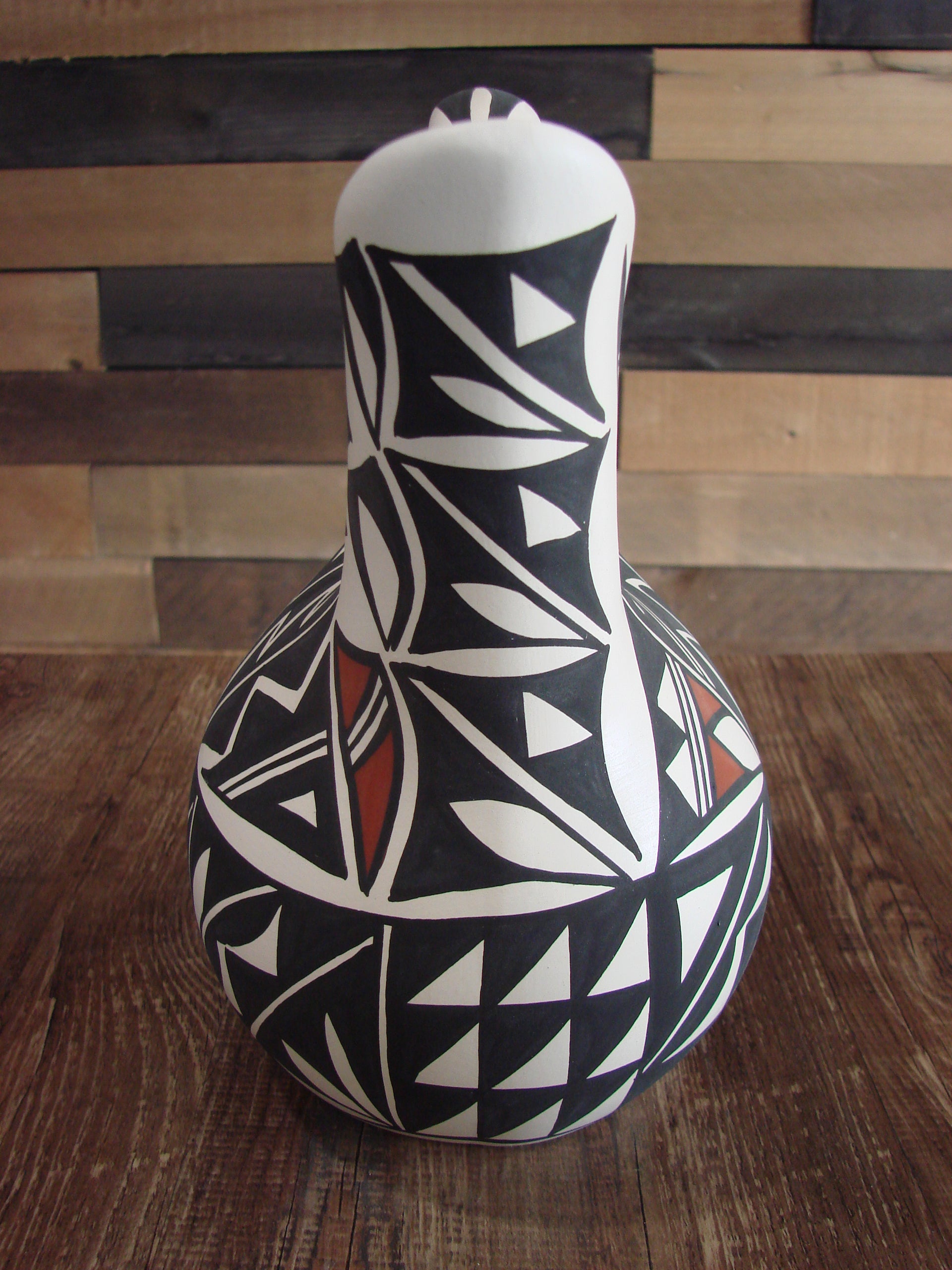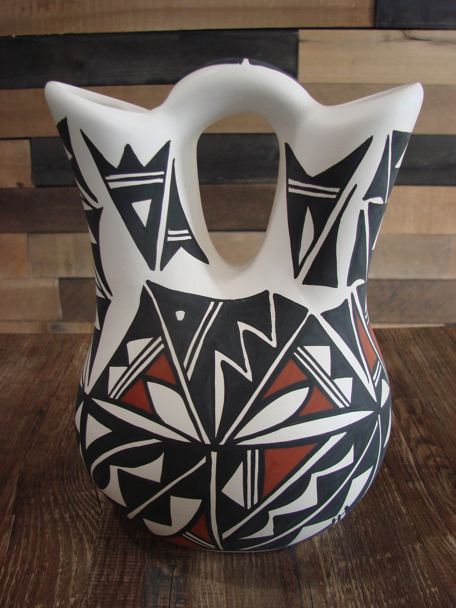 Genuine Native American Acoma Pueblo Indian Hand Painted Fine Line Wedding Vase from Western New Mexico. This Gorgeous piece of pottery features Stunning natural pigment hand painted patterns throughout. The detail is exquisite! Masterfully Hand painted by Acoma artist L. Concho. The bottom is signed "Concho Acoma NM". Free Shipping included!