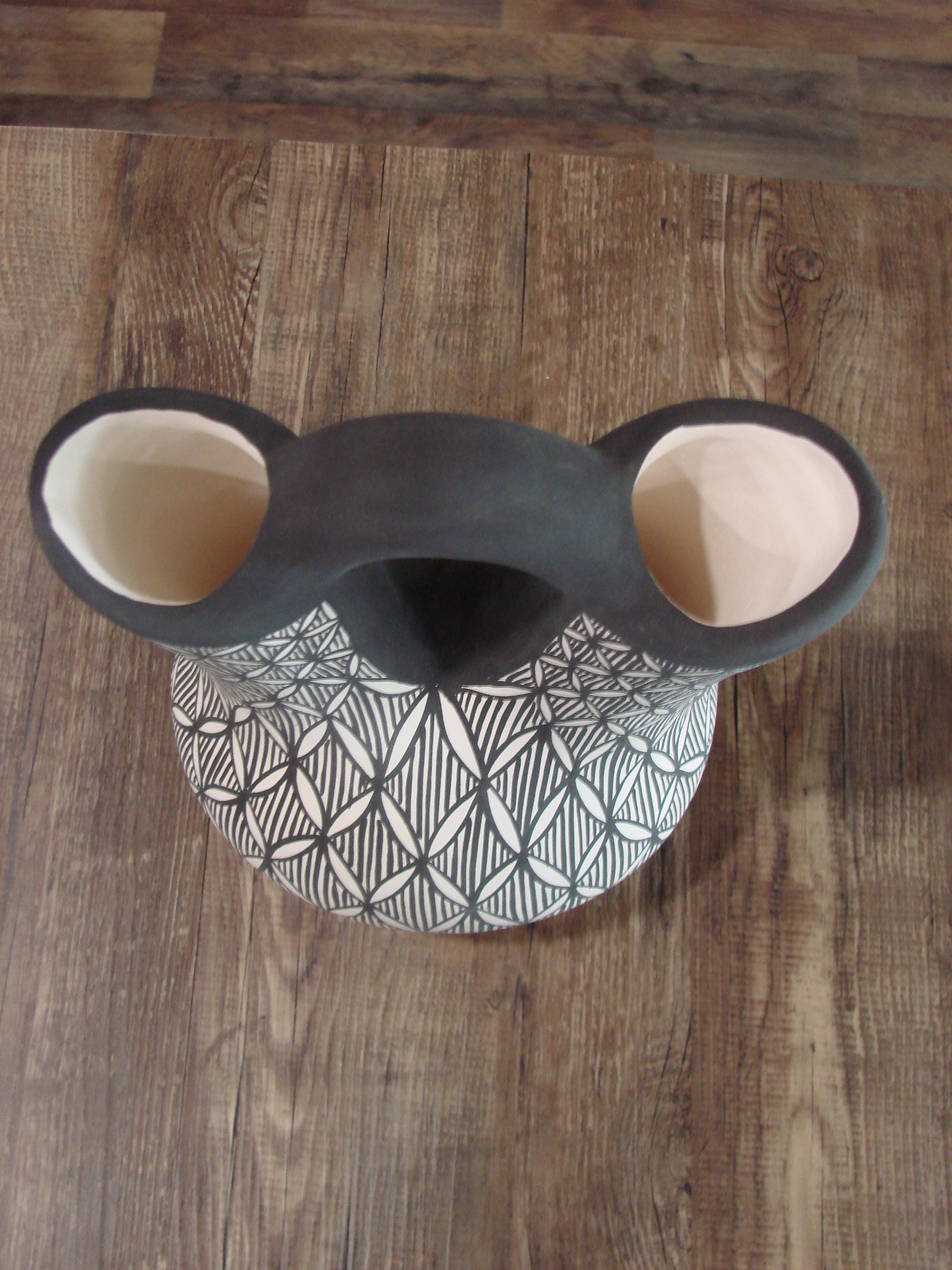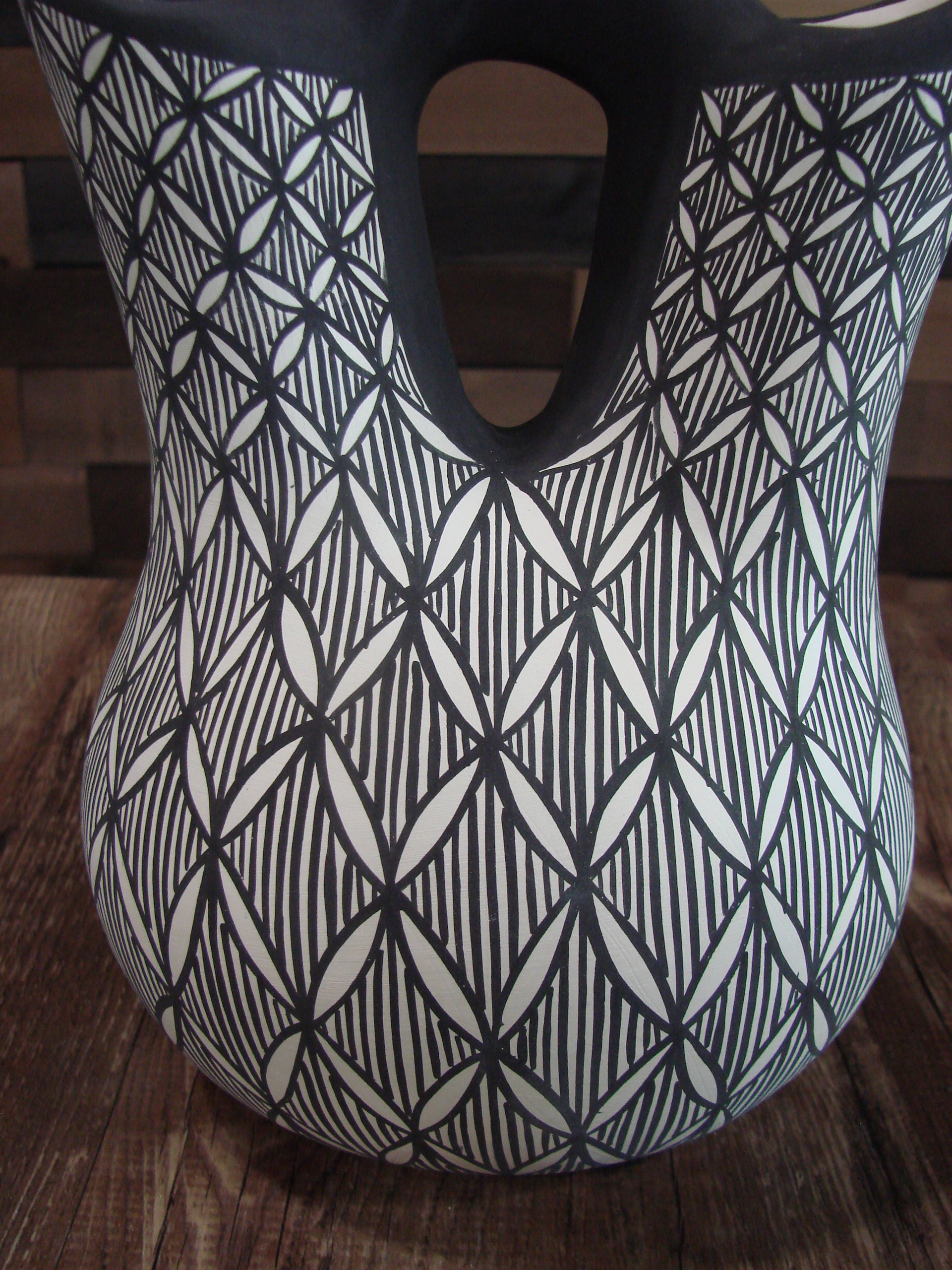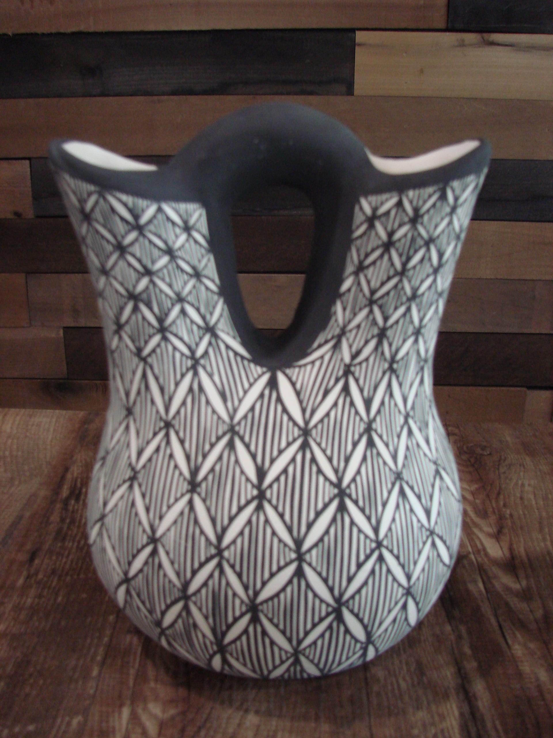 Genuine Native American Acoma/Zuni Pueblo Indian Hand Painted Fine Line Wedding Vase from Western New Mexico. This Gorgeous piece of pottery features Stunning natural pigment hand painted patterns throughout. The detail is exquisite! Masterfully Hand painted by Acoma/Zuni artist M. Lukee. The bottom is signed "M Lukee Acoma/Zuni N.M". Free Shipping included!