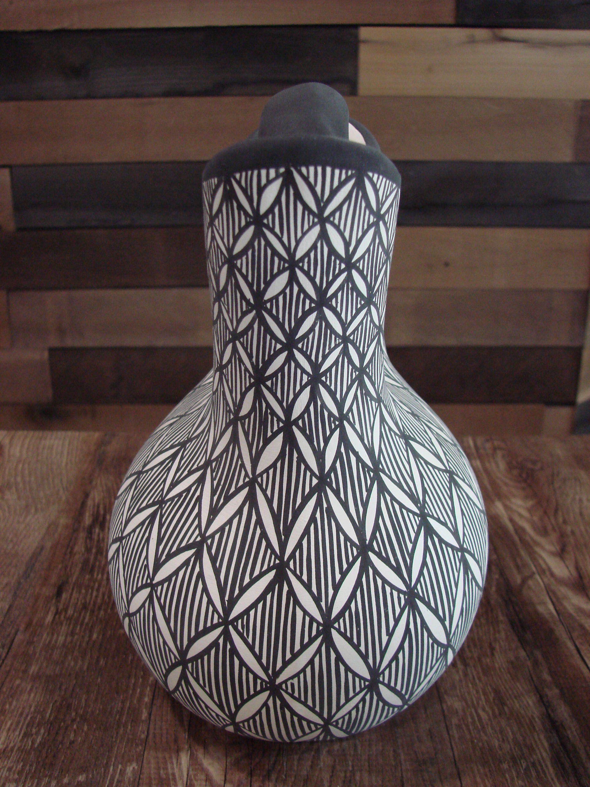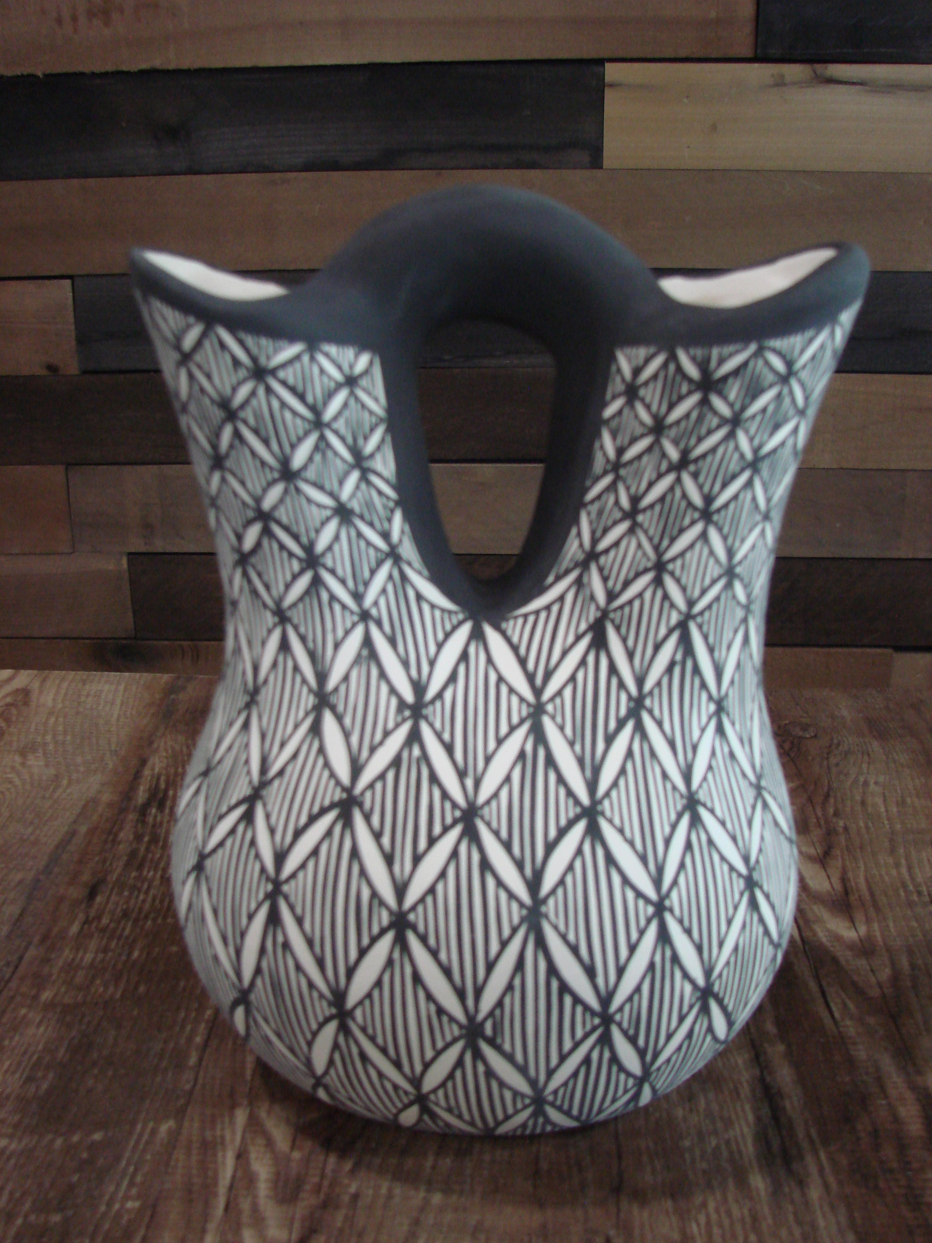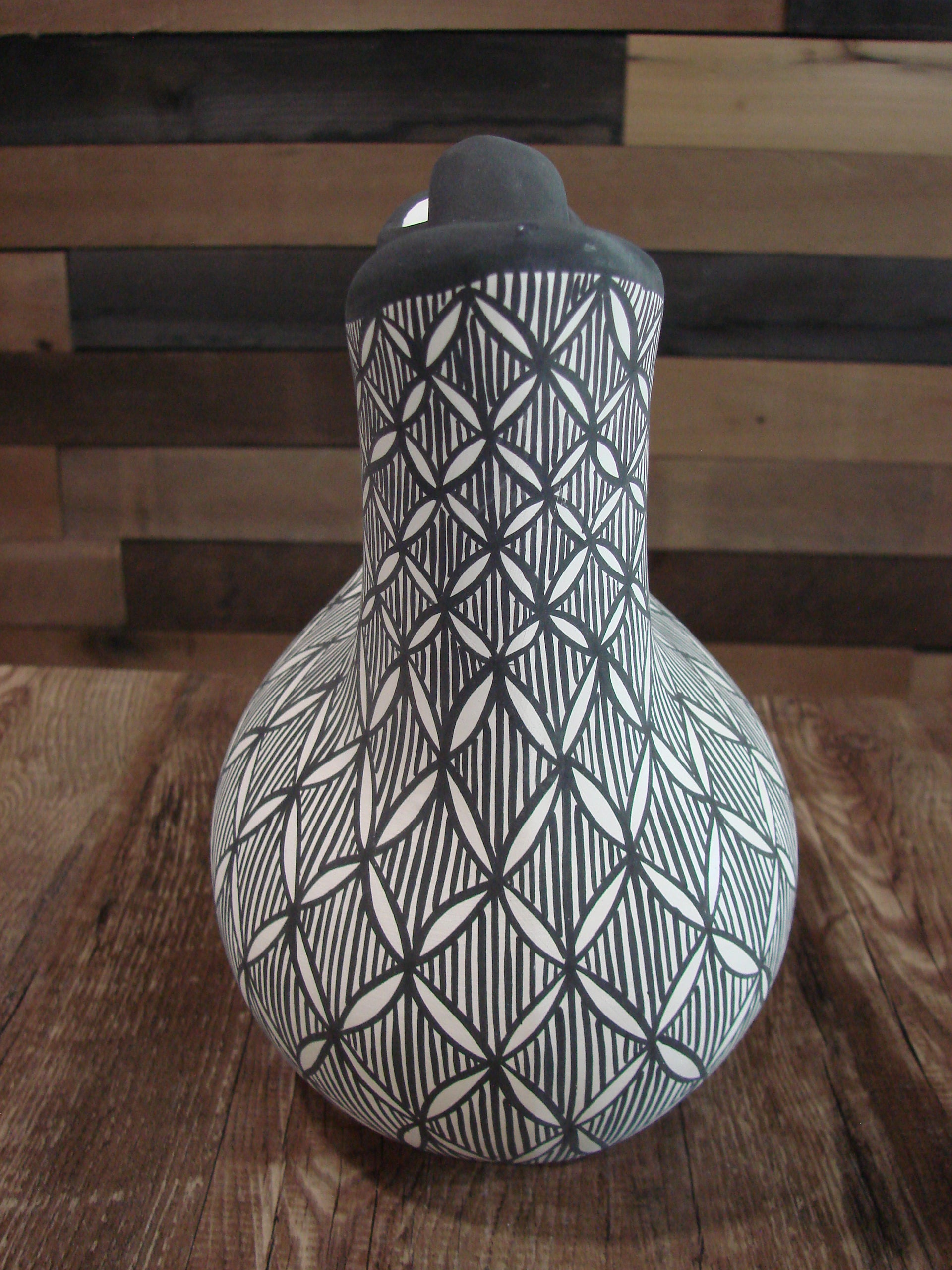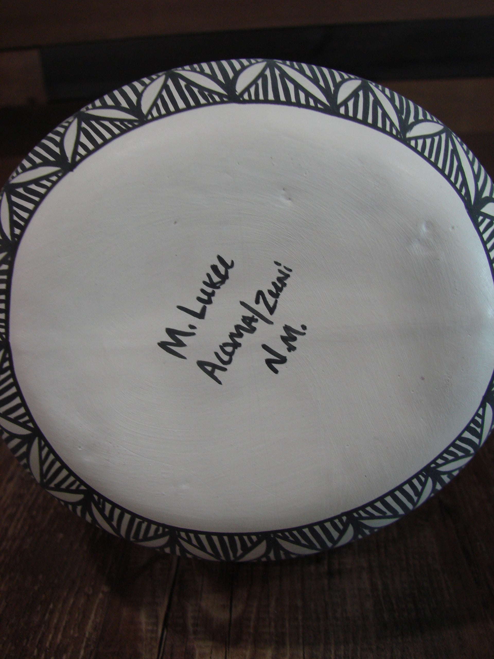 Genuine Native American Acoma/Zuni Pueblo Indian Hand Painted Fine Line Wedding Vase from Western New Mexico. This Gorgeous piece of pottery features Stunning natural pigment hand painted patterns throughout. The detail is exquisite! Masterfully Hand painted by Acoma/Zuni artist M. Lukee. The bottom is signed "M Lukee Acoma/Zuni N.M". Free Shipping included!