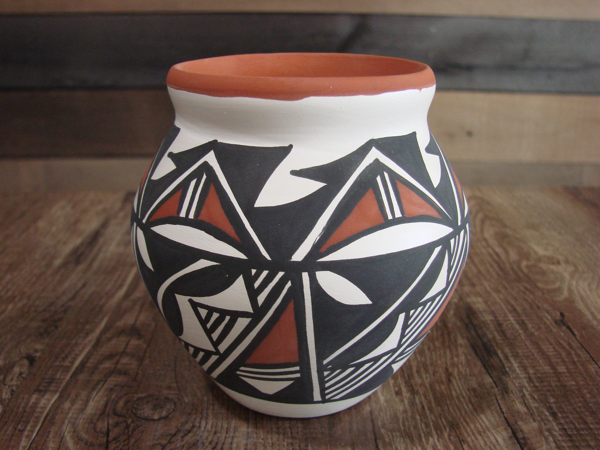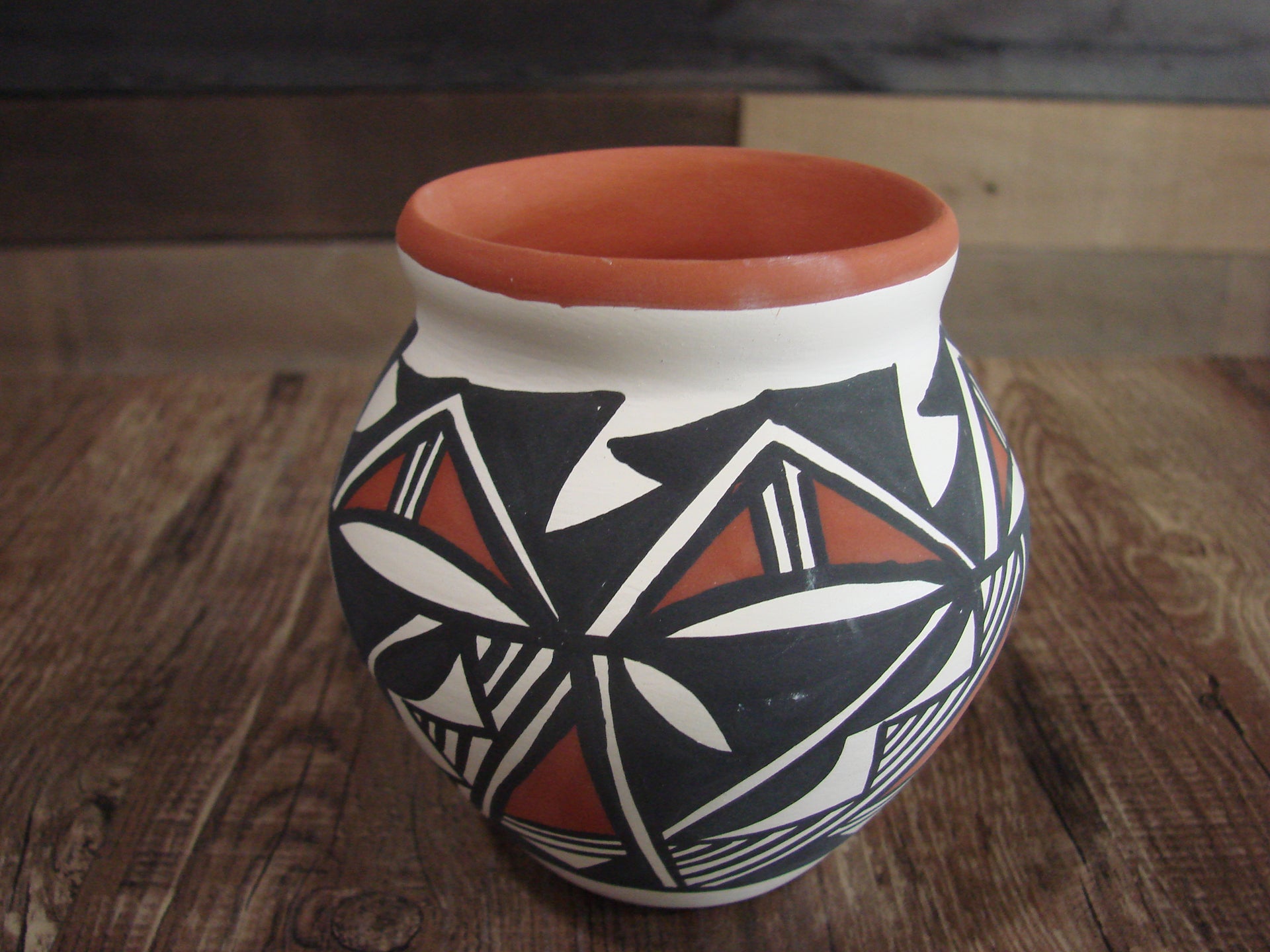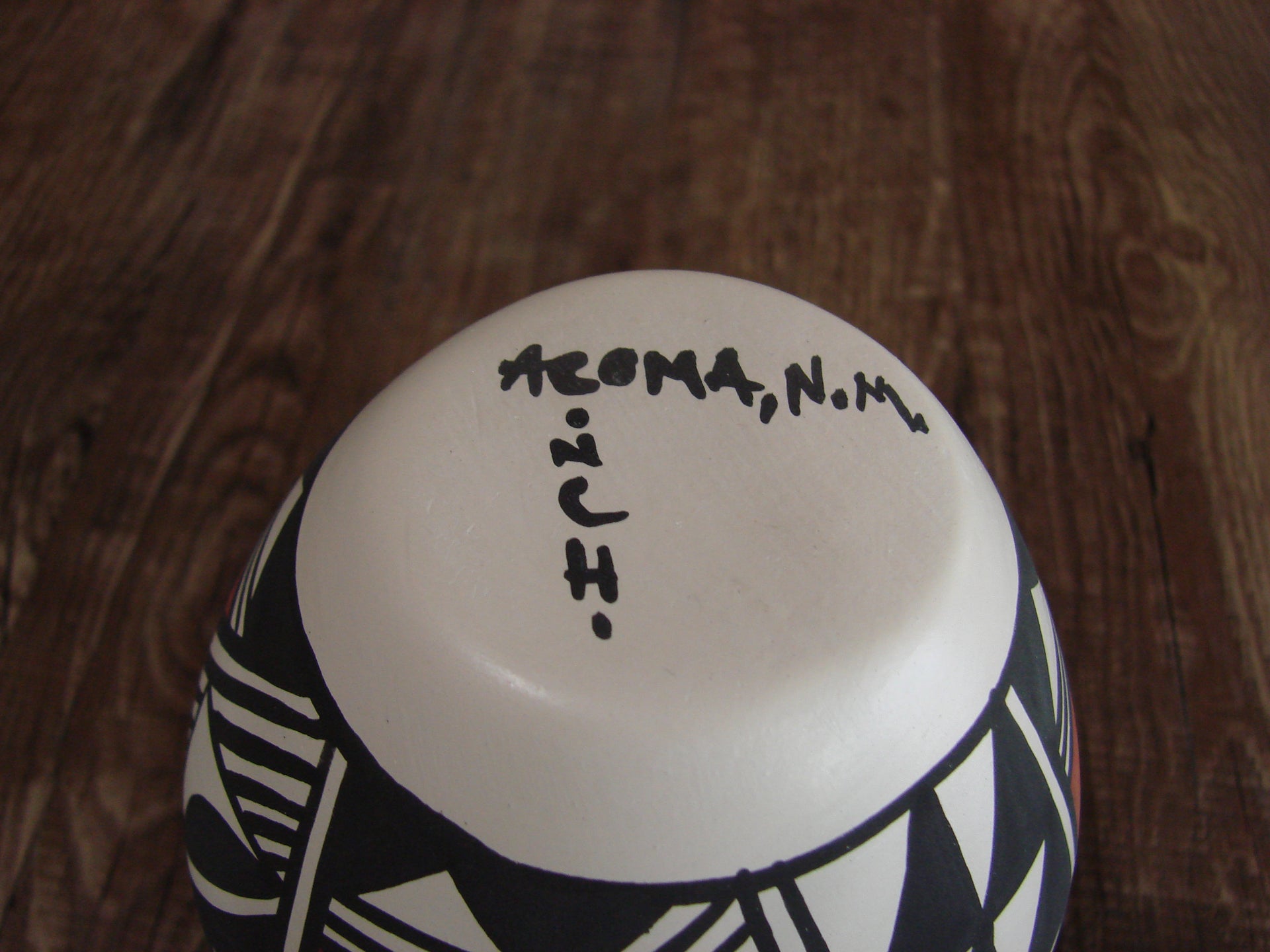 Genuine Native American Acoma Pueblo Indian Hand Painted Fine Line Pottery from Western New Mexico. This small piece of pottery features Stunning natural pigment hand painted patterns throughout. The detail is exquisite! Hand painted by Acoma artist L. Concho. The bottom is signed. Free Shipping included!