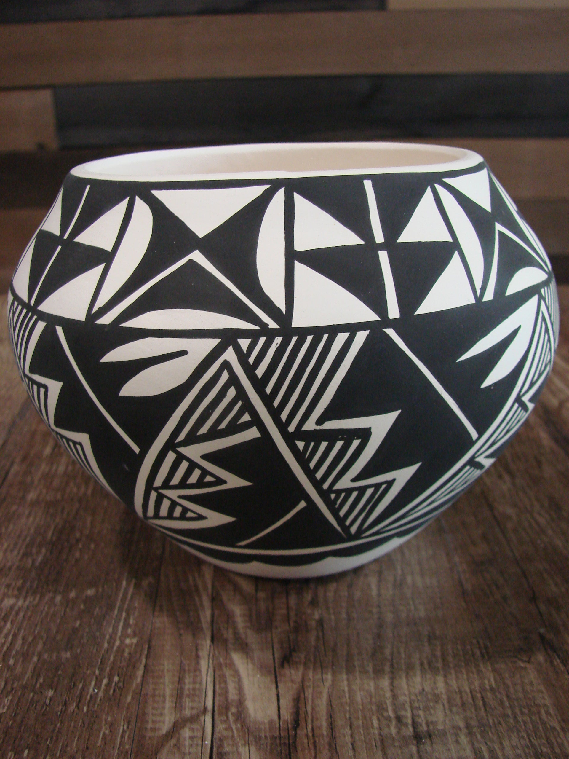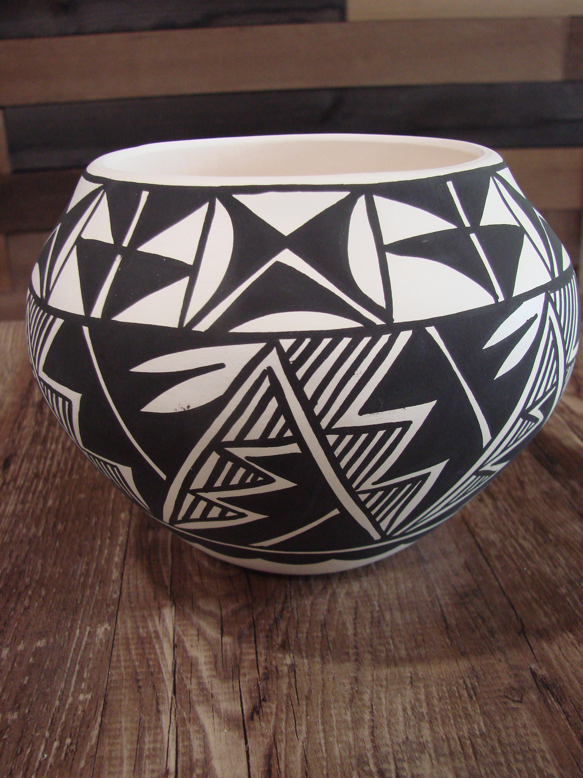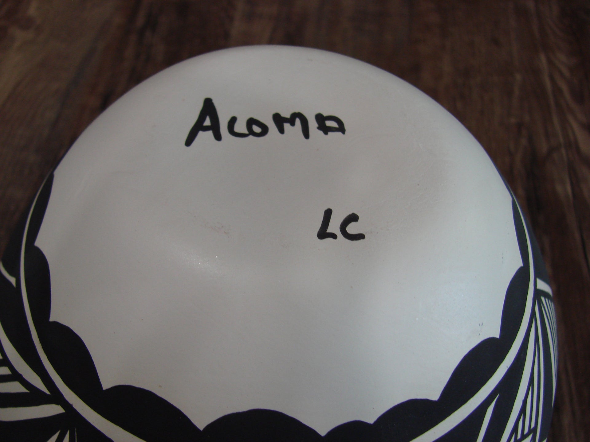 Genuine Native American Acoma Pueblo Indian Hand Painted Fine Line Pottery from Western New Mexico. This piece of pottery features Stunning natural pigment hand painted patterns throughout. The detail is exquisite! Hand painted by Acoma artist L. Concho. The bottom is signed. Free Shipping included!